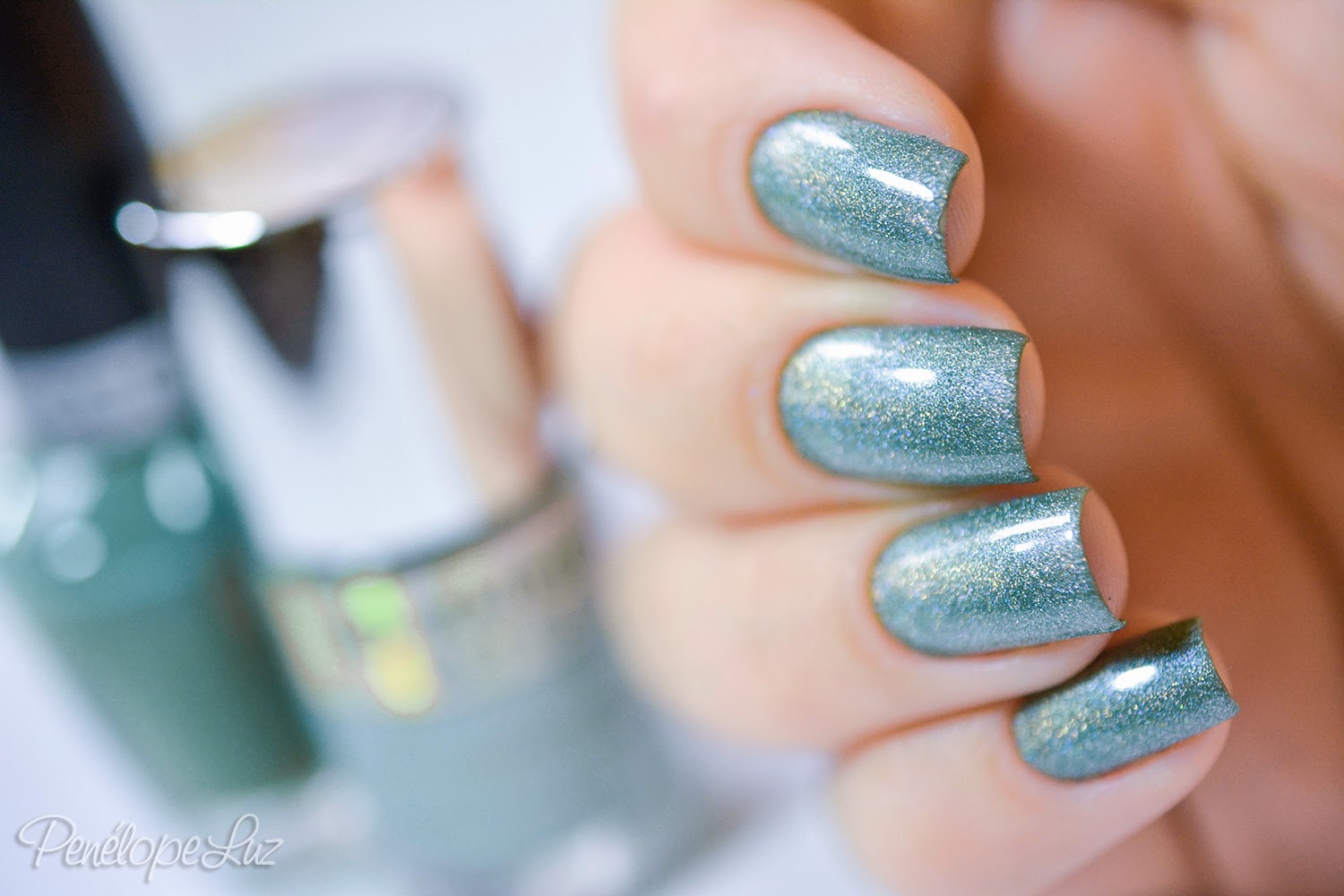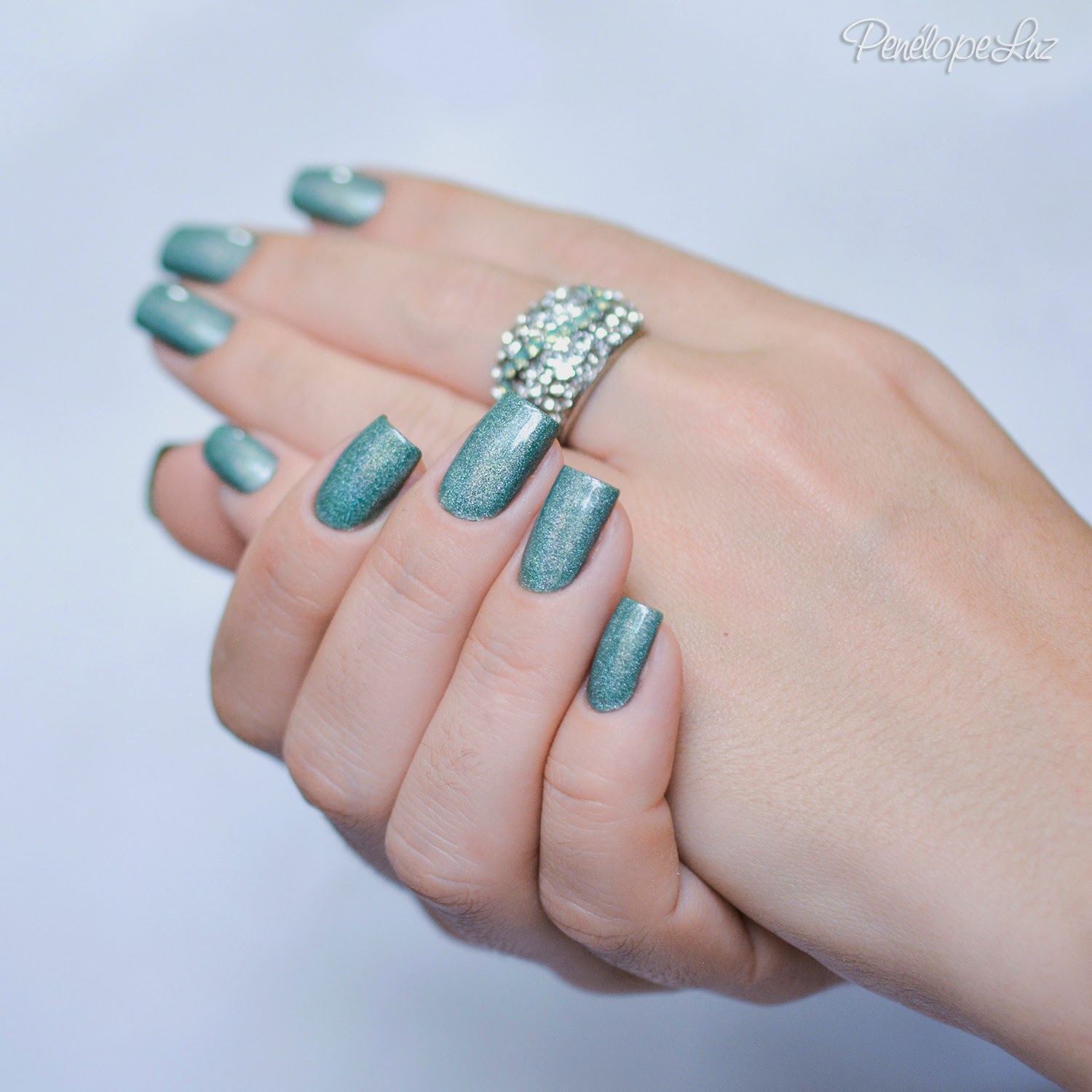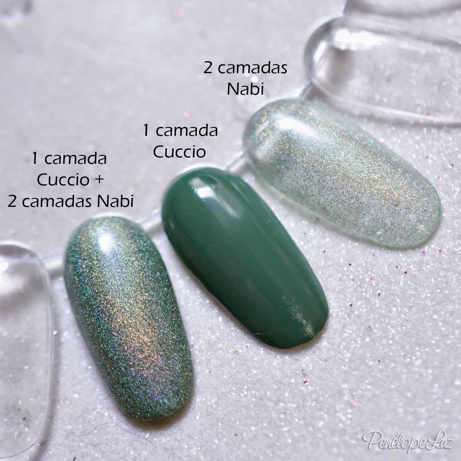 Eu queria usar o Nabi sozinho, mas ele é “infinitamente” ralo, e detesto esmalte assim – quem gosta? Ninguém, né? – Só que apesar desse defeito, ele tem aquela holografia discreta e linda, que dá profundidade a qualquer esmaltação! Pensei então que teria que combiná-lo com outro e fui procurando verdes na minha coleção, até que experimentei com o Cuccio e ficou perfeito! O Cuccio é muito pigmentado, então coloquei uma camada dele e 2 do Nabi. Para vocês verem melhor, vejam como duas camadas do Nabi fica muito ralo! Para cobrir só com umas 5 camadas ou mais.