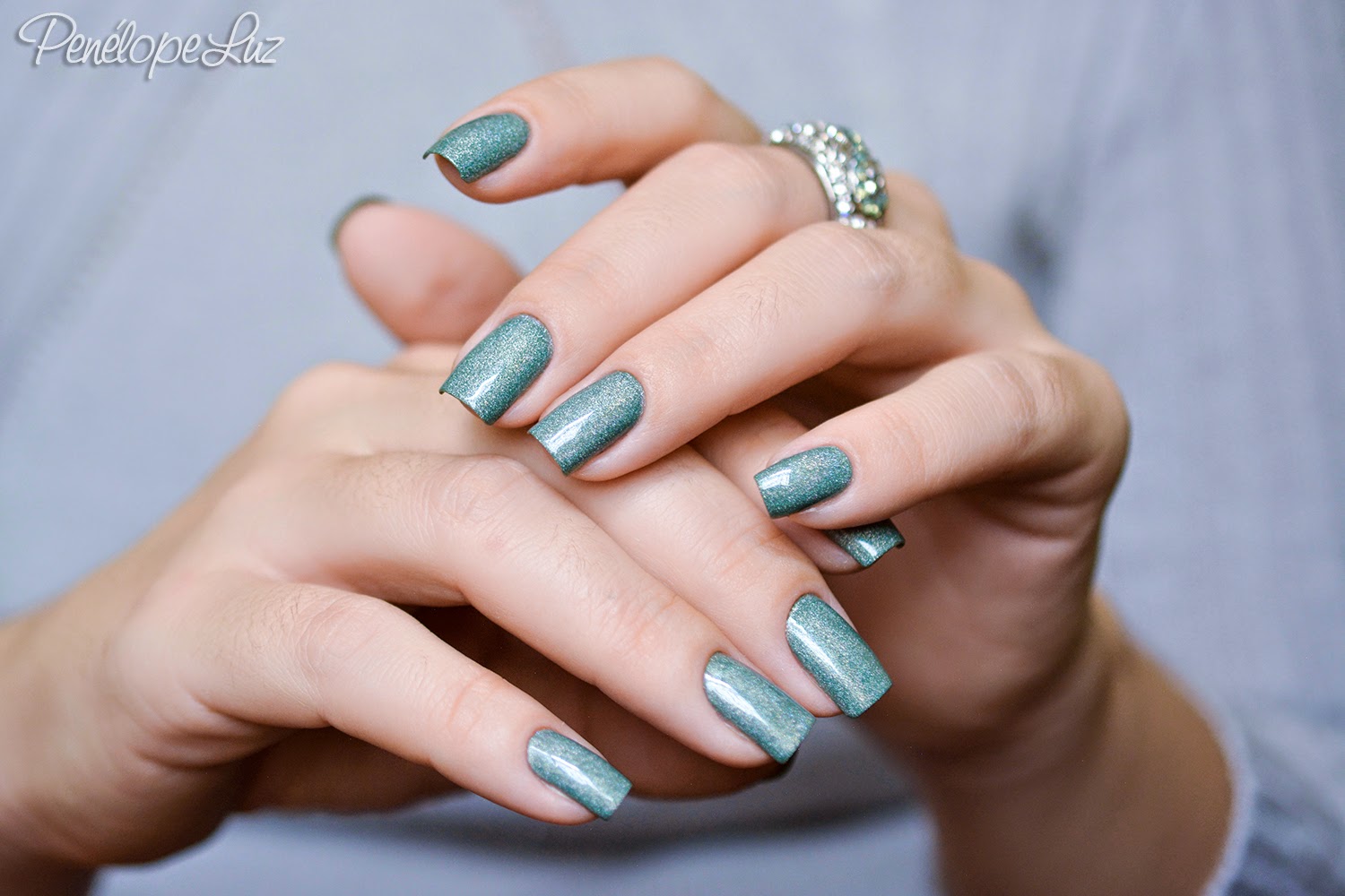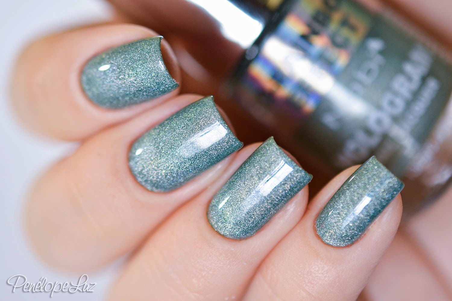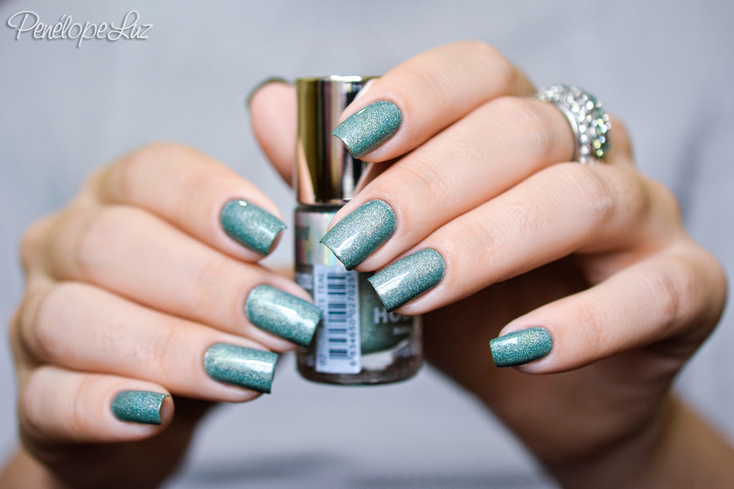 Eu queria usar o Nabi sozinho, mas ele é “infinitamente” ralo, e detesto esmalte assim – quem gosta? Ninguém, né? – Só que apesar desse defeito, ele tem aquela holografia discreta e linda, que dá profundidade a qualquer esmaltação! Pensei então que teria que combiná-lo com outro e fui procurando verdes na minha coleção, até que experimentei com o Cuccio e ficou perfeito! O Cuccio é muito pigmentado, então coloquei uma camada dele e 2 do Nabi. Para vocês verem melhor, vejam como duas camadas do Nabi fica muito ralo! Para cobrir só com umas 5 camadas ou mais.