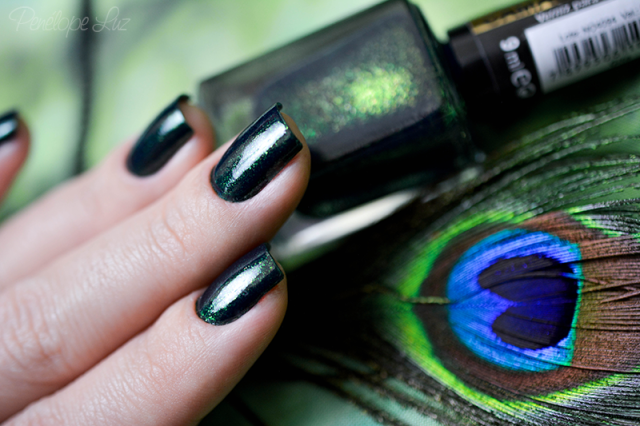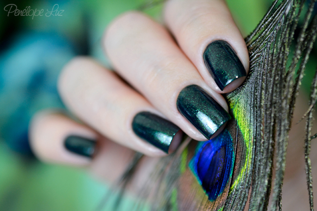 O escolhido foi um que descobri essa semana e me encantei, o Gita da La Femme. Que esmalte lindo, gente! Ele é verde bem escuro e cheio de floquinhos dourados!