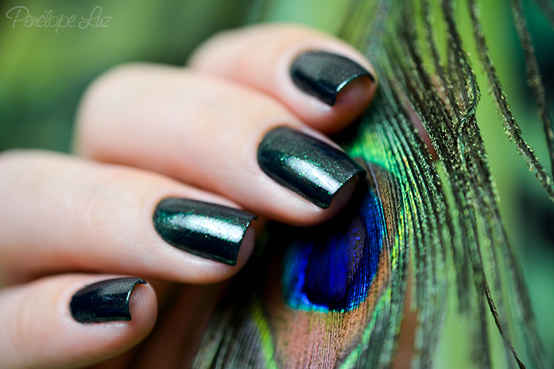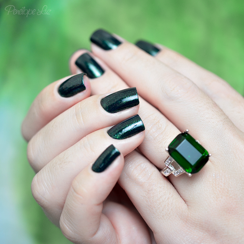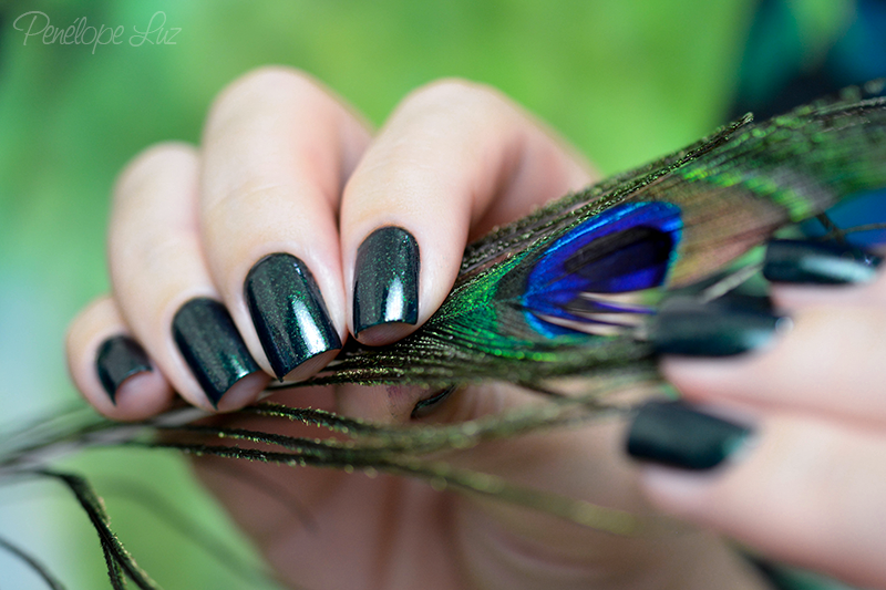 O escolhido foi um que descobri essa semana e me encantei, o Gita da La Femme. Que esmalte lindo, gente! Ele é verde bem escuro e cheio de floquinhos dourados!