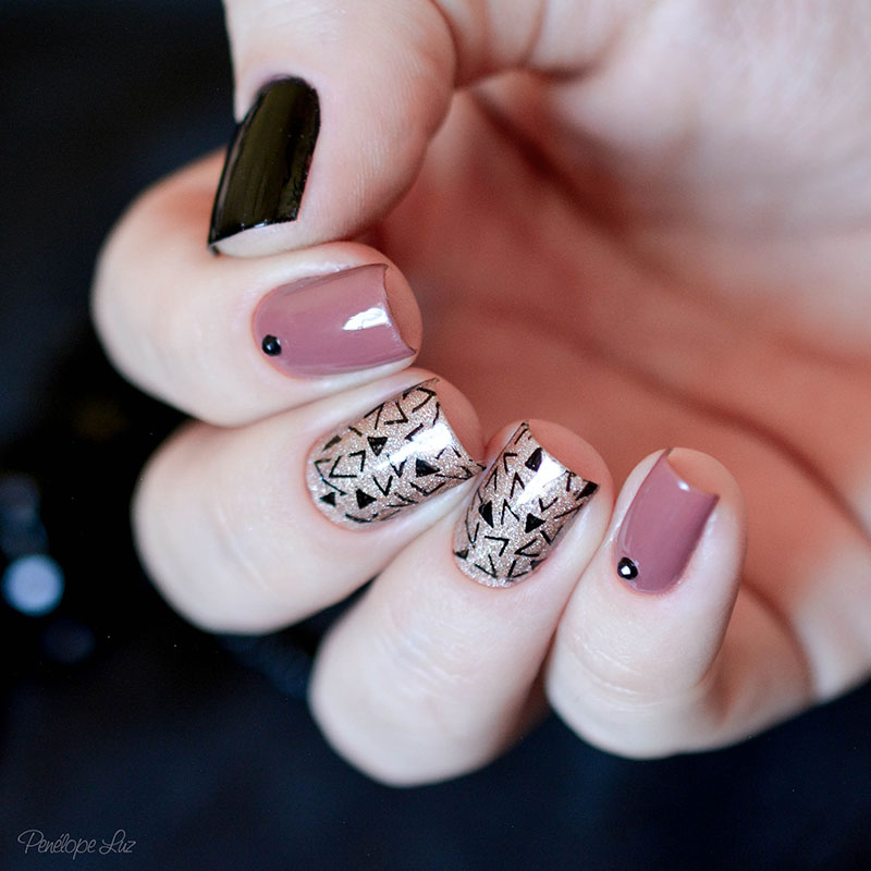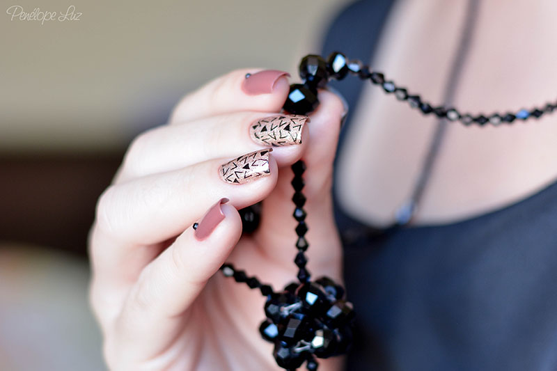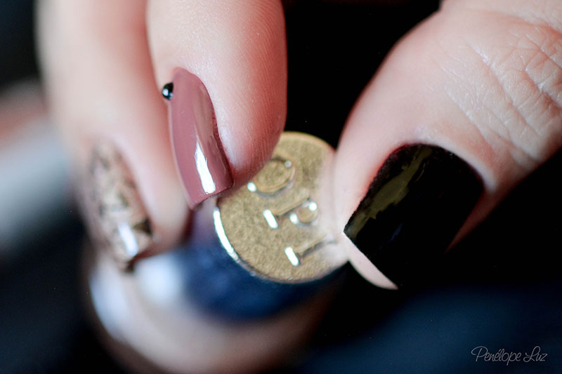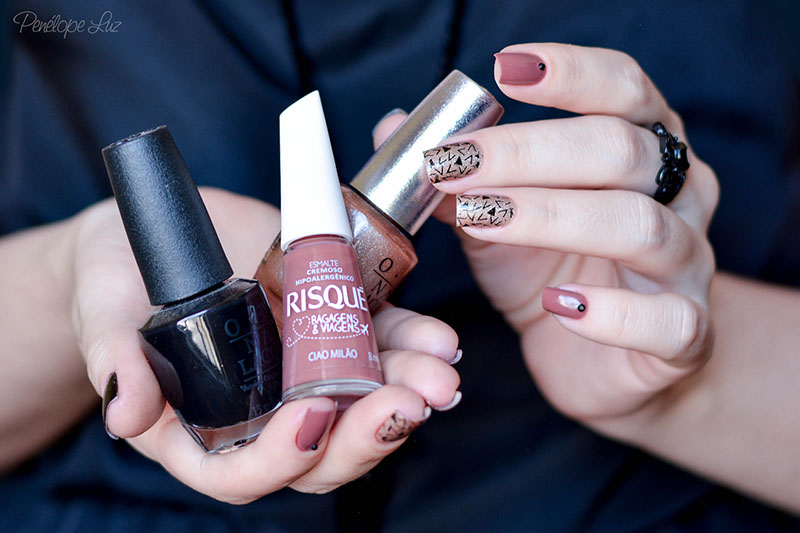 O Ciao Milão tem uma qualidade muito boa, realmente como ouvi de várias amigas, a qualidade dos esmaltes da Risqué melhorou bastante! Não fica atrás de importados como Essie, China Glaze, OPI, Kiko, etc. Passei duas camadas o Ciao Milão e então passei o DS Classic que é lindíssimo! Também usei duas camadas do OPI e duas do Preto da Impala no dedão. Carimbei usando a plaquinha Pueen 05 com o Preto para Carimbo da Blant Colors, e finalizei colocando uma bolotinha de nail art nas unhas que estavam com o Risqué.