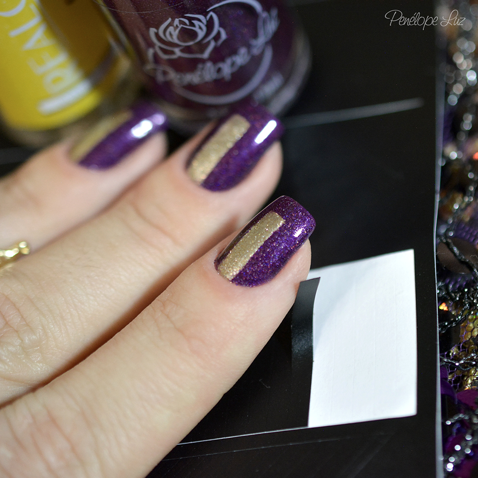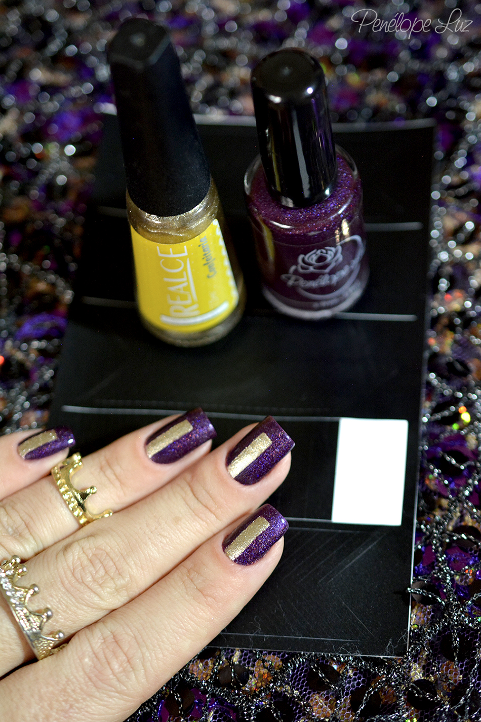 Primeiro esmaltei com o Glacê Real da Realce, que é um dourado lindo e ótimo. Ficou perfeito com duas camadas e 20 minutos depois de esmaltar, já estava seco suficiente para a tape! Muito amor! ❤