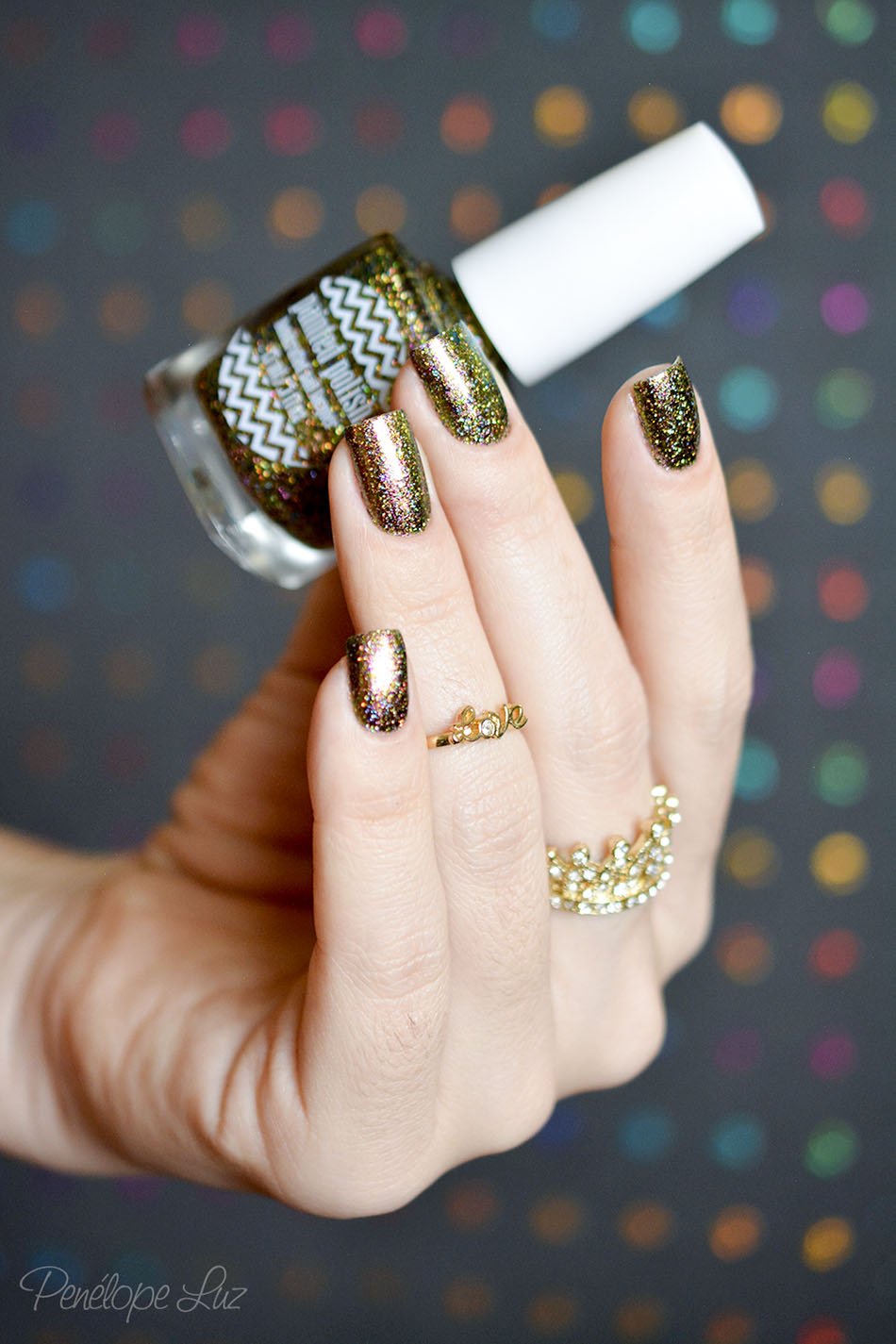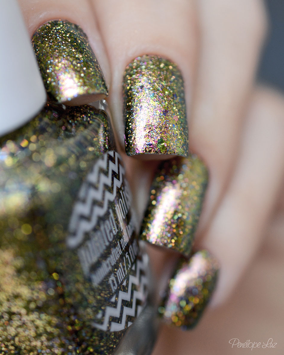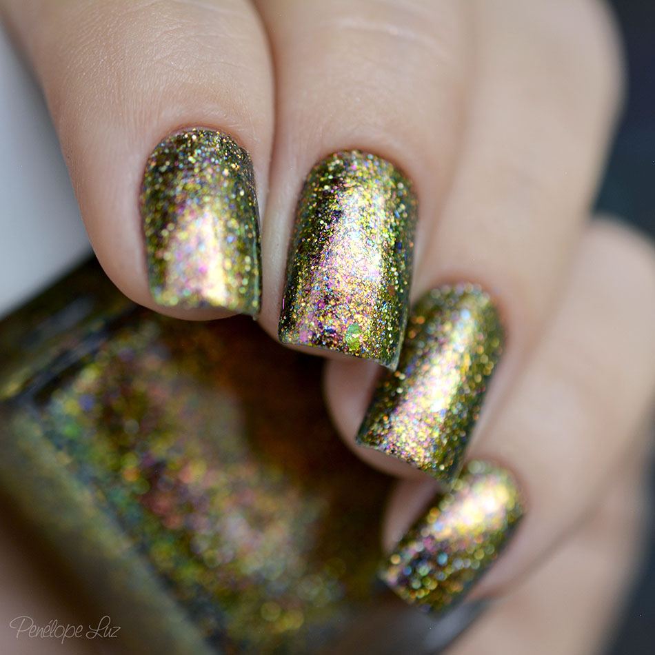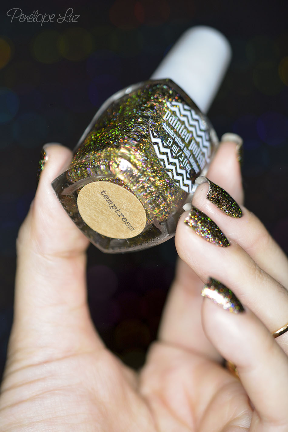 Lindo demais, né? Ele é composto por micro flakies multichromes (diferentes daqueles da ILNP. Esses do Temptress são menores e cobrem mais a unha) e glitters holográficos de luxo, que não fazem relevo. E aí como estou sempre pegando orçamento de matéria-prima, vou usar o esmalte e só penso na fortuna que é o custo dele (acaba o glamour de só usar sem pensar em nada hahaha), duas matérias-primas caríssimas! Então os $13 que ele custa são super justos, especialmente por causa da concentração, quase cobre com uma camada! Vejo alguns indies gringos que custam esse mesmo preço e até mais, mas usam material barato. Só pra vocês verem, os PL custam hoje em torno de $5,5 (pra cliente final, porque pra nós é menos) na cotação atual do dólar, tenho um custo adcional (além do material e da mão de obra) beeem mais alto que elas, porque pagamos toda a burocracia que elas não pagam. É verdade que temos um lucro muito baixo (porque infelizmente aqui no Brasil todo mundo quer produto com qualidade de importado americano e europeu, mas só quer pagar o preço do importado da China e Paraguai, além de não valorizarem o trabalho artístico e artesanal, como se fosse safadeza cobrar pela criatividade e pelo trabalho manual) e mesmo assim conseguimos sobreviver no mercado brasileiro (quase um milagre), fazendo malabarismos com matéria-prima e com fornecedores, ficando sempre apertados de grana, mas conseguimos. Então quando vejo um indie gringo com preço justo, não penso duas vezes, compro sem dó! Super valorizo, porque sei tudo que está por trás, especialmente a diferença gritante entre as matérias-primas (um pigmento de luxo dos que usamos nos indies, chegam a custar 10 vezes mais que um pigmento cremoso usado no esmalte industrializado (isso os de melhor qualidade). Esses flakies aí – e os pigmentos multichromes – custam mais ou menos 100 vezes mais – os pra uso cosmético, porque tem uns que custam barato, mas não é pra cosmético e mesmo assim alguns usam no esmalte, daí cobram mais barato e ficam com fama de honestos, quando é ao contrário…) e o imenso trabalho para desenvolver e fabricar. Esse aí vale cada centavinho em todos os aspectos! Super vale à pena, mesmo com o dolar alto! Melhor que comprar um cremoso da Chanel ou Dior, que é mais caro até e não tem essa beleza toda. Queria conseguir comprar toda essa coleção! ❤