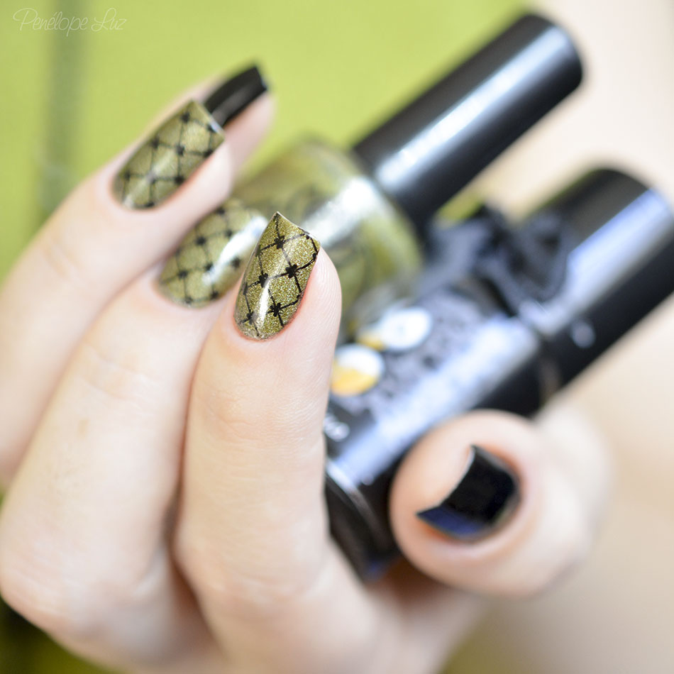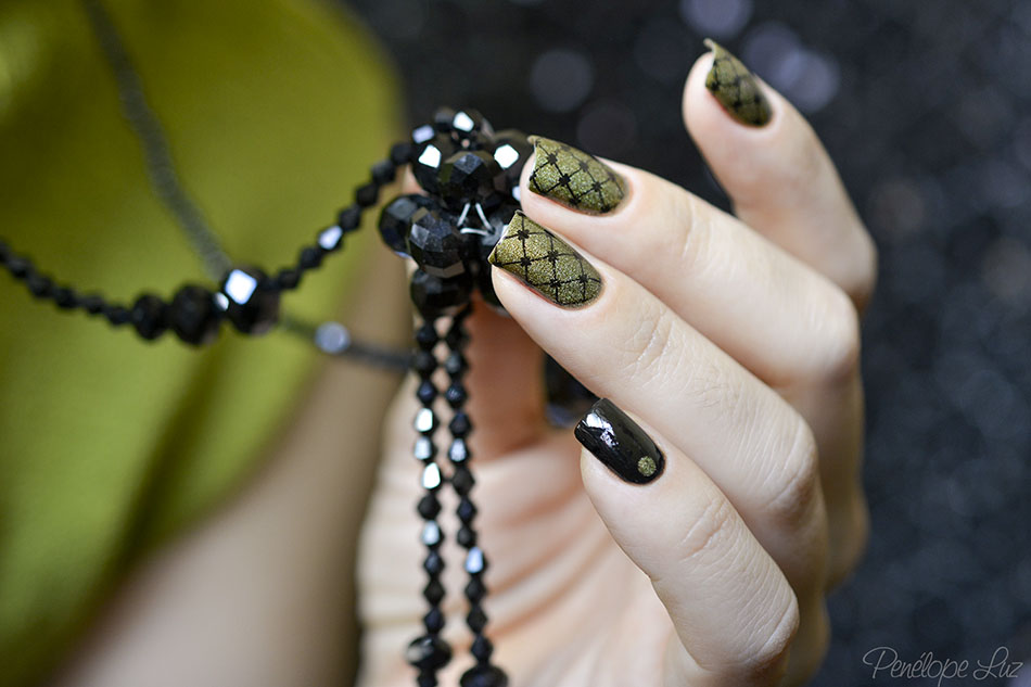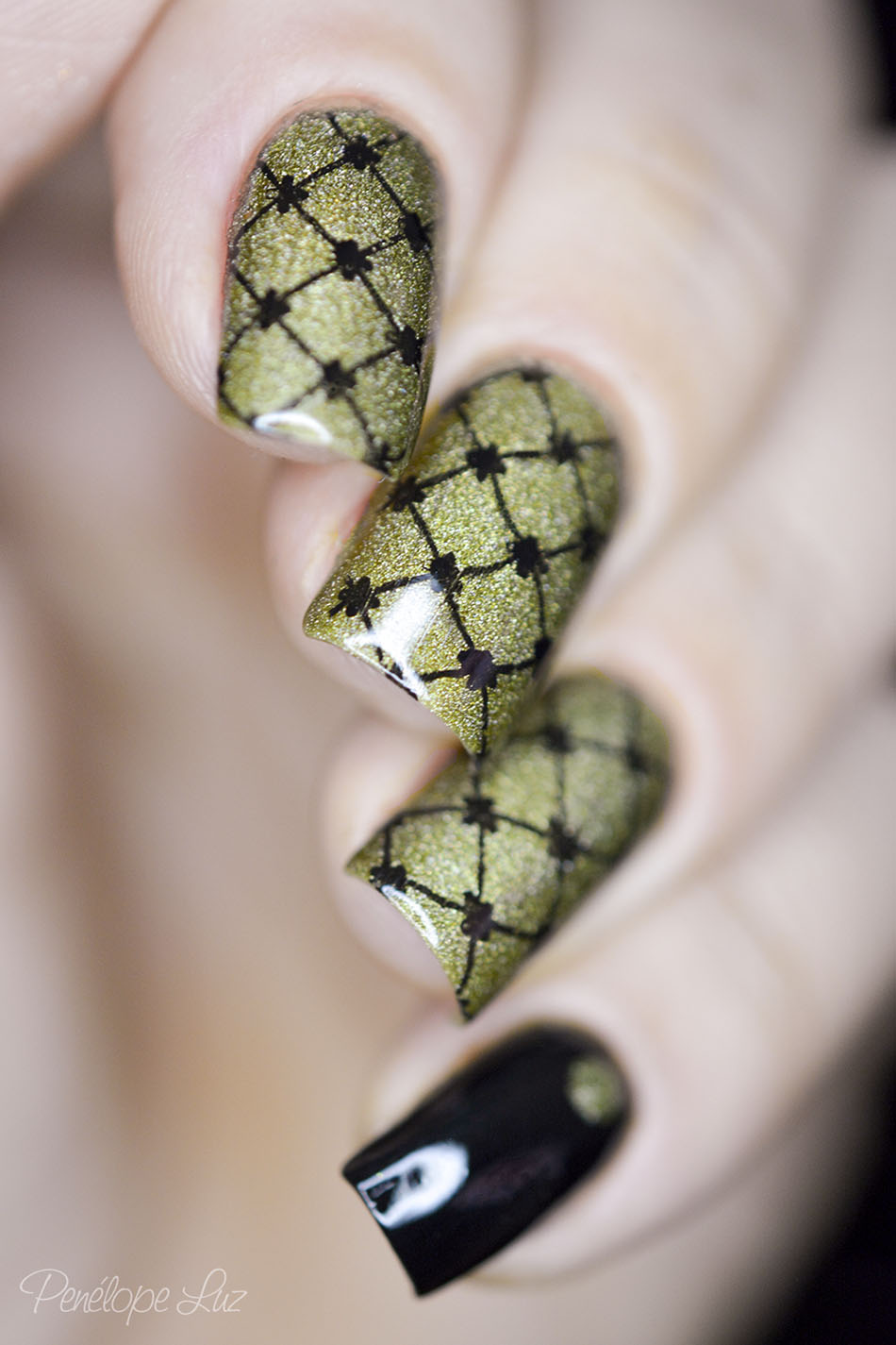 Amei demais essa mani! Passei duas camadas do Daphne, uma do Pinguino no dedão e dedinho, e carimbei com o Pinguino também usando a plaquinha Gothic Collection – 05 da Moyou. Finalizei com uma camada de Poshé e me arrependi, porque encolheu o esmalte. 😦