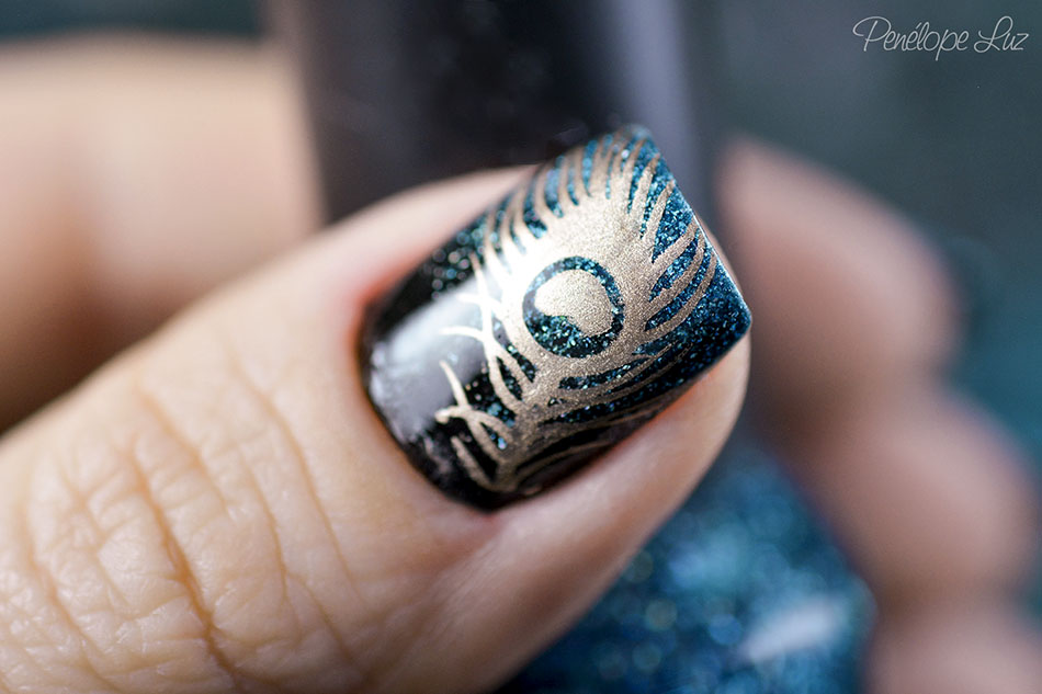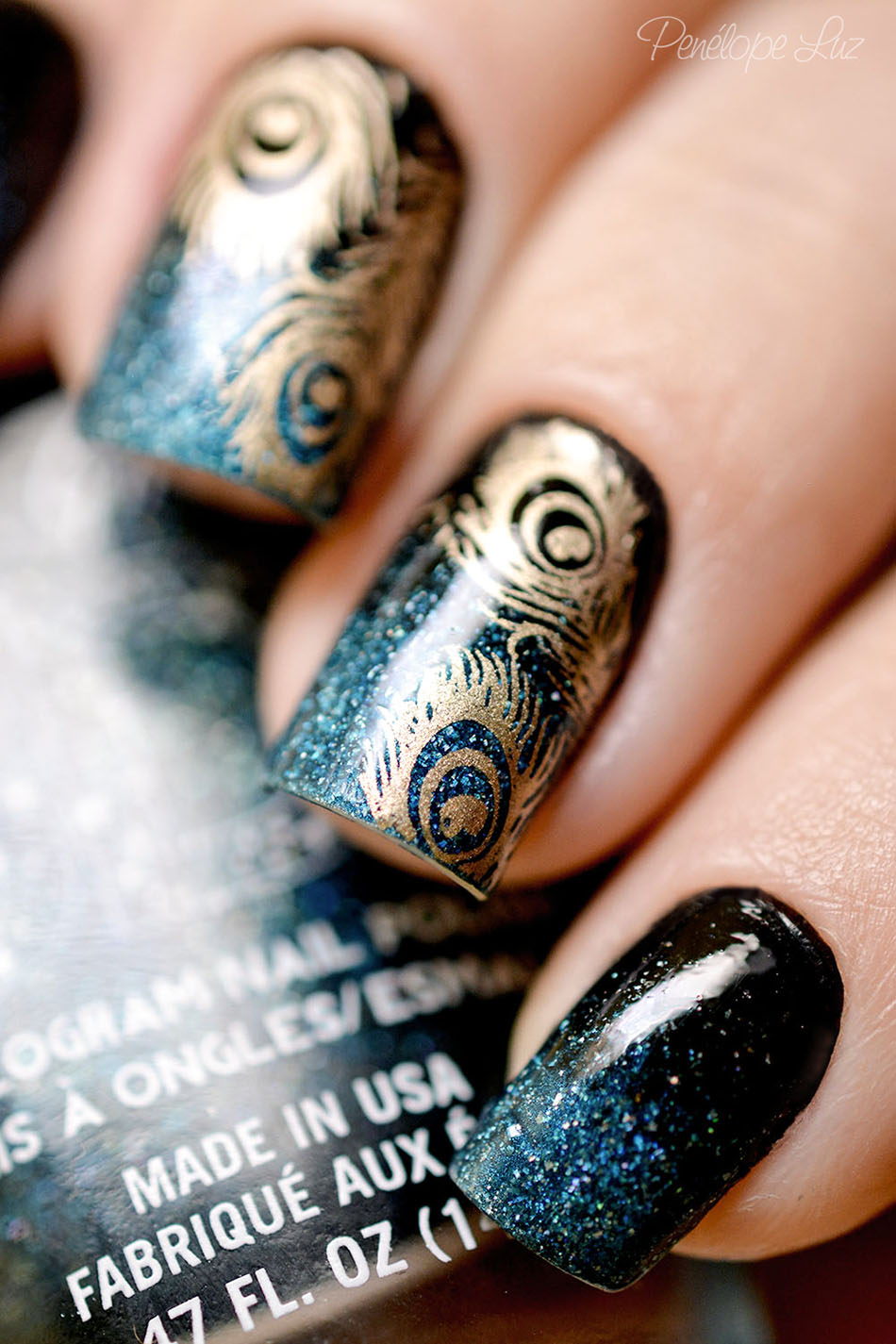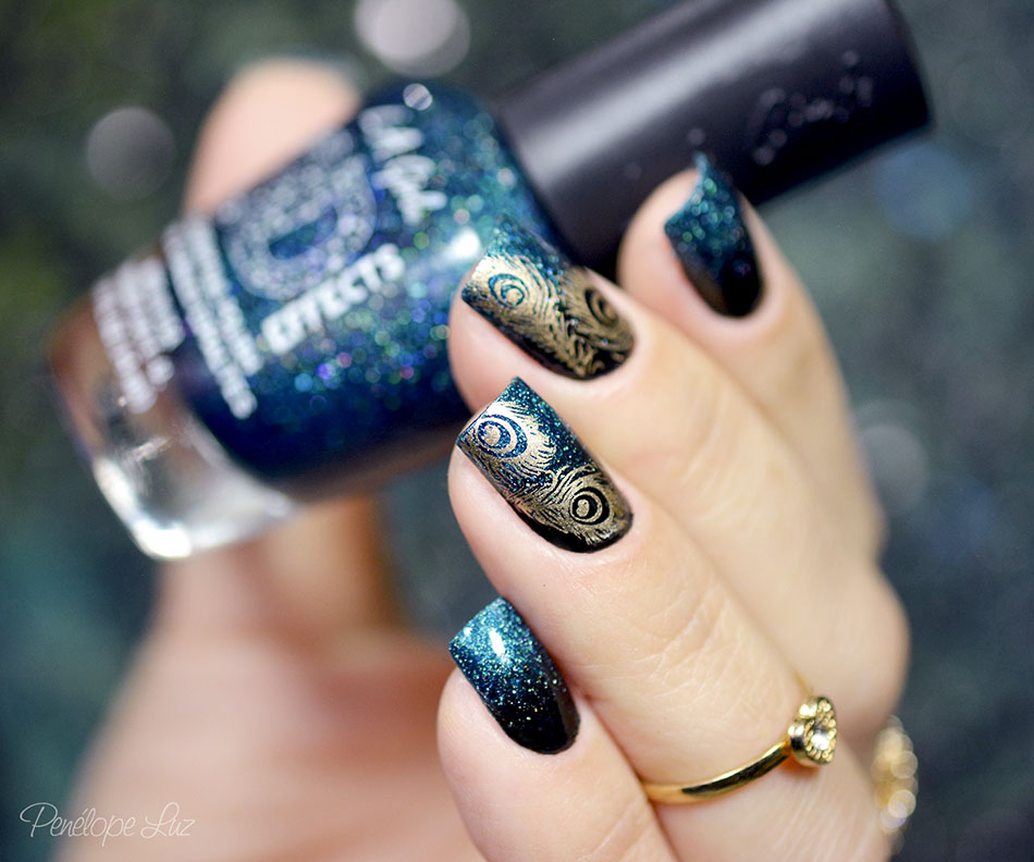 Escolhi duas plaquinhas, a NC 01 pra carimbar o dedão e a Moyou Pro Collection 03 pra carimbar anelar e médio. Usei o Passion da China Glaze, meu dourado favorito pra carimbar! Amei o resultado! ❤