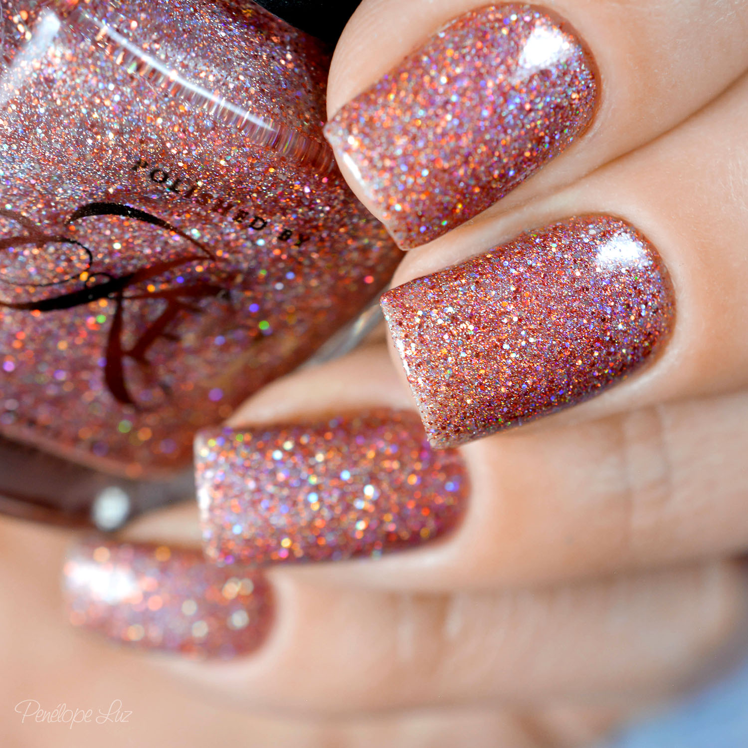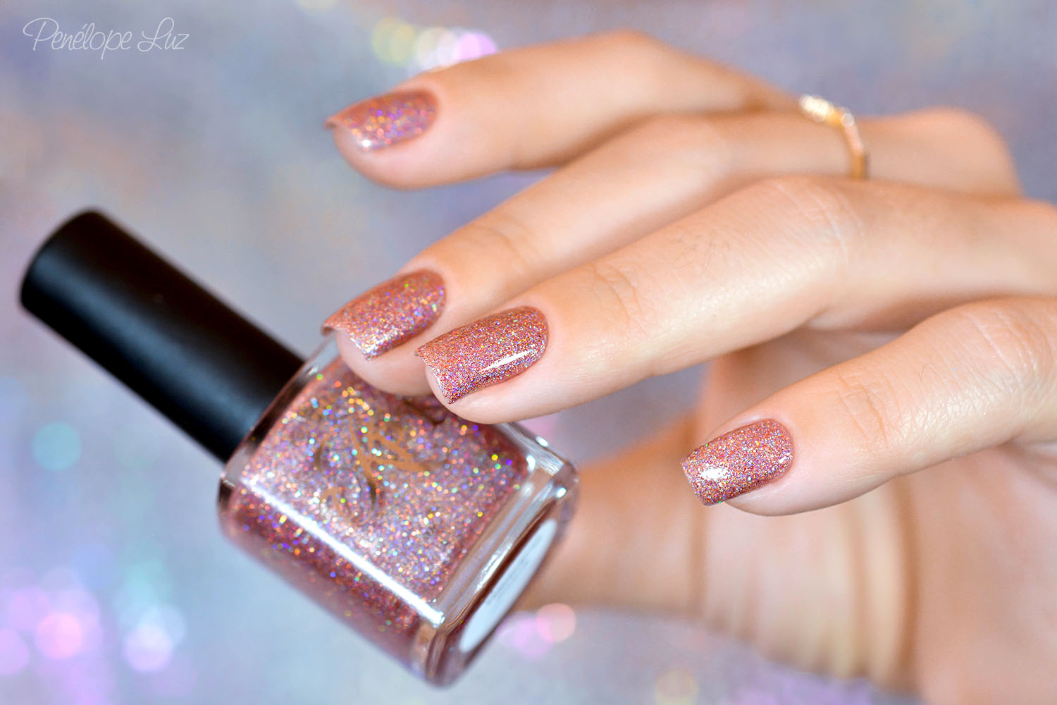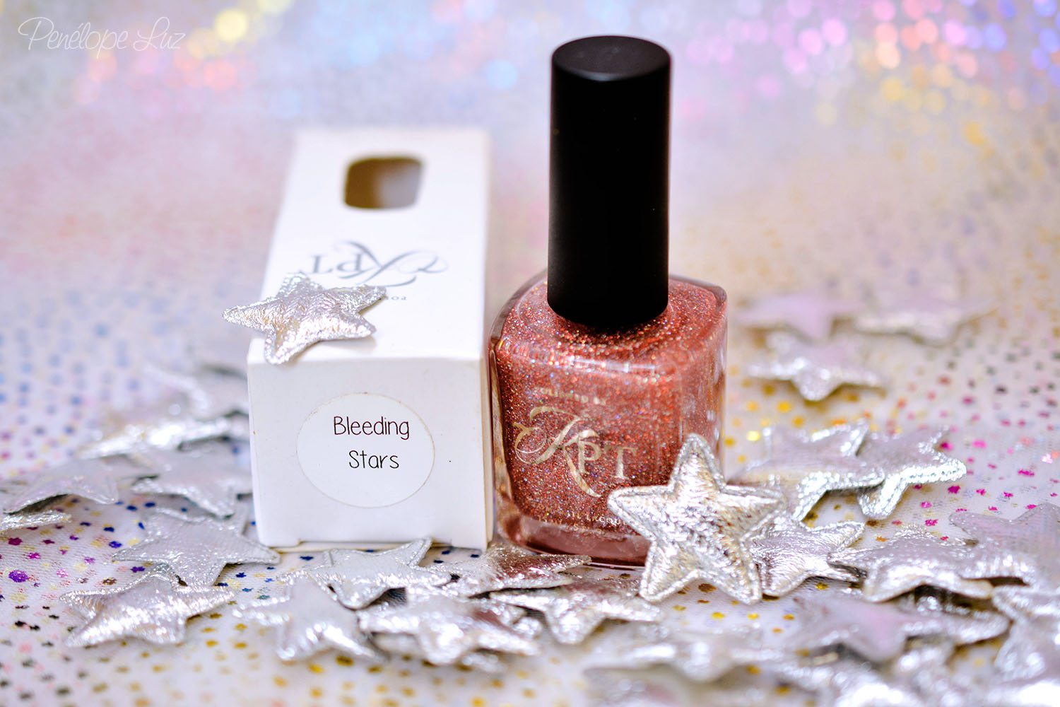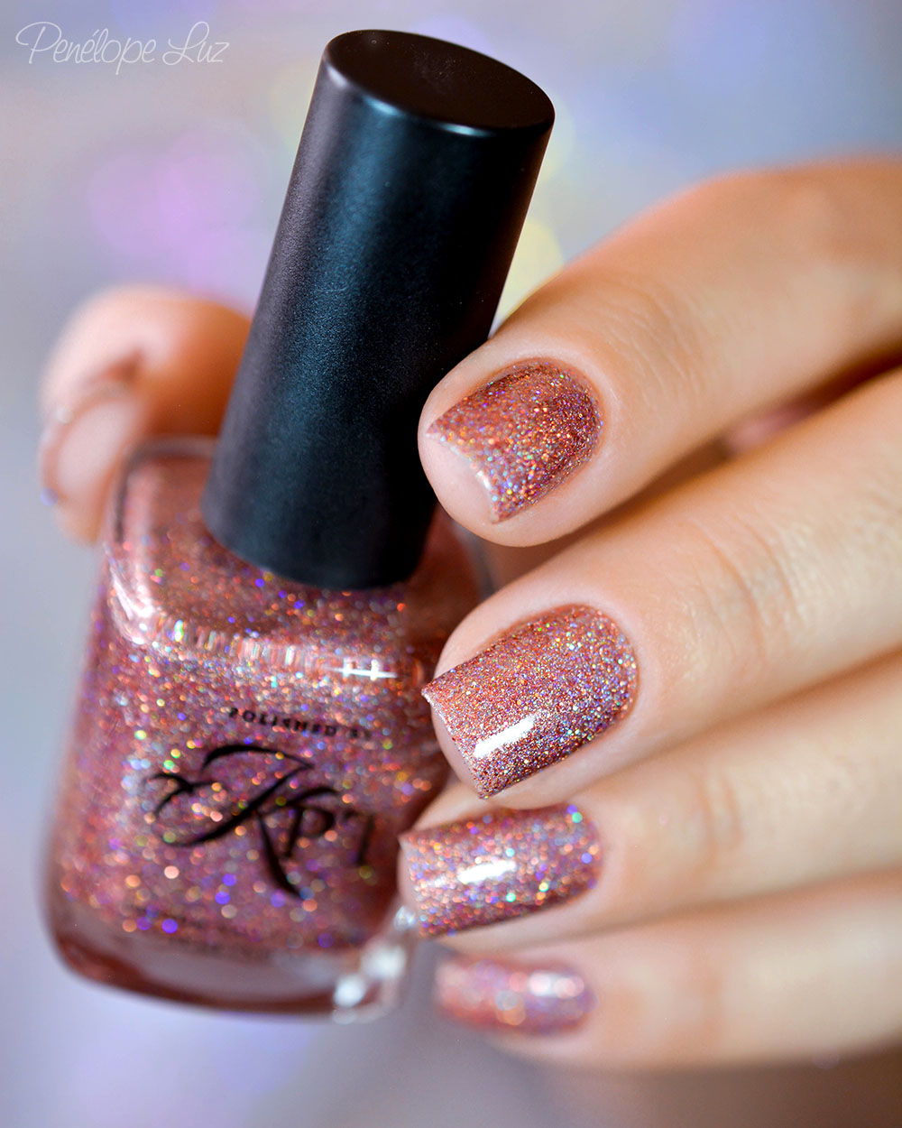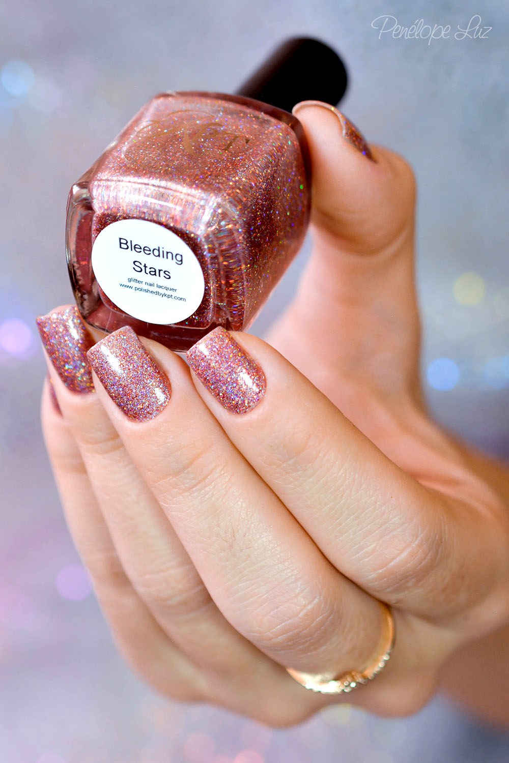 Mas hoje quero mostrar um esmalte que recebi da marca de esmalte artesanal americana Polished by KPT, o Bleeding Stars. Ele é um cooper claro lindo, com glitters prateados holográficos (daqueles que não fazem relevo) e mais glitters comuns na cor cooper metálico. Ele também tem pigmento holográfico, que dá cobertura e deixa ele ainda mais brilhoso, com uma profundidade mais intensa. Fiquei apaixonadíssima por esse esmalte, ele é realmente lindíssimo! ❤