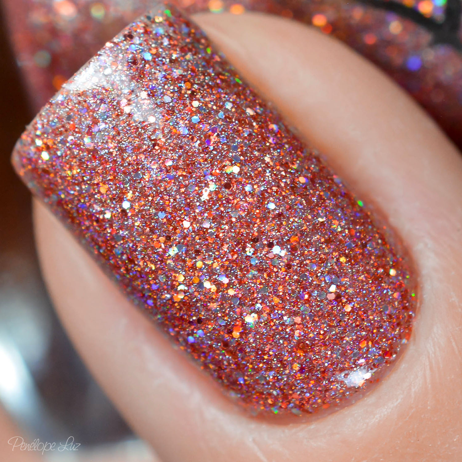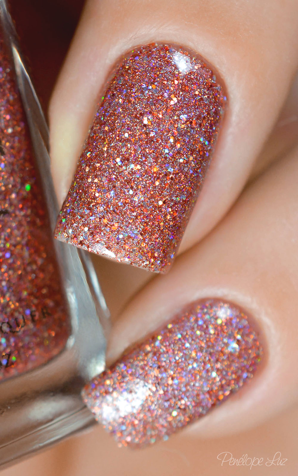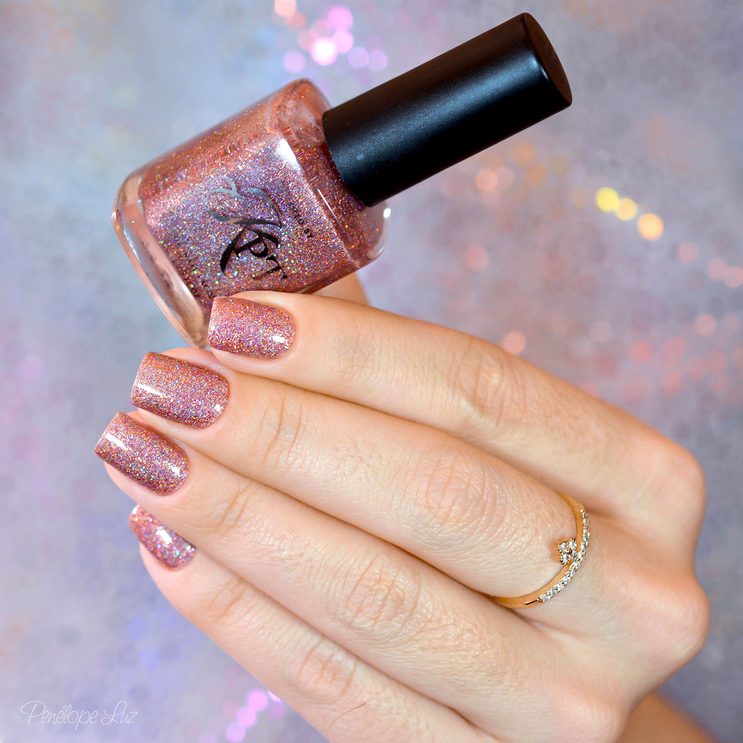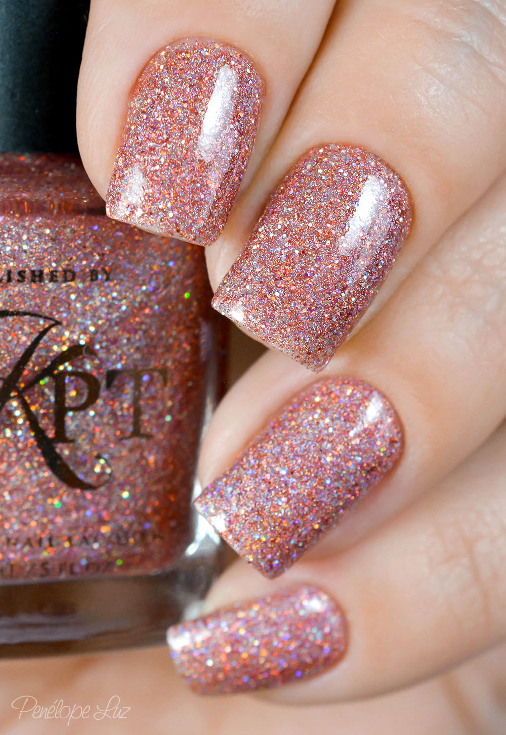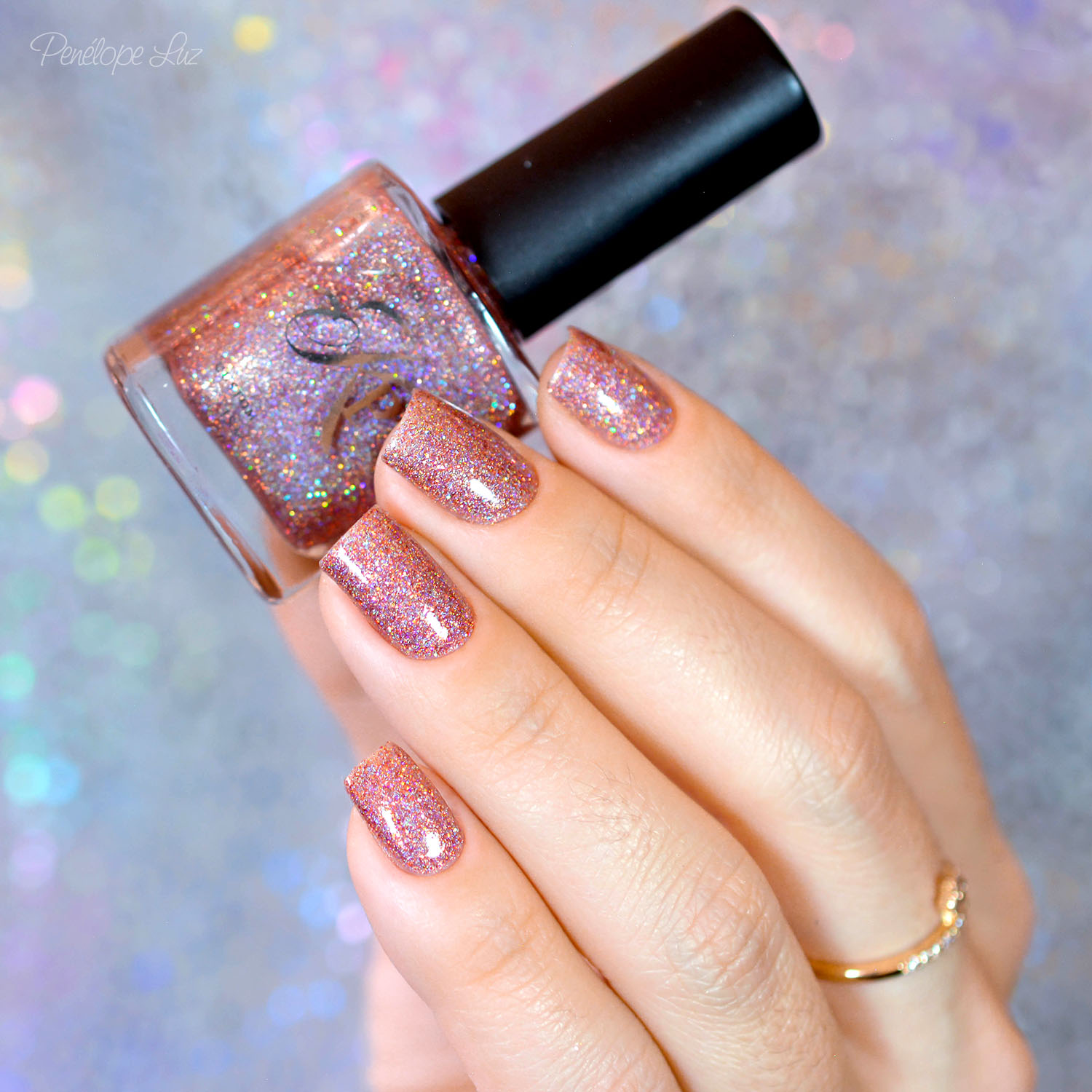 Mas hoje quero mostrar um esmalte que recebi da marca de esmalte artesanal americana Polished by KPT, o Bleeding Stars. Ele é um cooper claro lindo, com glitters prateados holográficos (daqueles que não fazem relevo) e mais glitters comuns na cor cooper metálico. Ele também tem pigmento holográfico, que dá cobertura e deixa ele ainda mais brilhoso, com uma profundidade mais intensa. Fiquei apaixonadíssima por esse esmalte, ele é realmente lindíssimo! ❤