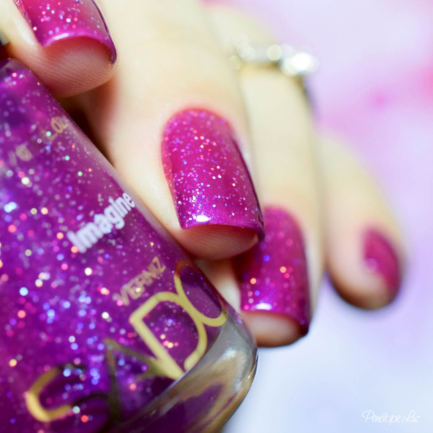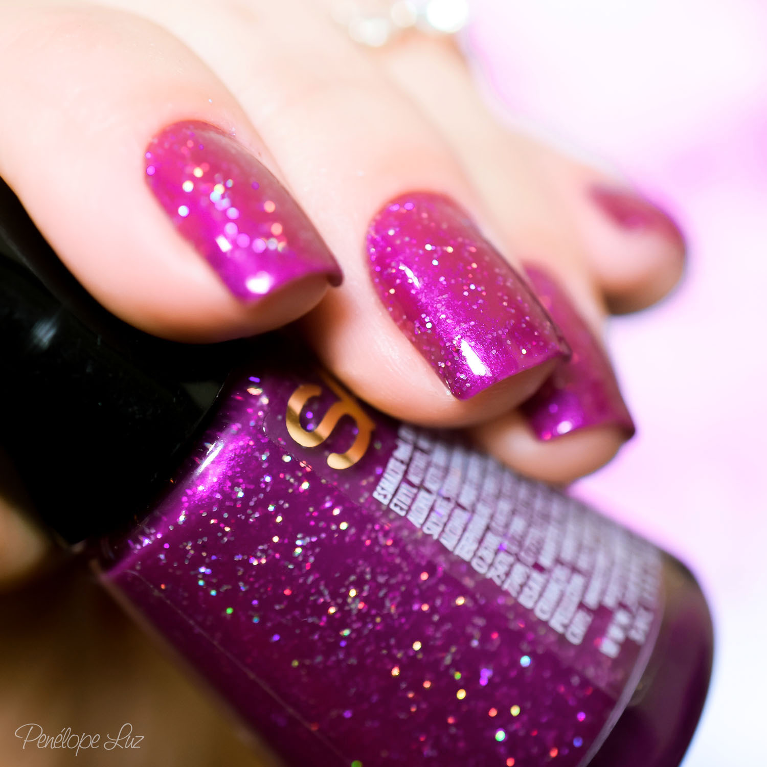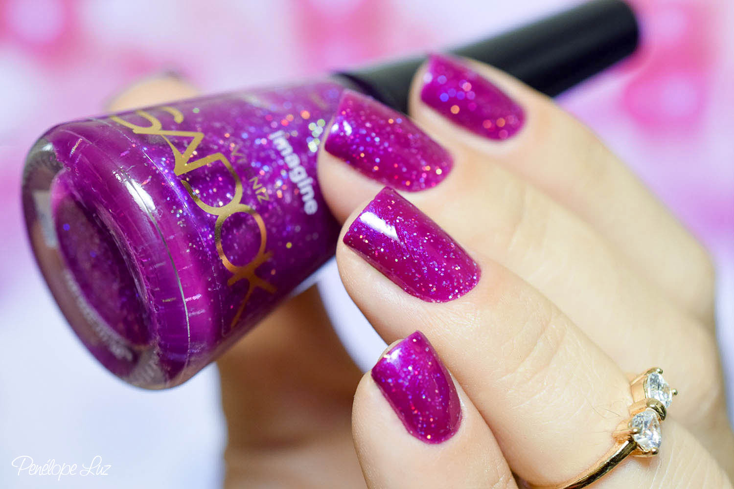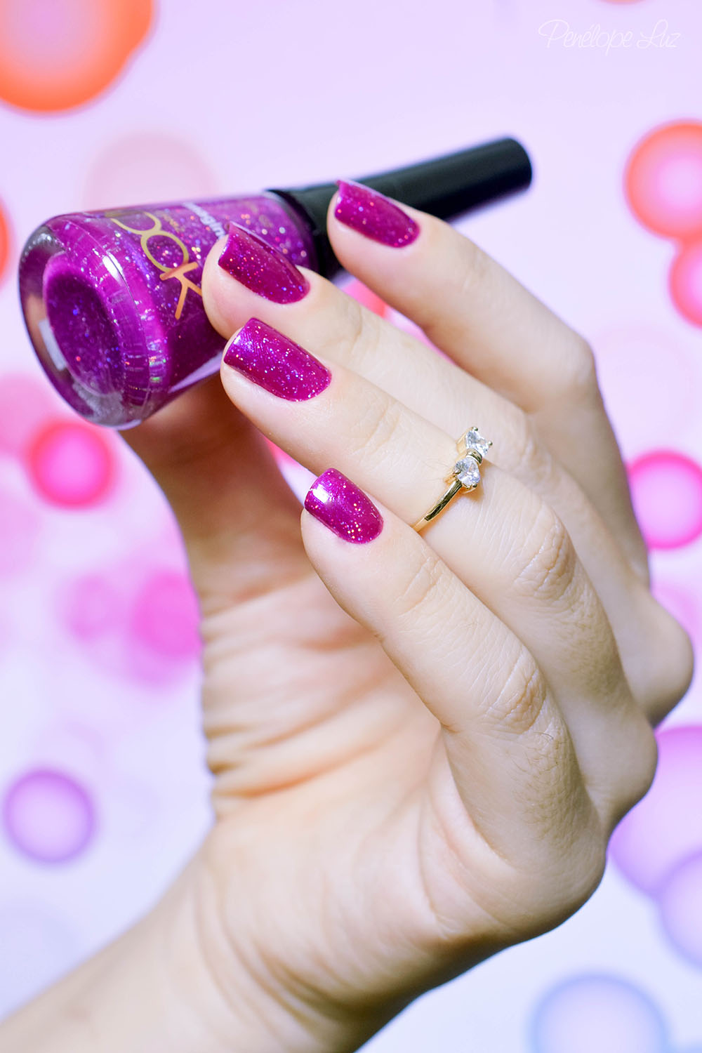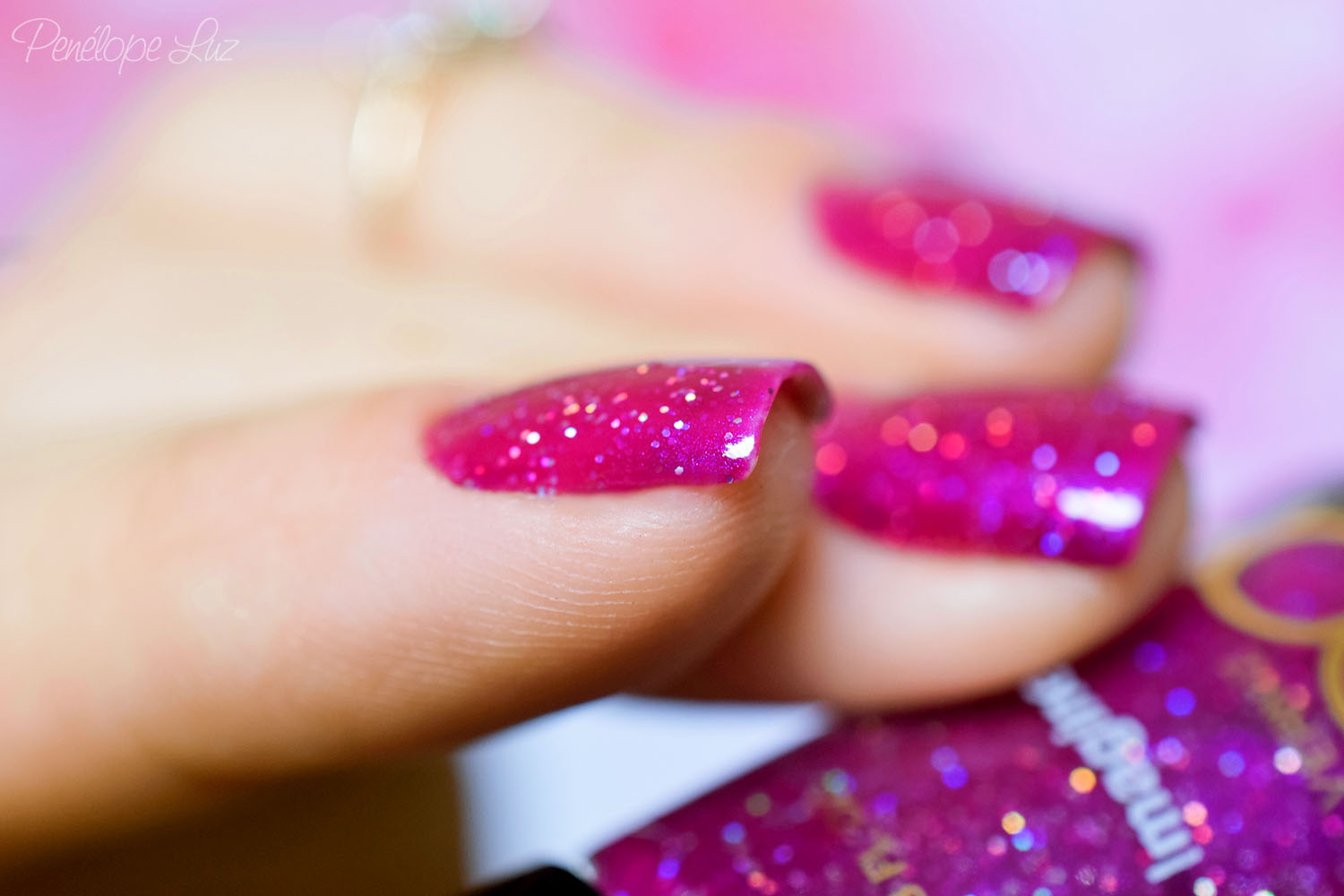 Ele tem um tom de magenta lindo demais, com shimmer violeta, que dá uma vida maravilhosa à cor. Os glitters são de boa qualidade, não são tão carregados, o que é ótimo porque o esmalte precisa de pelo menos 3 camadas para dar uma boa cobertura. Finalizando com uma camada de top coat fica perfeito! Lindo demais!
