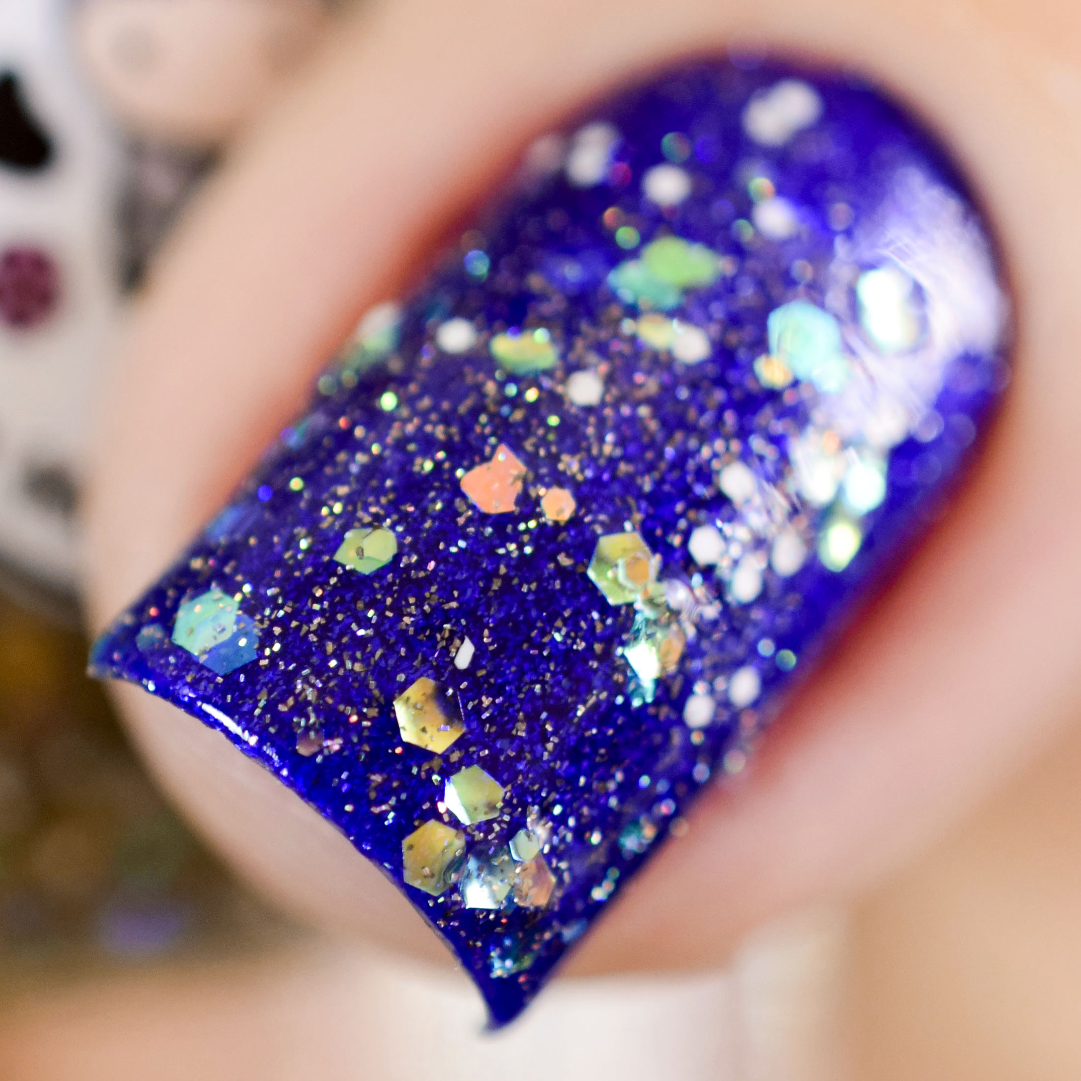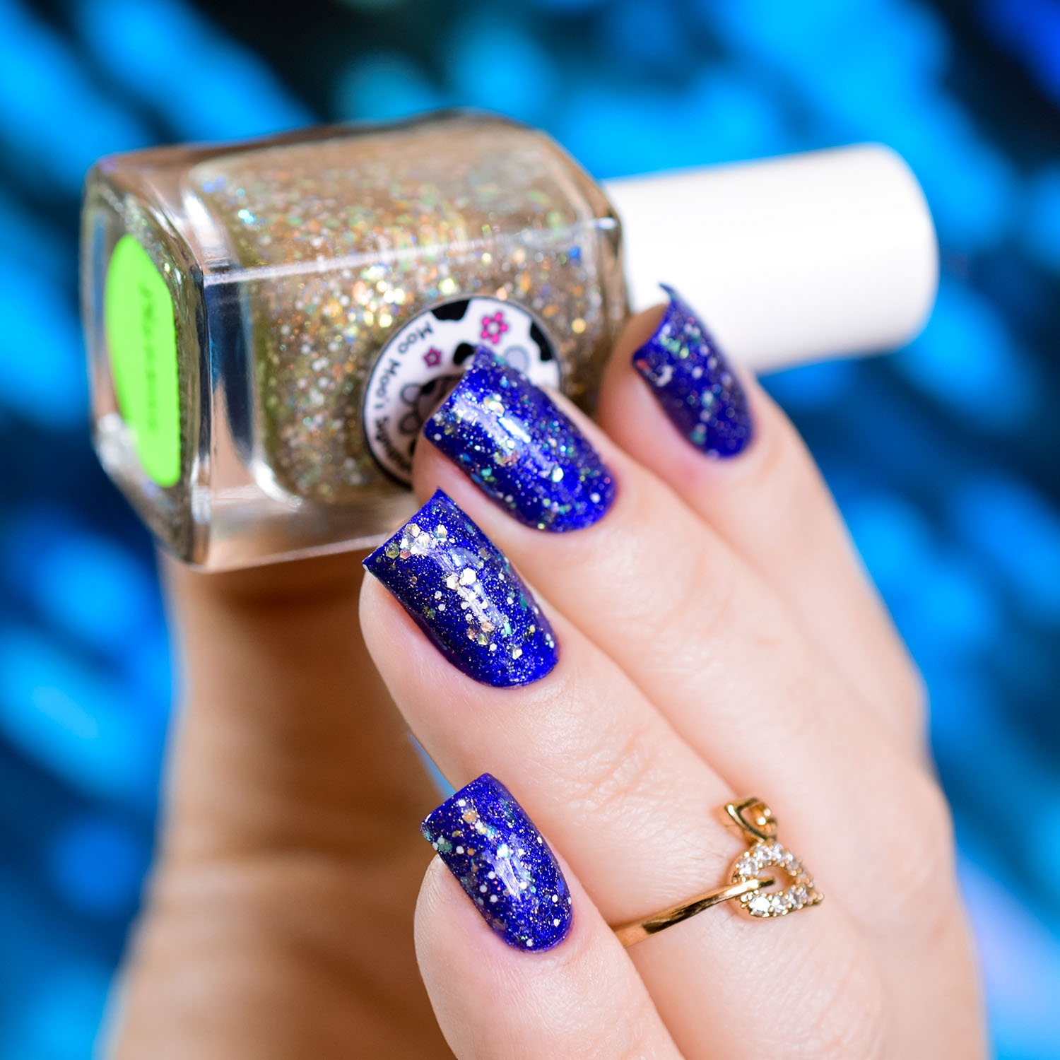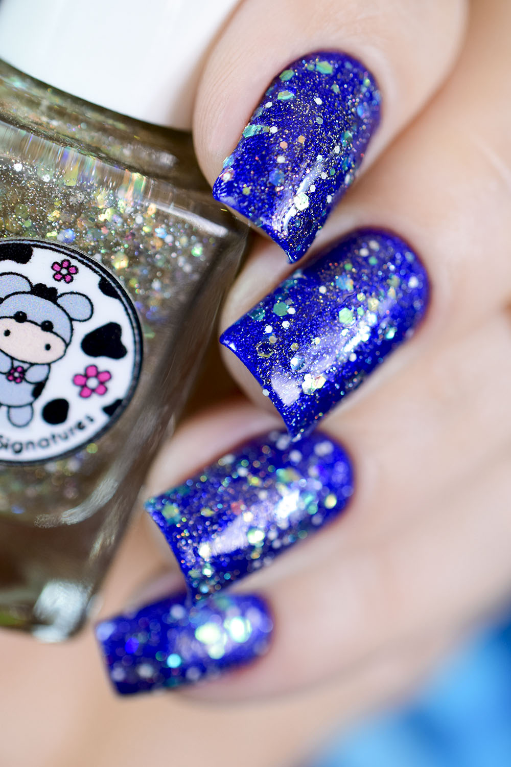 E o Shoomoo é um top coat com glitters de vários tamanhos furta-cor e branco, e tem também um pouco de pigmento holográfico. Muito fofo e delicado! ❤ Passei uma camada dele sobre o azul: