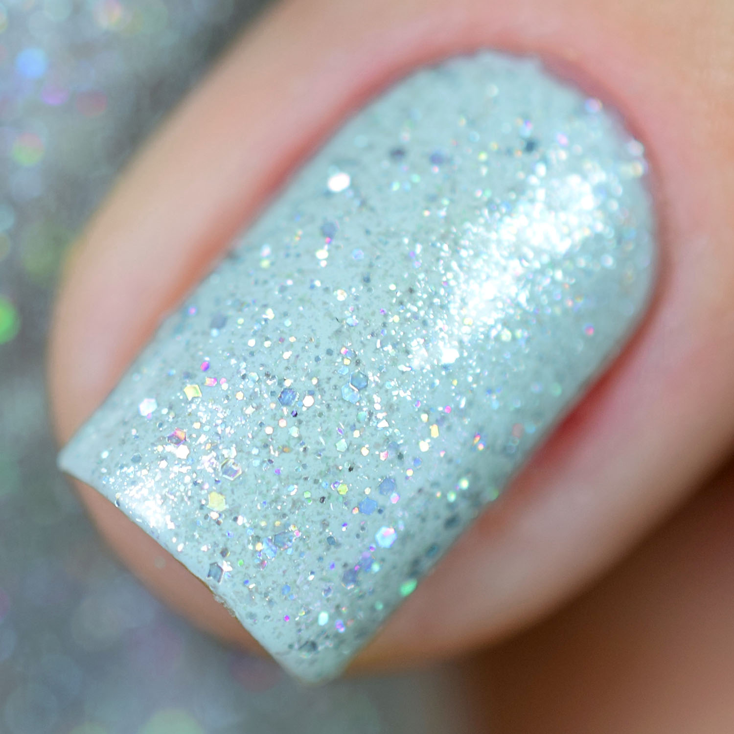 Vou começar pelo Snow Angel, que é um branquinho com glitters prata holográfico. O pigmento desse esmalte parece uma neve e brilha muito! Tão delicadinho!! Nos dois dedos do meio eu usei uma camada dele por cima de um azul bem clarinho e nos outros dedos coloquei 3 camadas dele. Fiz mais para ser usado por cima de outros, deixa qualquer esmalte delicado. ❤