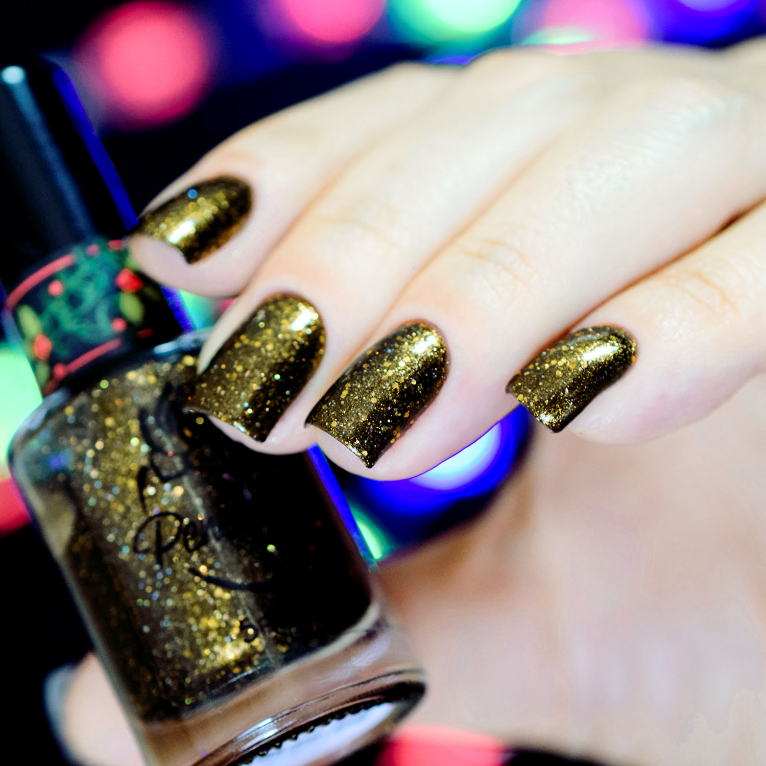Agora vamos ver o Different King que é um esmalte com base preta, mas que tem um pigmento dourado brilhoso, que acabou deixando ele um oliva bem escuro. Também coloquei glitters dourados. Lindo demais ele! Ao vivo brilha muito! Coloquei duas camadas dele. ❤