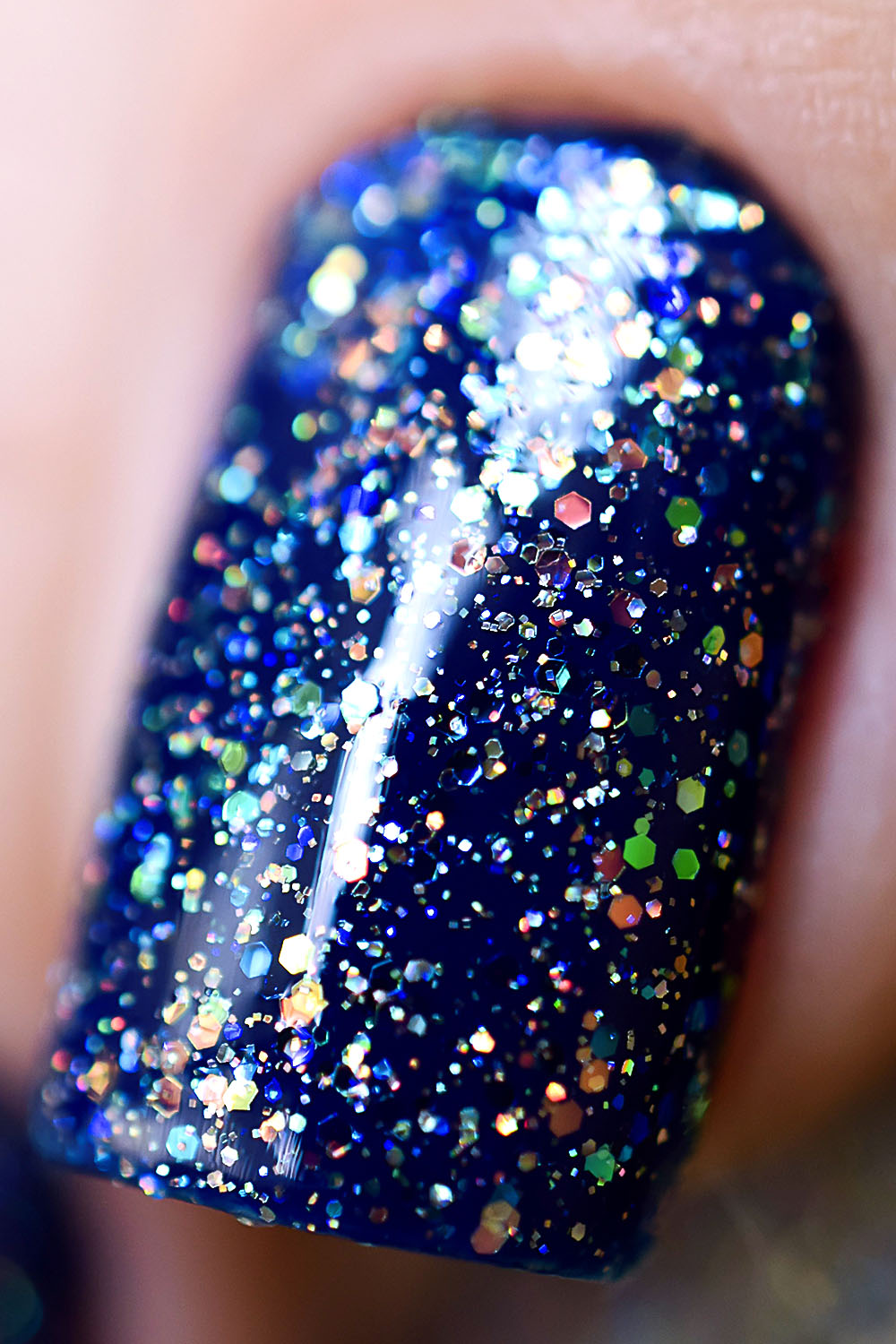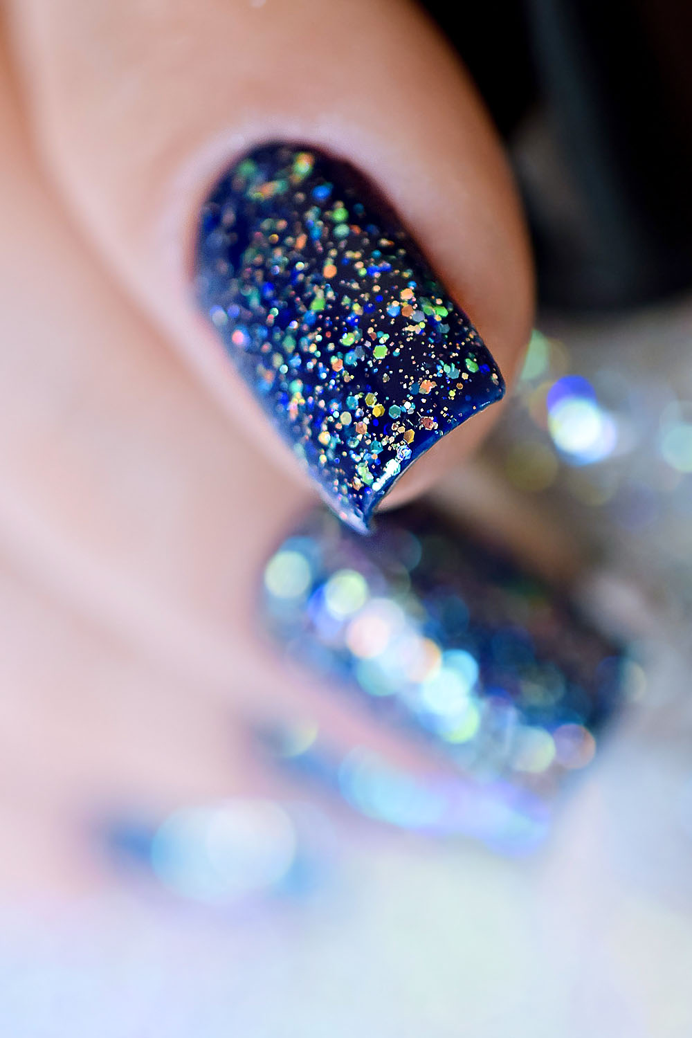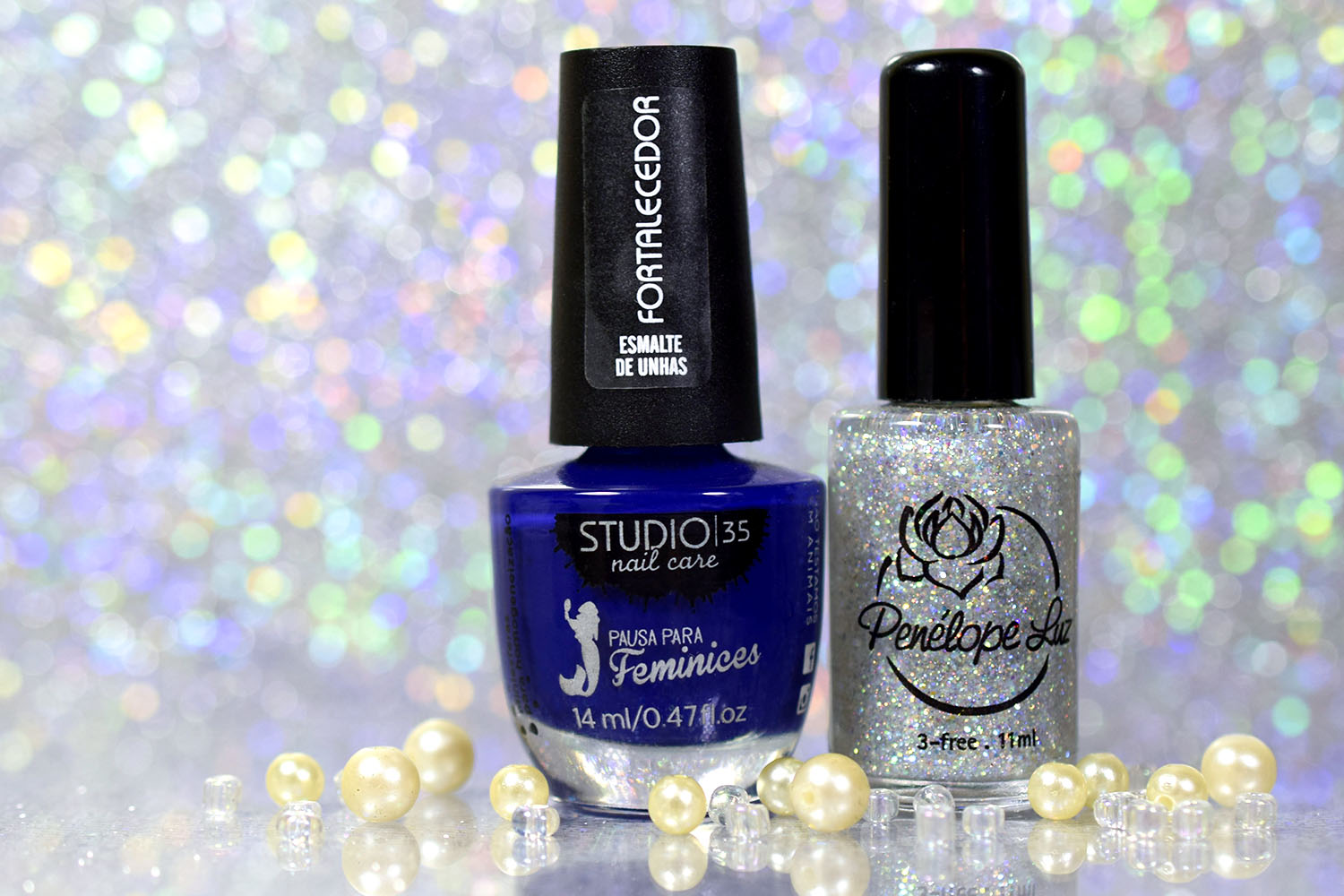 Por cima do Ondina, coloquei uma camada do Peaceful e finalizei com uma do extra-brilho da Big Universo. O Peaceful tem glitters furta-cor de vários tamanhos, e também glitter holográficos prata bem fininhos, como já disse aqui no post de lançamento. Dá um efeito lindo! Delicado e feminino, à mim transmite muita paz mesmo. Fica lindo também sobre esmaltes clarinhos. ❤