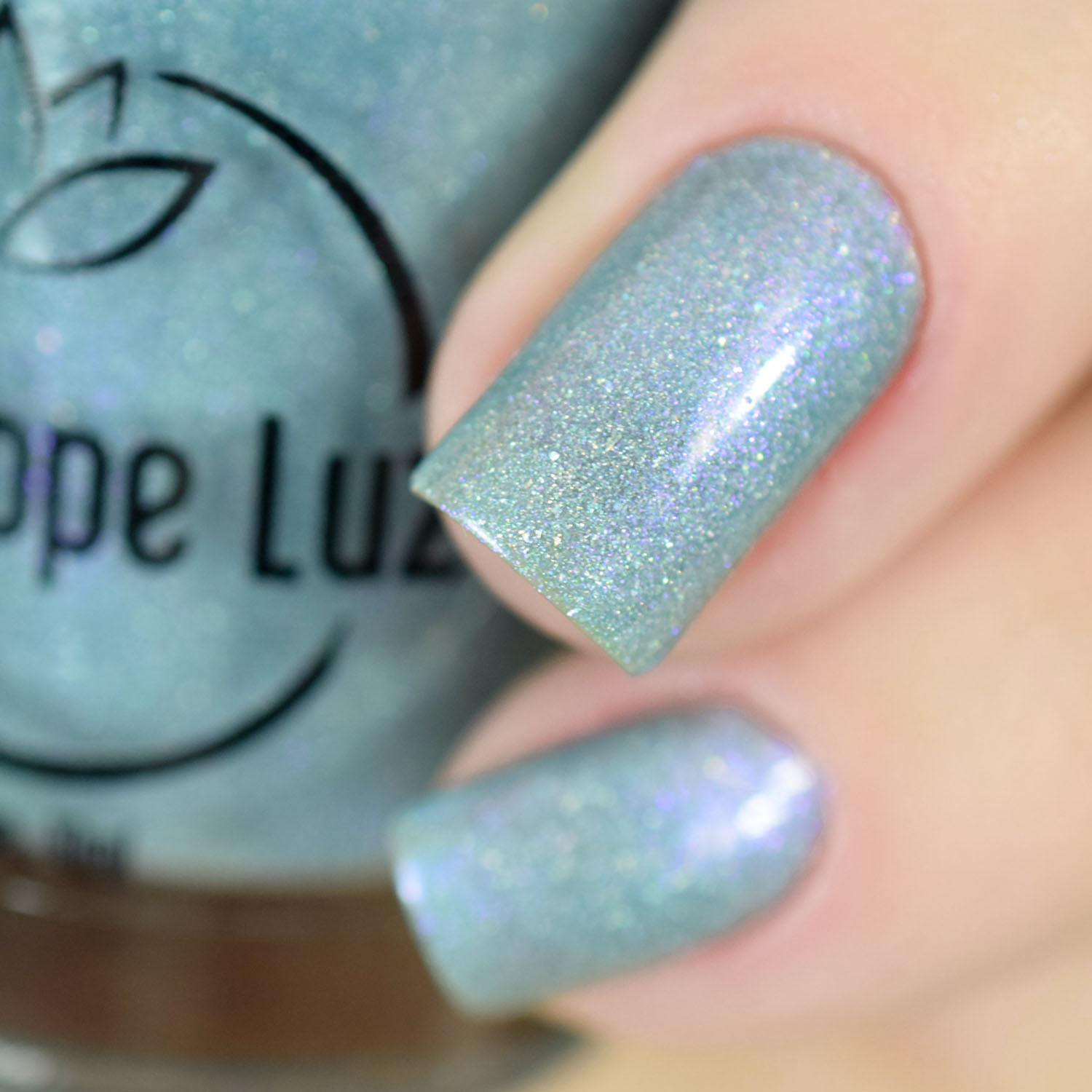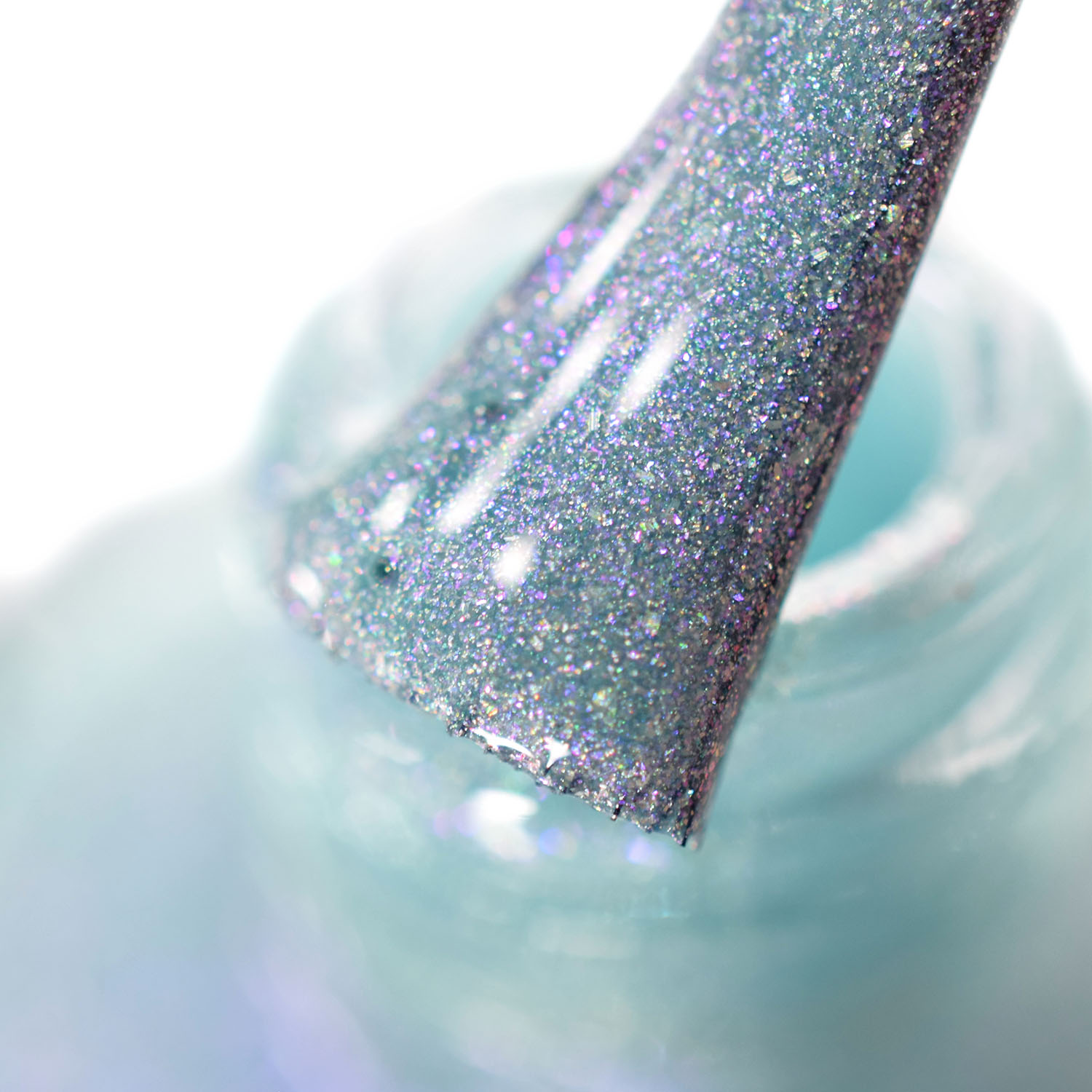 Agora o último, o Aquamarine, esse verde piscina lindo! Eu sou apaixonada por esmalte nesse tom! Ele tem caquinho holo e shimmer violeta também. Tem duas camadas.