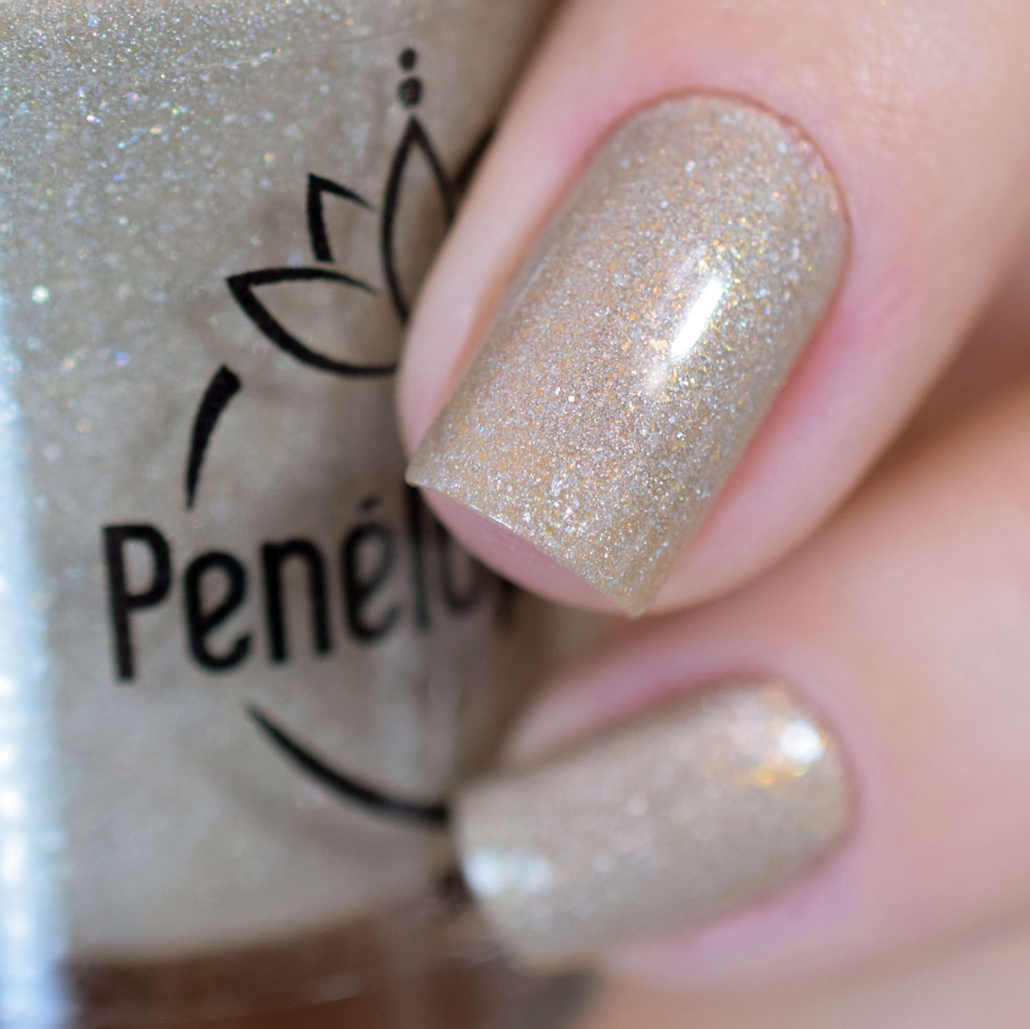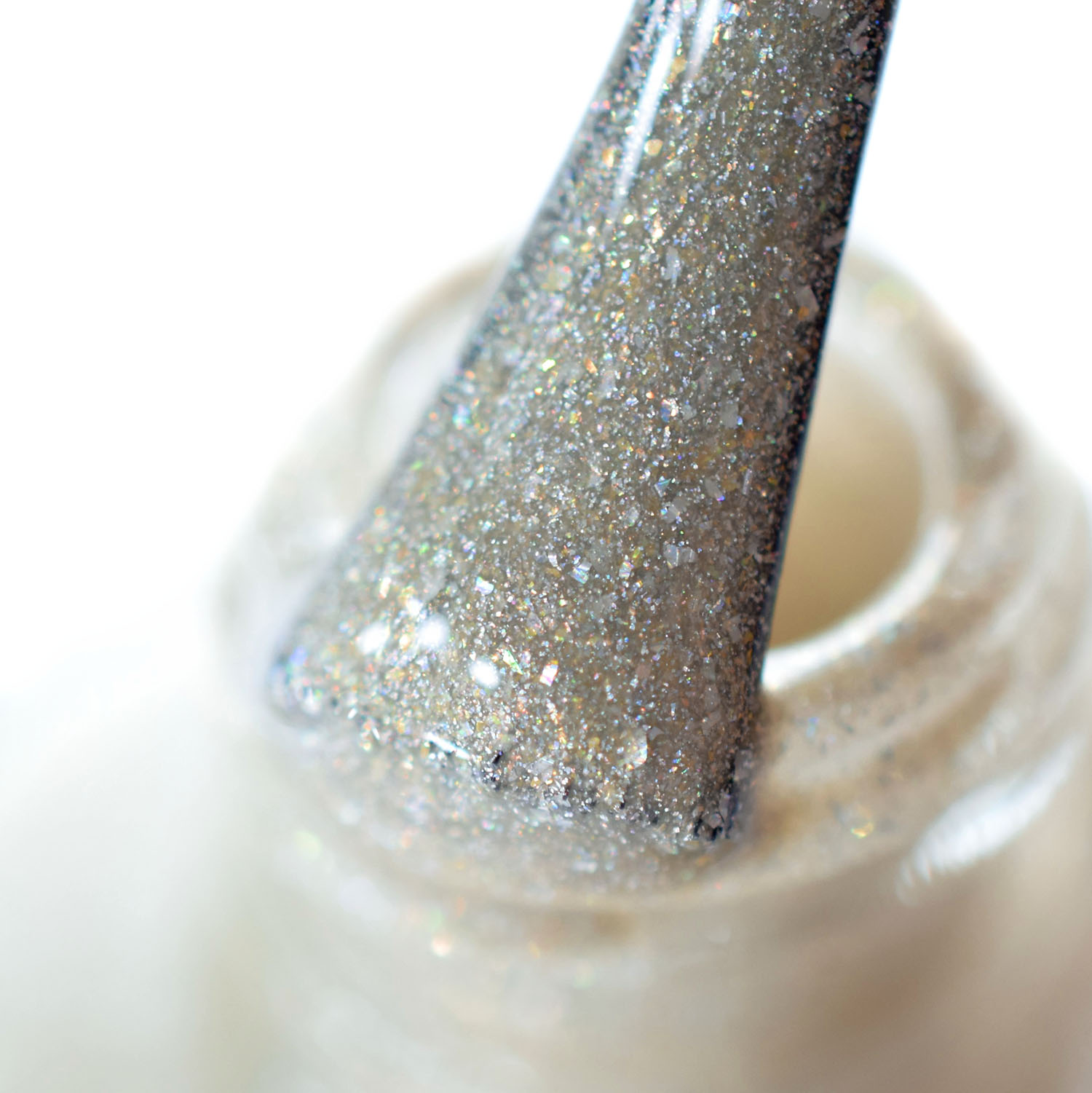 Vamos começar pela Pearl, que é um bege bem clarinho, indo para o greige. Nele eu coloquei também pigmento holo em forma de caquinhos e glass flecked dourado. Está duas camadas dele. Ficou tão delicadinho! ❤
