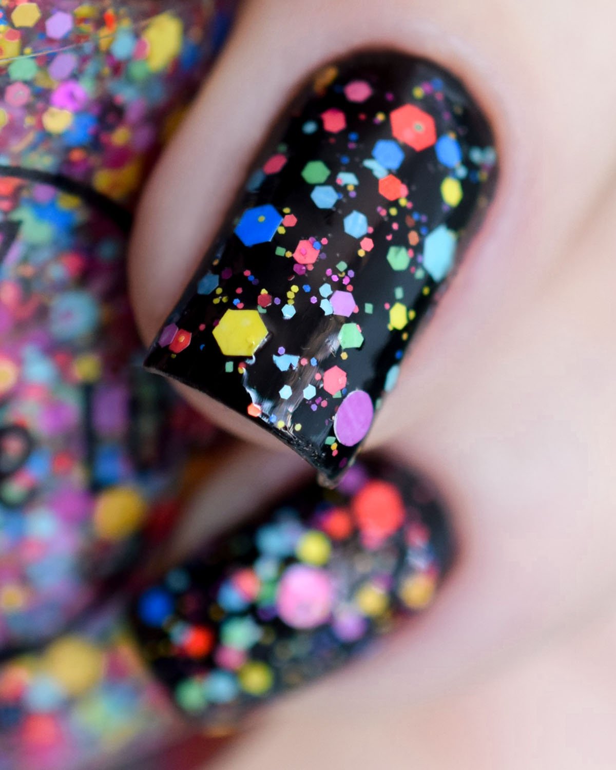 Fiz as fotos sobre esmalte bege e esmalte preto. Em exceto uma das cores que por ter glitter preto, eu optei por fazer sobre um azul, para que os pretos não sumissem. Todas estão com uma camada dos esmaltes, e finalizadas com uma camada de extra-brilho perfumado da Big Universo.