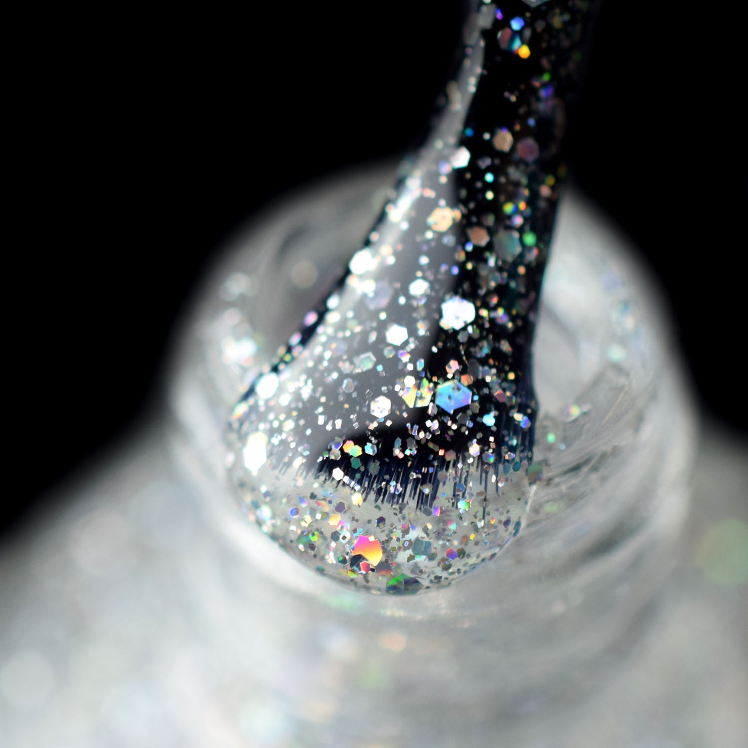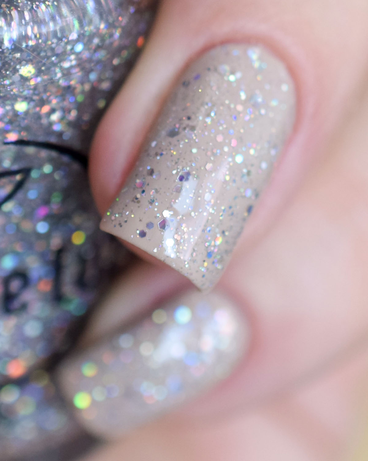 Agora vamos ao último da coleção, o Stellar. Ele é todo de glitters holográficos prata, de vários tamanhos. Brilha DEMAIS! Nenhuma foto fez jus ao brilho dele! Ao mesmo tempo ele é bem delicadinho, especialmente sobre esmaltes claros. ❤