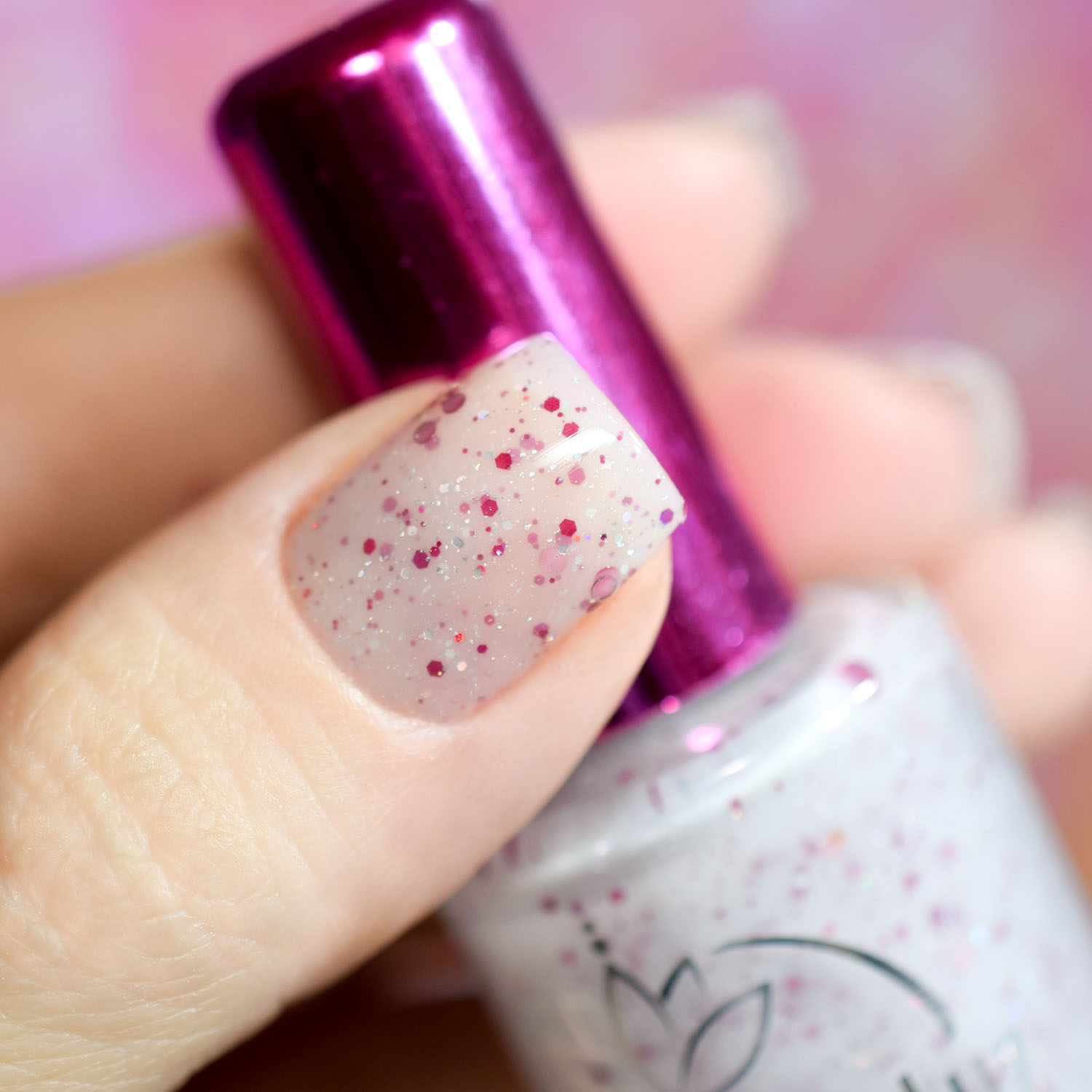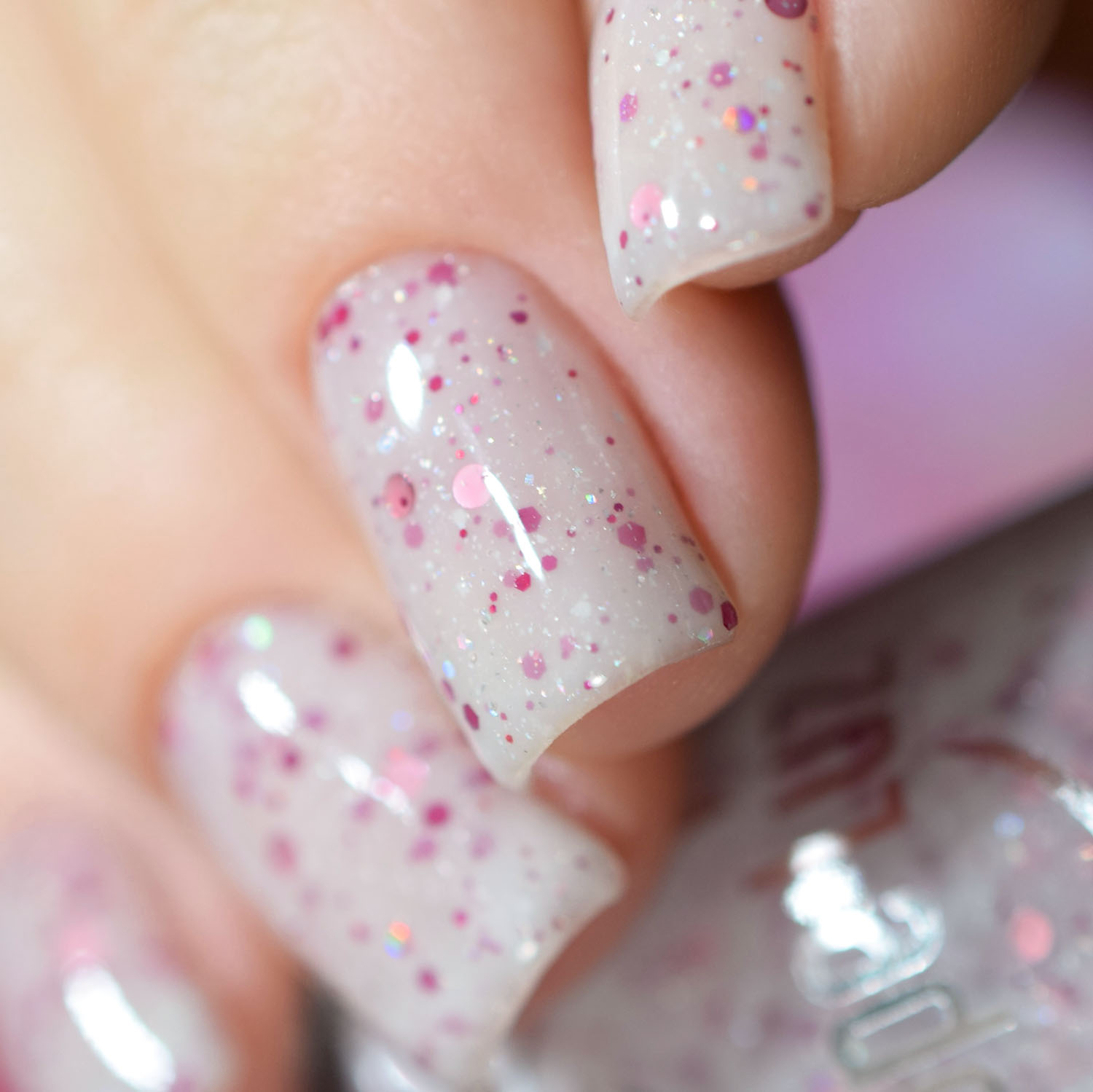 Agora vamos ao Maternal, que é um branquinho leitoso com glitters nos tons rosa pink, rosa pastel e silver holográfico. Tem também um pouquinho de pigmento e caquinho holo pra dar profundidade <33