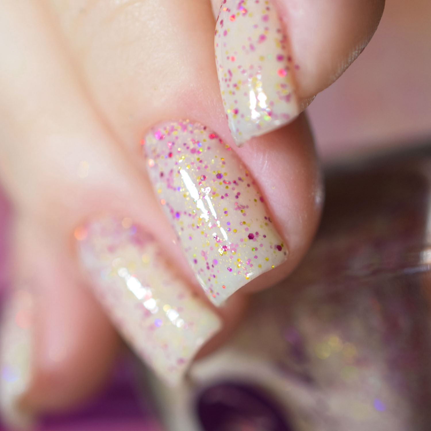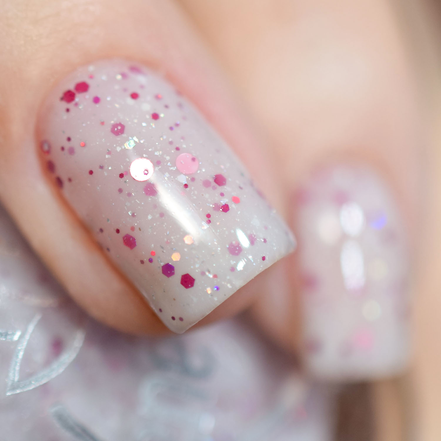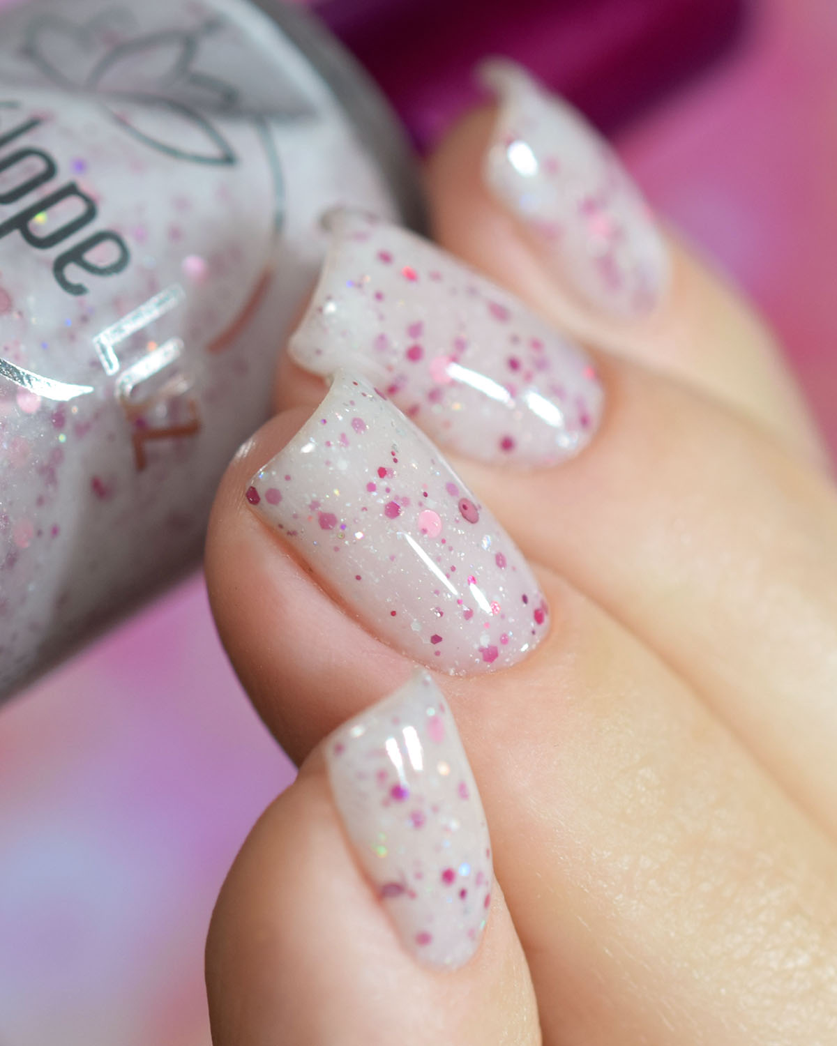 Agora vamos ao Maternal, que é um branquinho leitoso com glitters nos tons rosa pink, rosa pastel e silver holográfico. Tem também um pouquinho de pigmento e caquinho holo pra dar profundidade <33