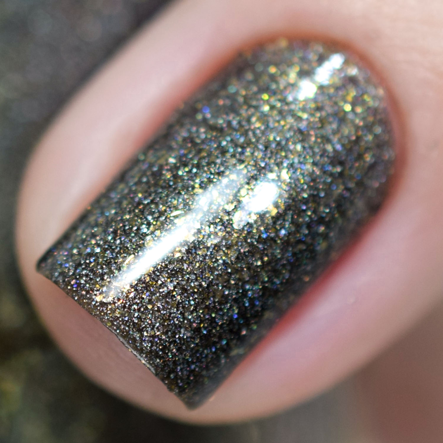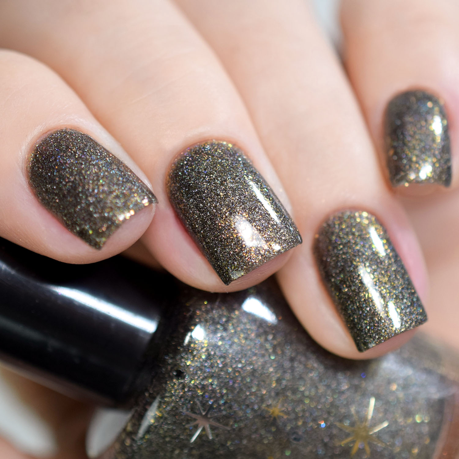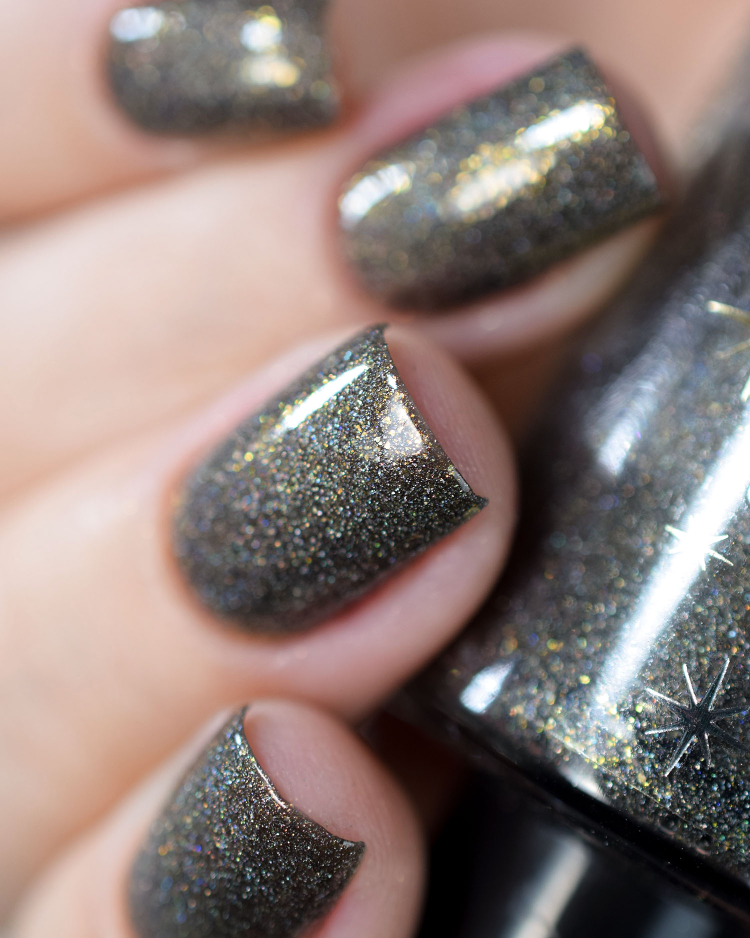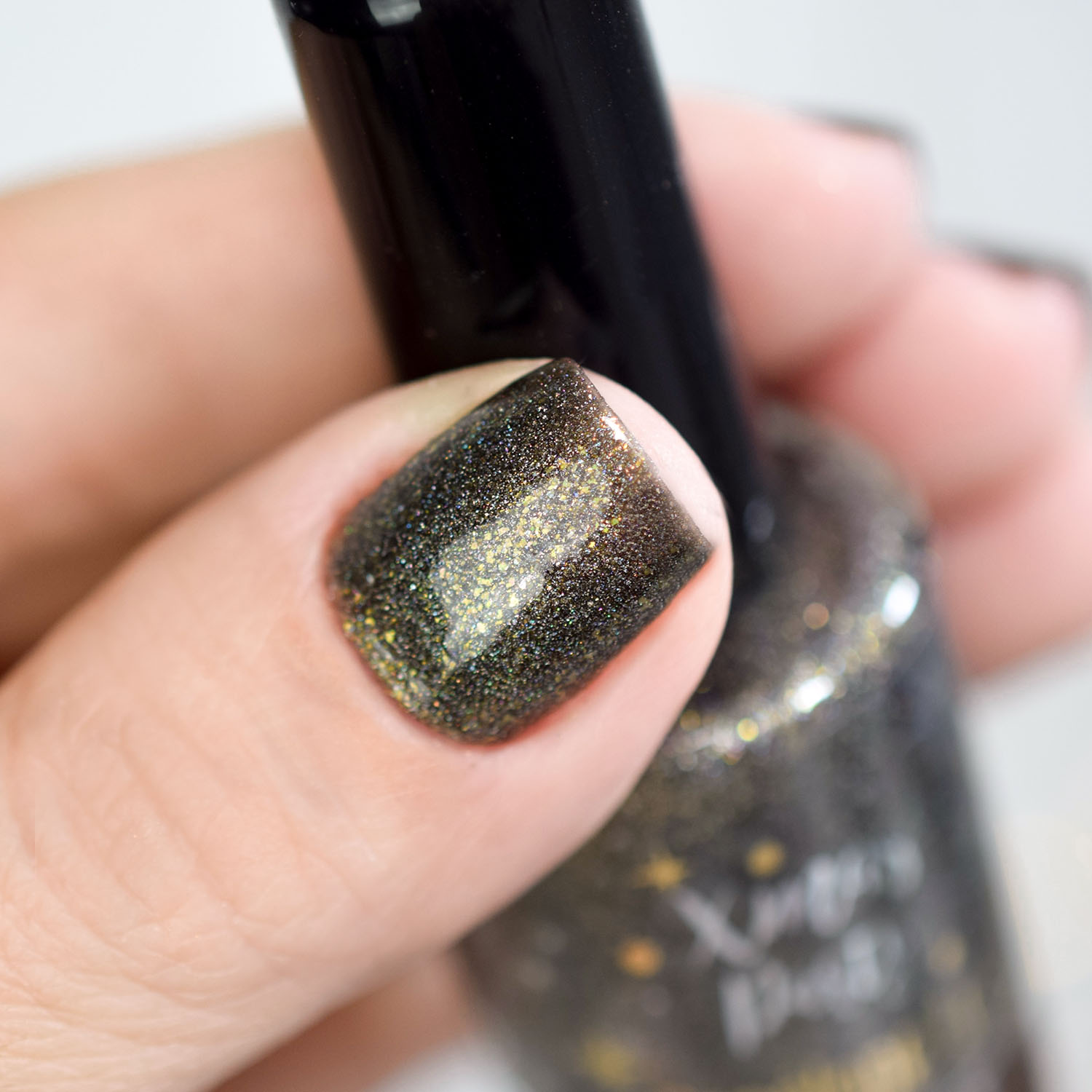 Agora vamos conhecer o Dessert Tradition, que tem o fundo grafite, também tem três tipos de pigmento holográfico e mais caquinhos dourados. Fica com essa aparência de ouro velho que amo!