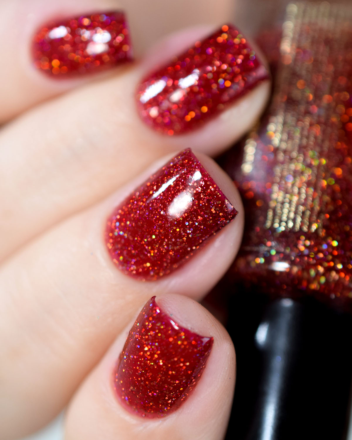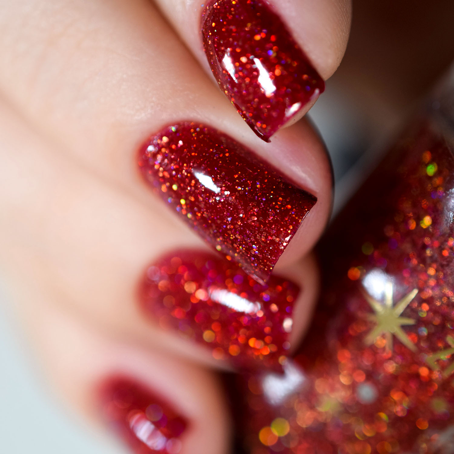 Primeiro o vermelho da coleção, porque vermelho não pode faltar no Natal! É o Spirit of Love, que tem base vermelho vivo e glitter galaxy holográfico dourados de dois tamanhos.