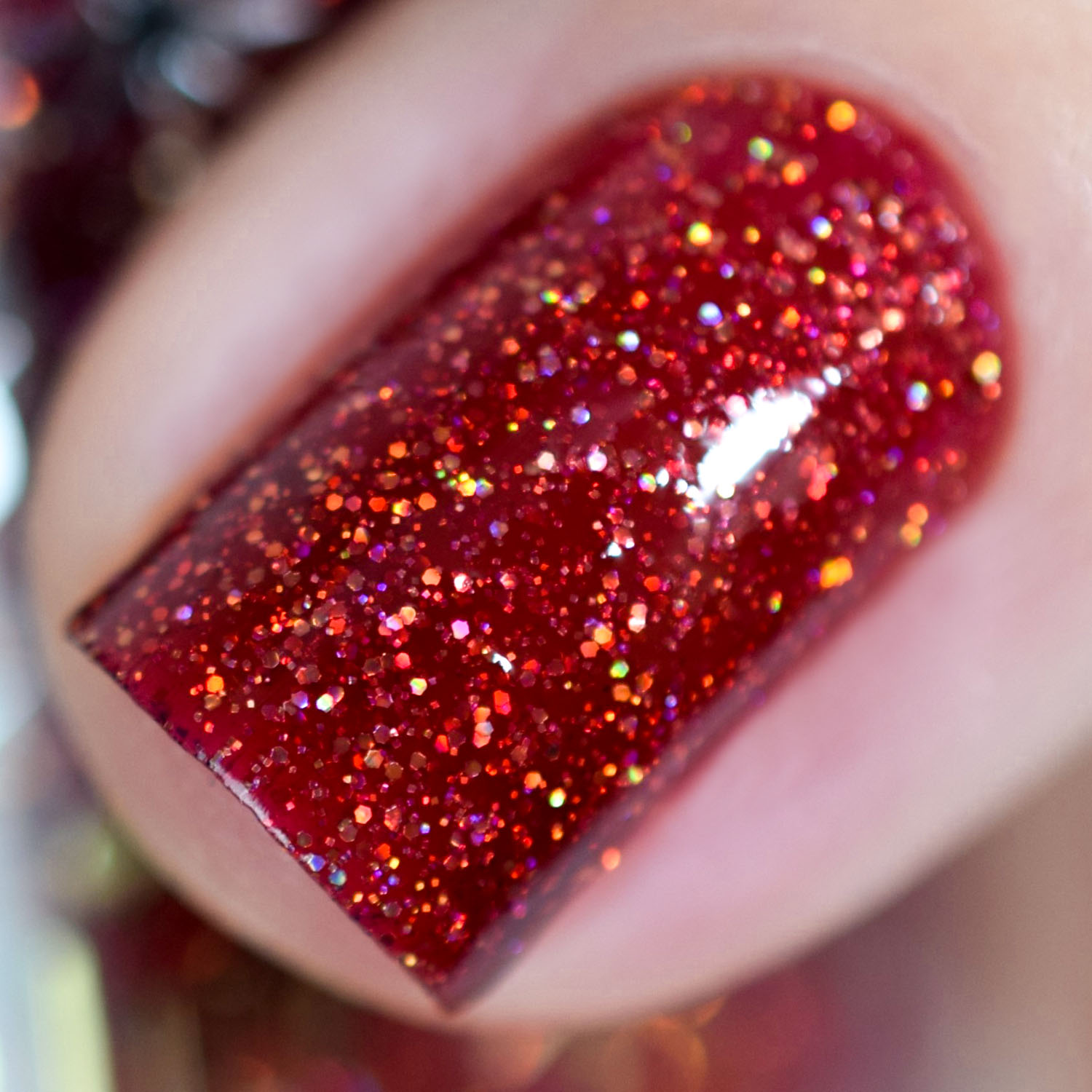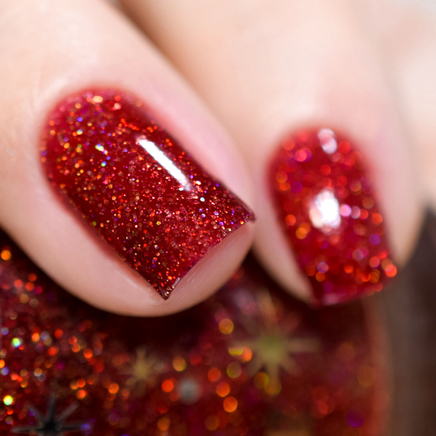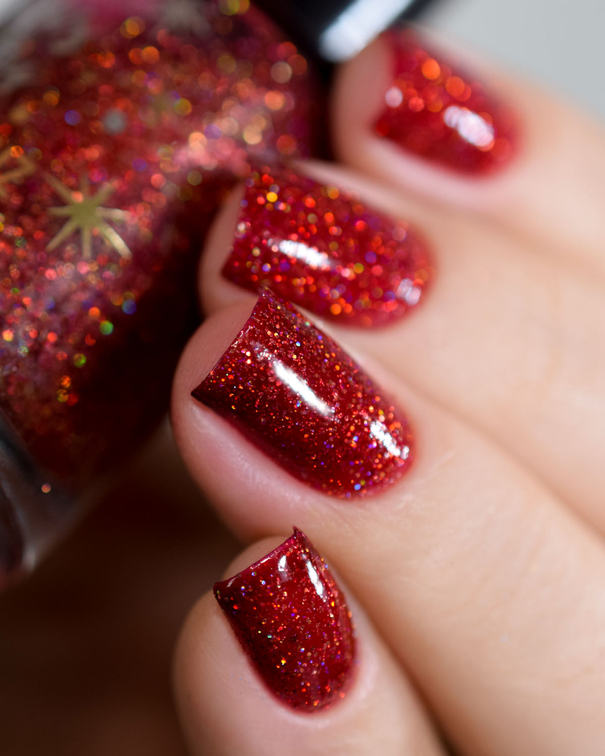 Primeiro o vermelho da coleção, porque vermelho não pode faltar no Natal! É o Spirit of Love, que tem base vermelho vivo e glitter galaxy holográfico dourados de dois tamanhos.