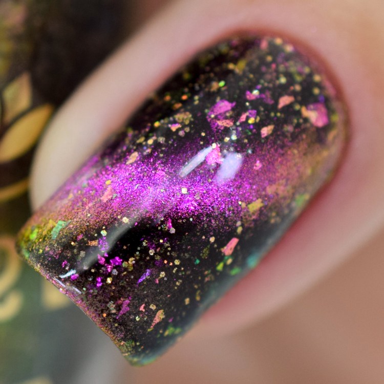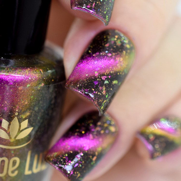 Por fim vamos conhecer o Feel the Beat, um magnético multichrome com base magenta vibrante (diferente do Djinn Spells que puxa mais para o vinho) e reflexo dourado/verde. Ainda coloquei glitter dourado e flakie iridescent rosado/verde. Nas fotos ele está com 3 camadas, mas eu sugeriria usá-lo por cima do preto, que uma camada só já fica perfeito e ainda economiza o esmalte. 😀