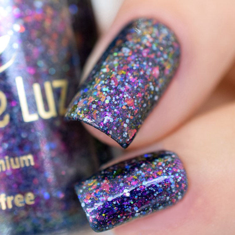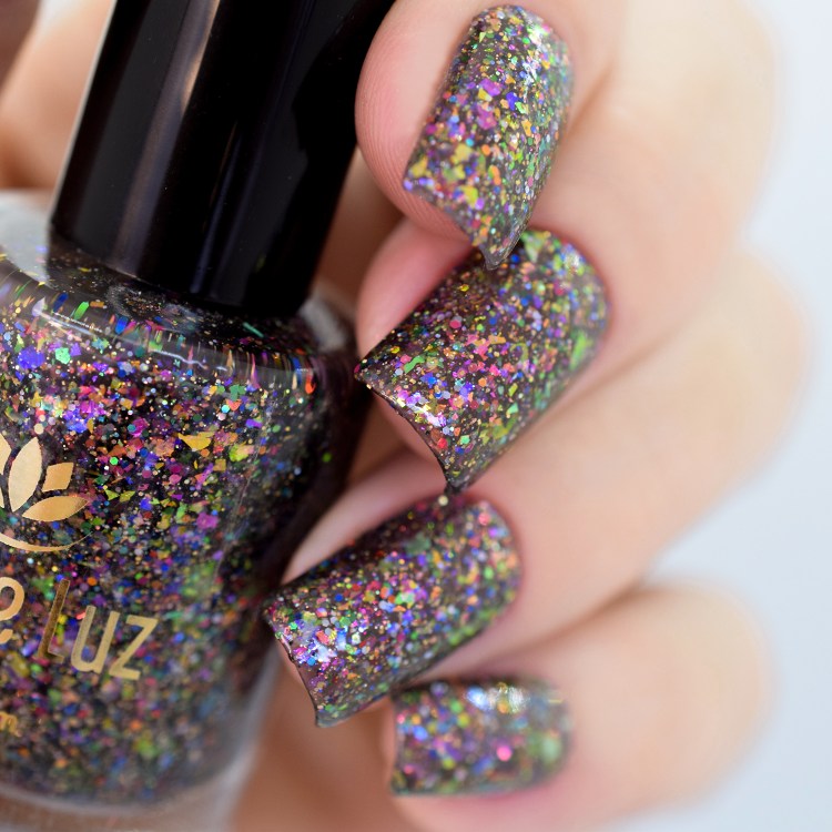Agora vamos ao Friday Night, que é um jelly preto bem suave com muito flakie iridescent de todas as cores, e muito glitter holográfico de todas as cores. Eu pensei nesse esmalte para ser usado como topper de esmaltes mais coloridos e escuros. A pessoa saiu do trabalho sexta e não teve tempo de arrumar as unhas pra balada, então só coloca o Friday Night por cima e vai arrasar! Mas então vi que ele fica lindíssimo também usado sozinho com 3 camadas, que é como ele está nas fotos. Uma camada de top coat para finalizar. As fotos foram feitas na lightbox.