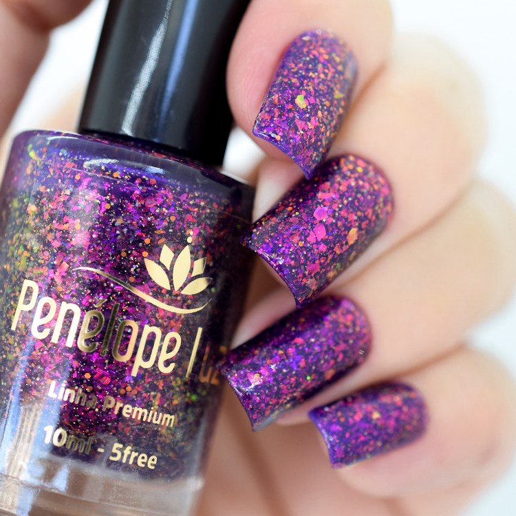 Agora vamos conhecer o Watch That Scene, que é um roxo jelly recheado de flakie iridescent e alguns glitters laranja, roxo e dourado para darem um charme. Esse esmalte é muito lindo, gente! Foi o que mais usei até agora! Nas fotos tem 3 camadas dele e uma de top coat. As fotos foram feitas na lightbox e luz natural do terraço.