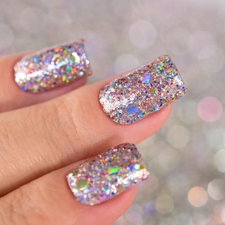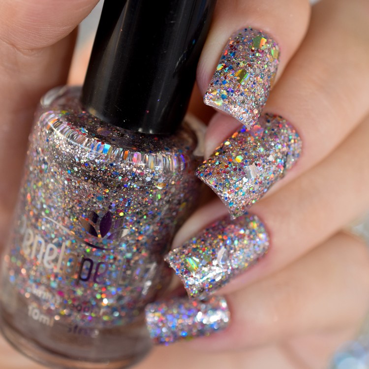 Agora vamos conhecer o You Can Dance, que é o mais brilhoso da coleção! São glitters holográficos multicoloridos e de diversos tamanhos, com predominância do prata. Esse é pra arrasar! Tem duas camadas dele com uma de top coat. Apesar de ser um glitter forte, ele não faz relevo. As fotos foram feitas na luz natural do terraço aqui de casa, mas coloquei uma luminária para mostrar bem a holografia.