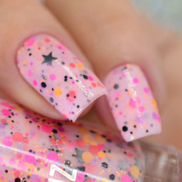O primeiro que vou mostrar é o Young and Sweet, que é um creally rosinha neon em tom pastel com glitters neon e estrelinhas pretas.