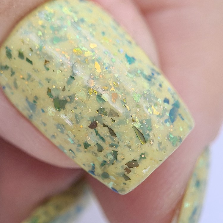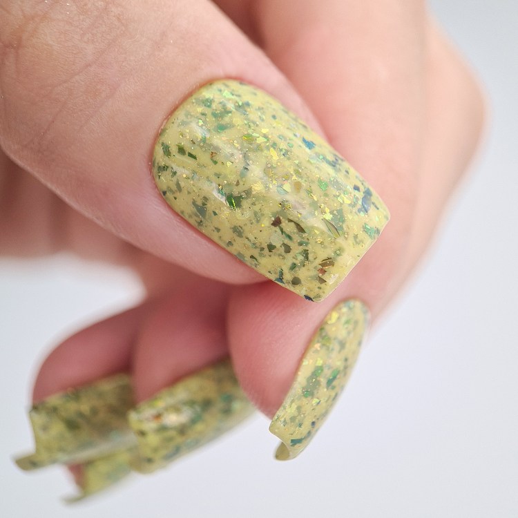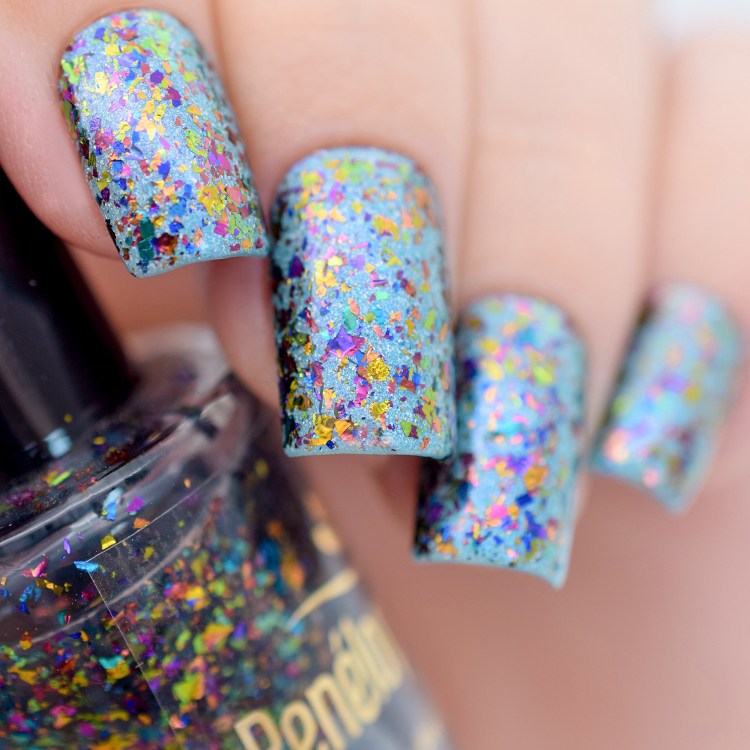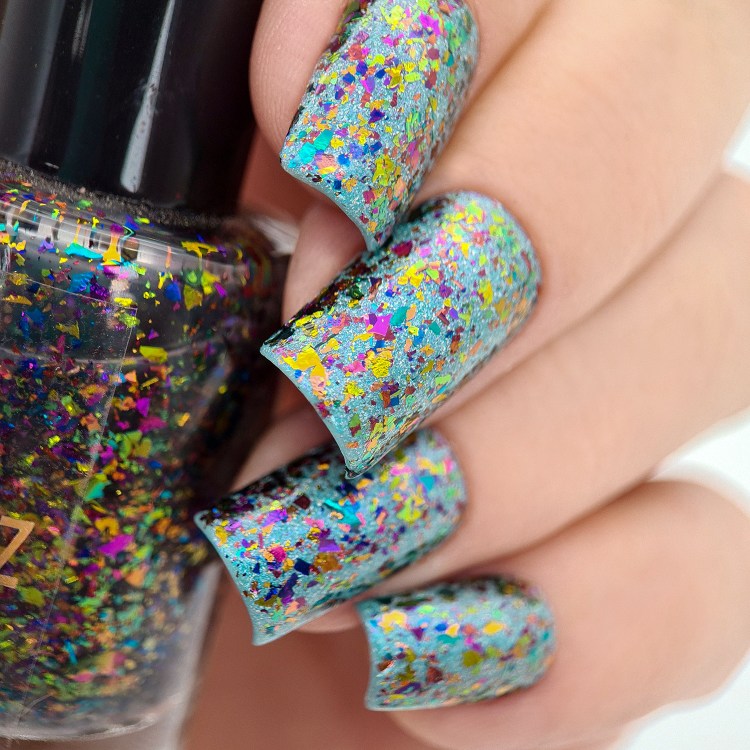 Agora vamos conhecer o Flower Fairy, que é um flake multichore e multi colorido. Lindo! Tem uma camada dele sobre um preto e uma camada sobre o Aquamarine.