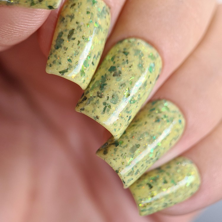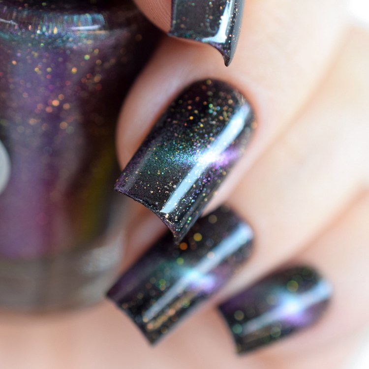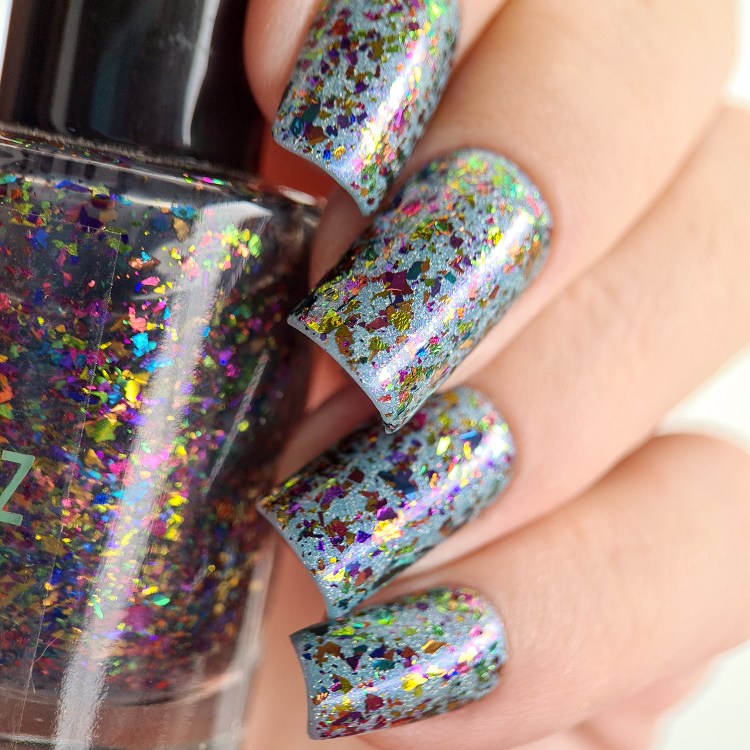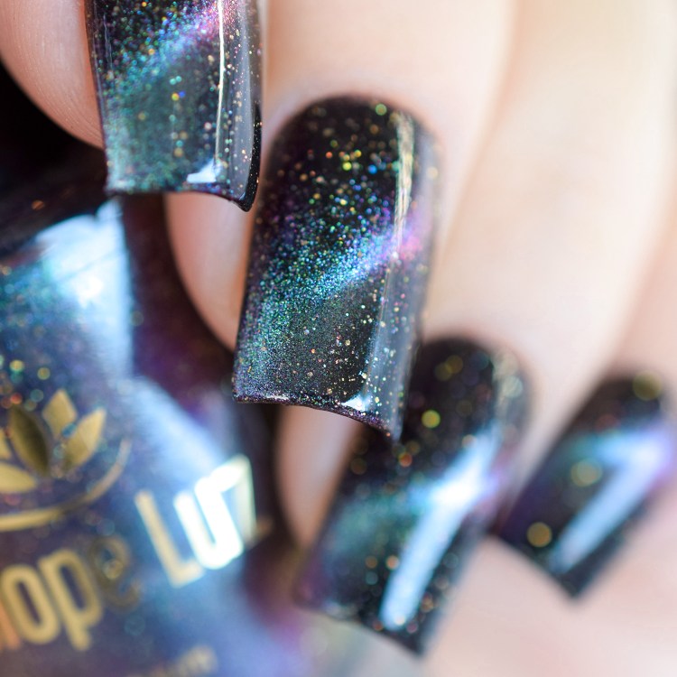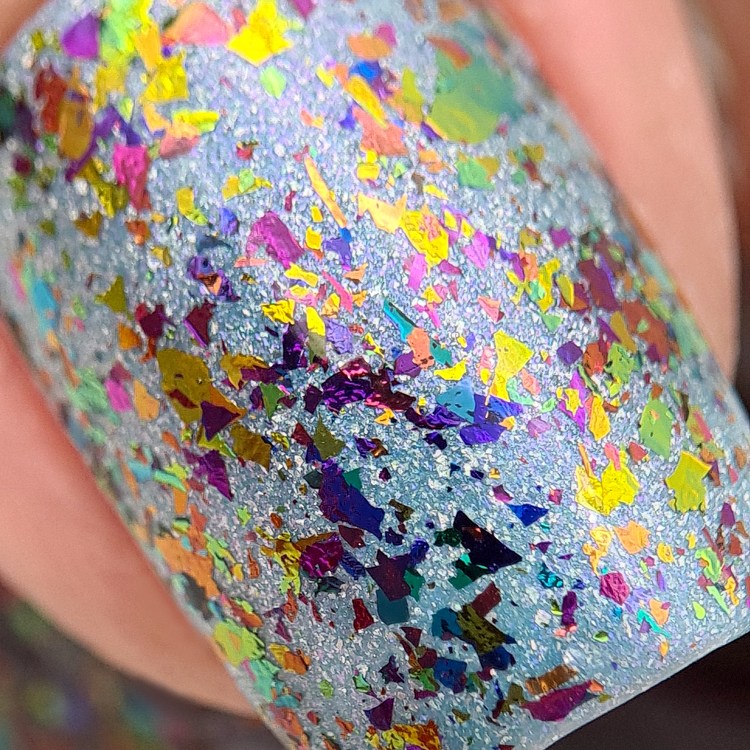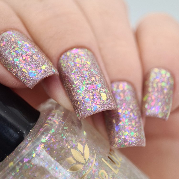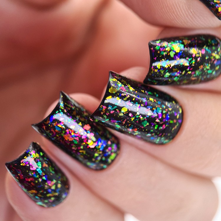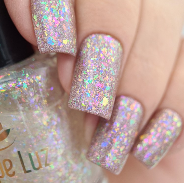 Por fim vamos conhecer o Unicorn Heaven, que é um flake iridescent multicolorido também. Um amor de esmalte! Nas fotos está com uma camada sobre o esmalte preto e uma camada sobre o esmalte Lilly.