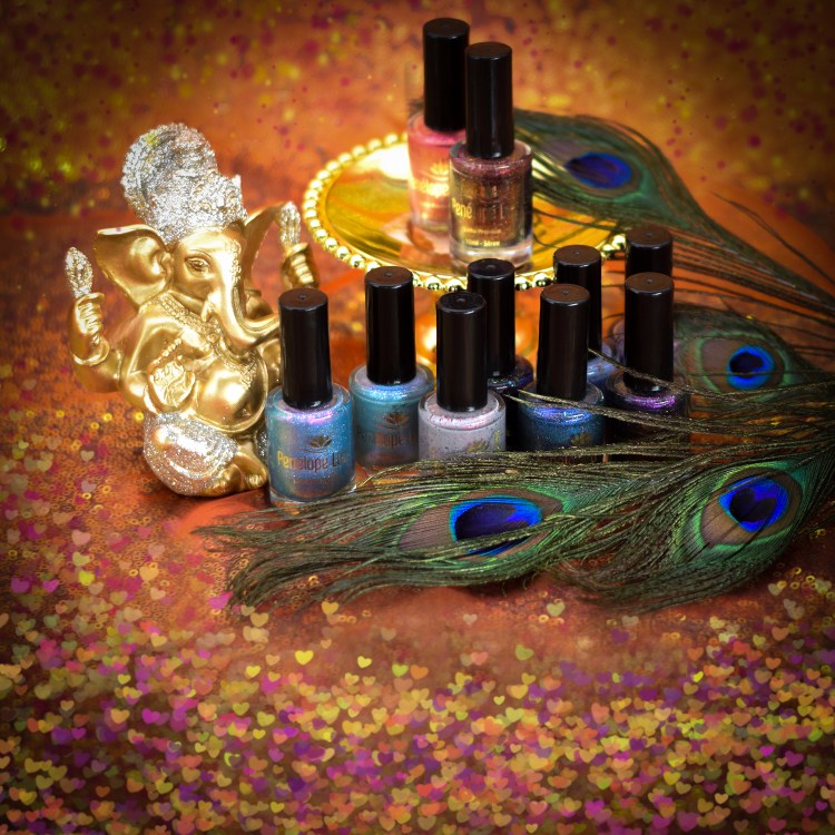 Eu adoro tanta coisa da Índia, que uso uma flor de lotus da logomarca e a arte das embalagens também são inspiradas nessa cultura. Me espanta que eu ainda não tinha feito uma coleção em homenagem! Fiz vários esmaltes com nomes que remetem à Índia, mas não uma coleção inteira. O dia chegou! ❤