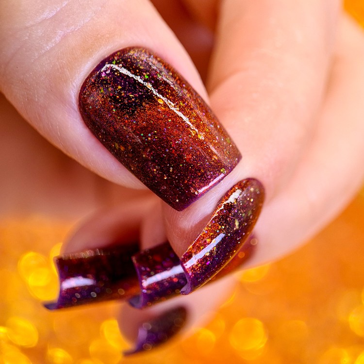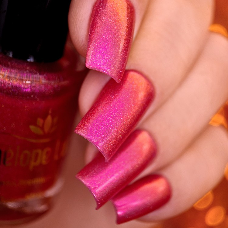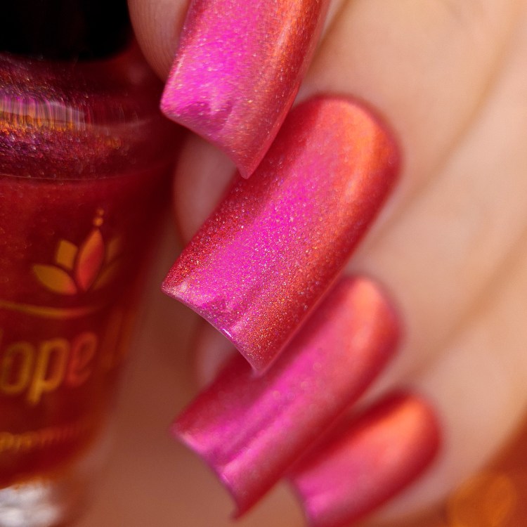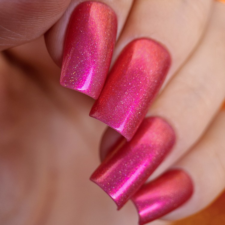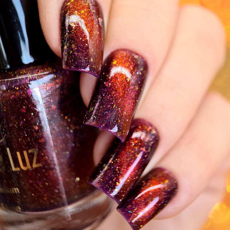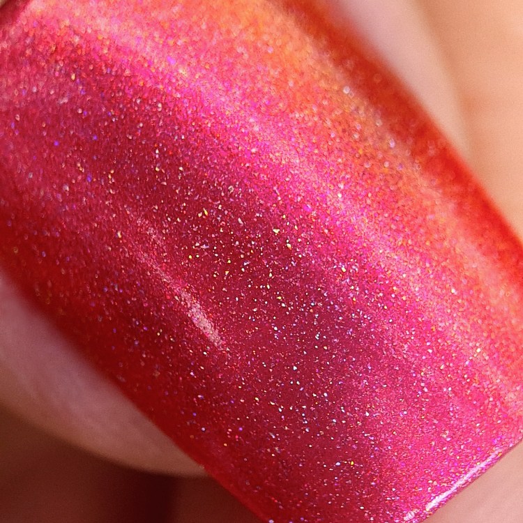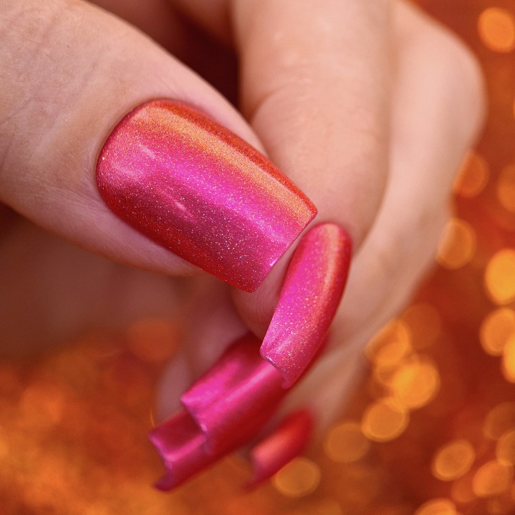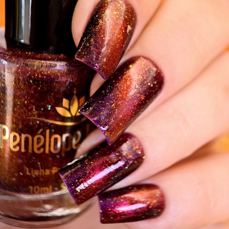 O primeiro se chama Diwali, em referência ao famoso e lindo festival indiano. O esmalte tem um tom coral vibrante com duochrome dourado/verde. Tem também um pigmento holográfico bem fininho para dar mais profundidade. ❤