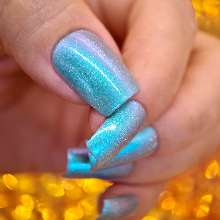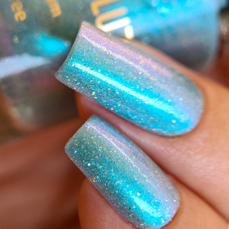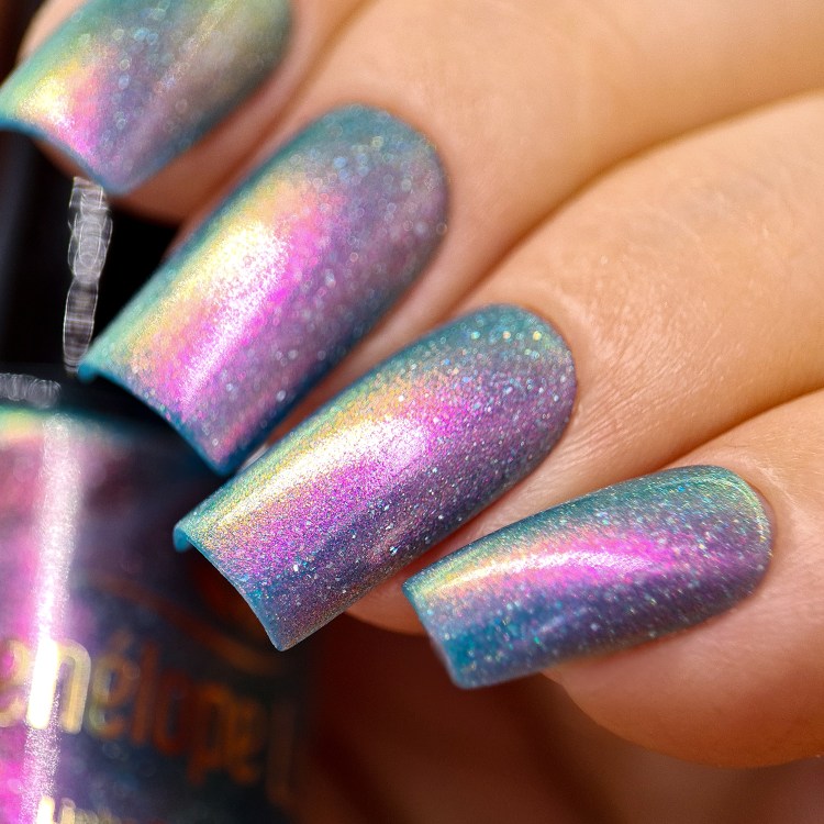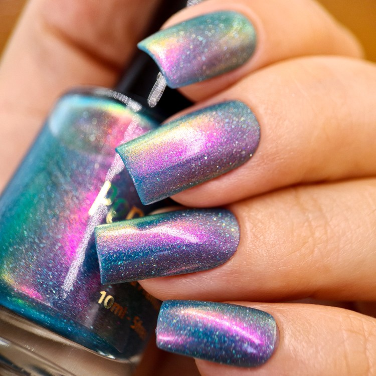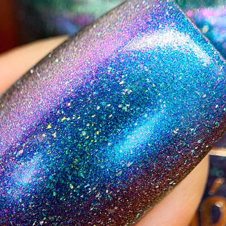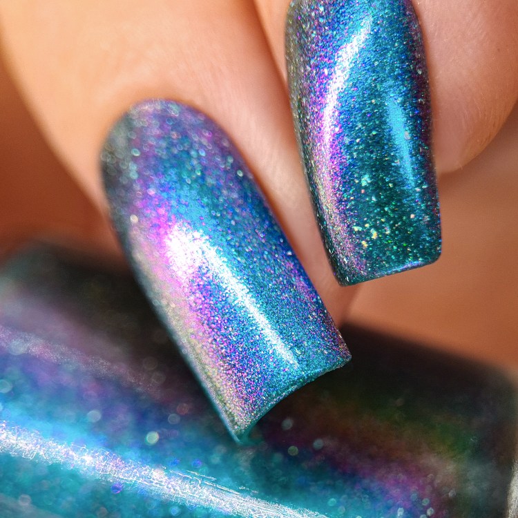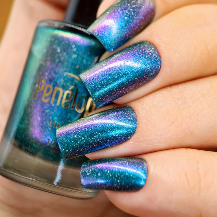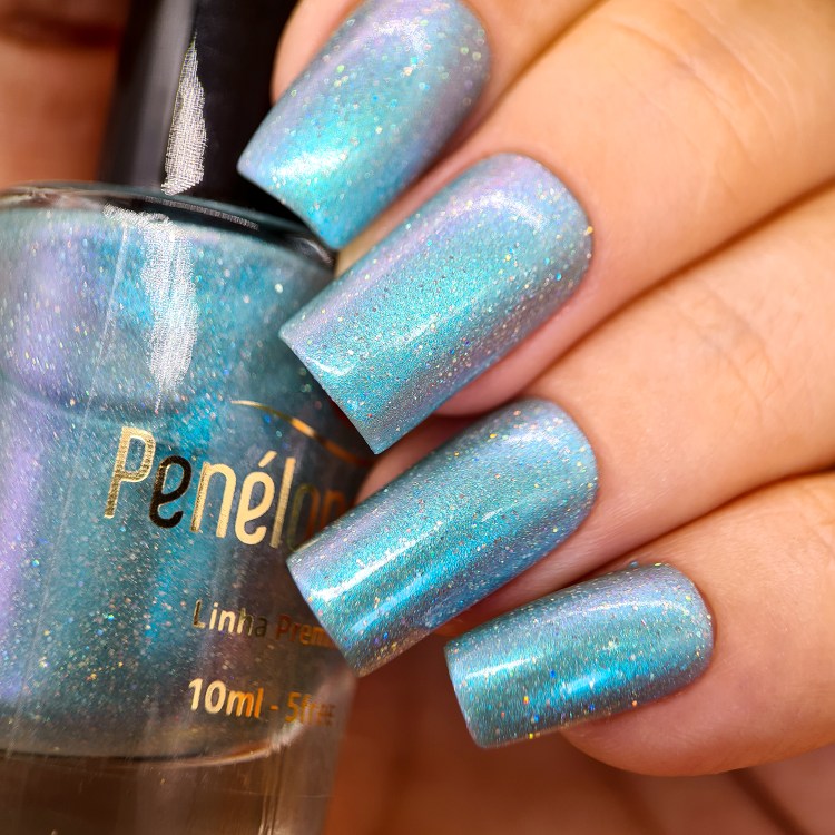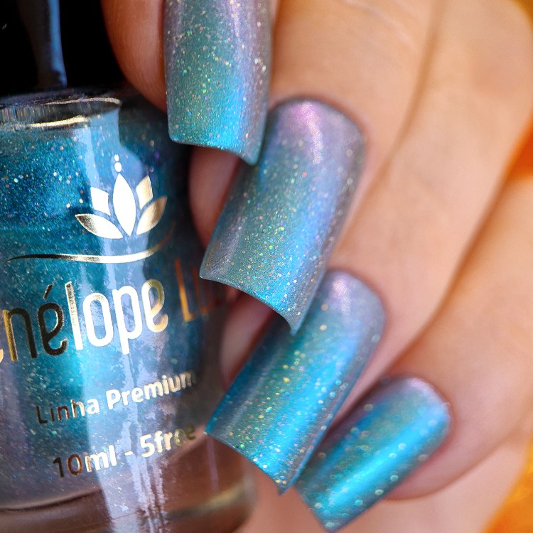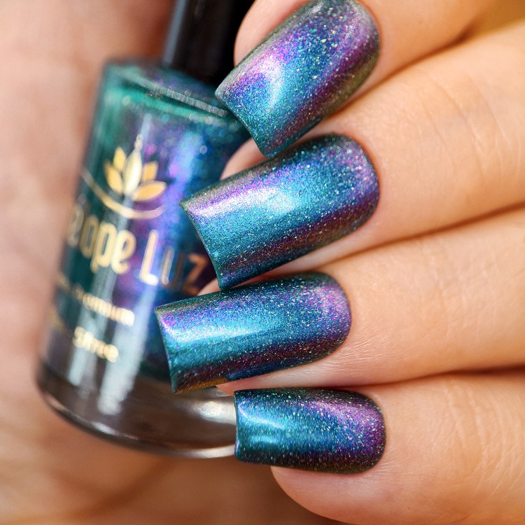 Agora temos o Vedas, que foi inspirado nas escrituras espiritualistas mais antigas que temos notícias, o Vedas, que surgiu na região da Índia há pelo menos 5 mil anos. O esmalte é um multichrome com base turquesa e pigmento aurora que varia do azul, roxo, dourado e verde. Tem também flakies holográficos de dois tamanhos para ter profundidade. ❤