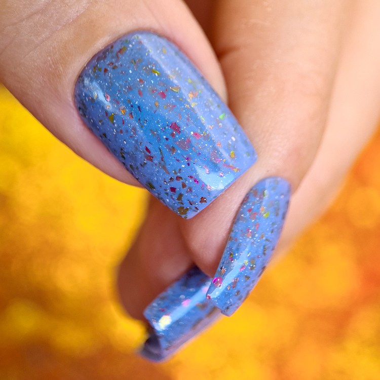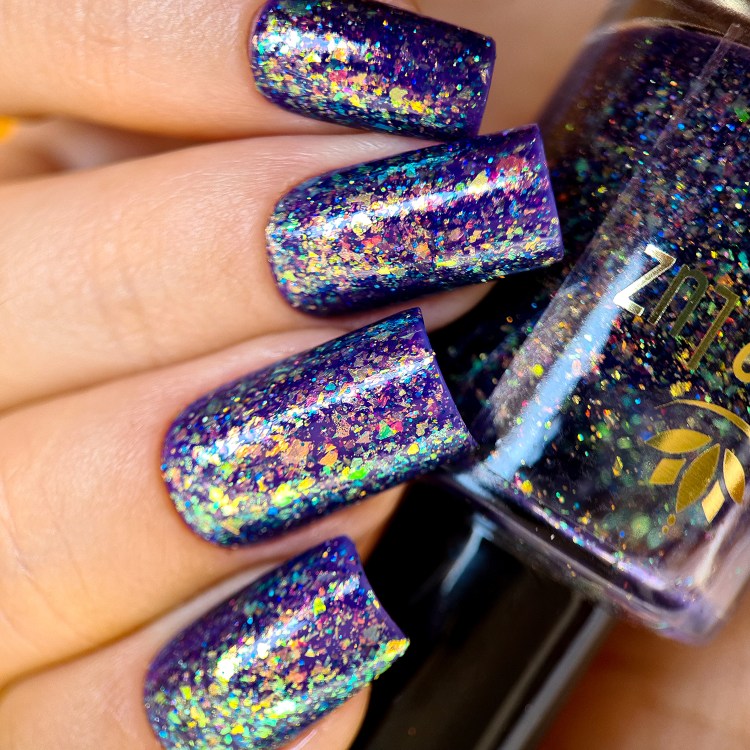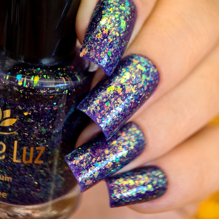 Agora vamos ao Krishna, que é em homenagem à um grande avatar do hinduísmo e meu favorito, ganhou meu coração nas passagens em que ele conversa com Arjuna na Bhagavad Gita. Não podia faltar um esmalte em sua homenagem. ❤ O esmalte tem a base azul puxando um pouco pro burble, flakies multichromes e holográficos.