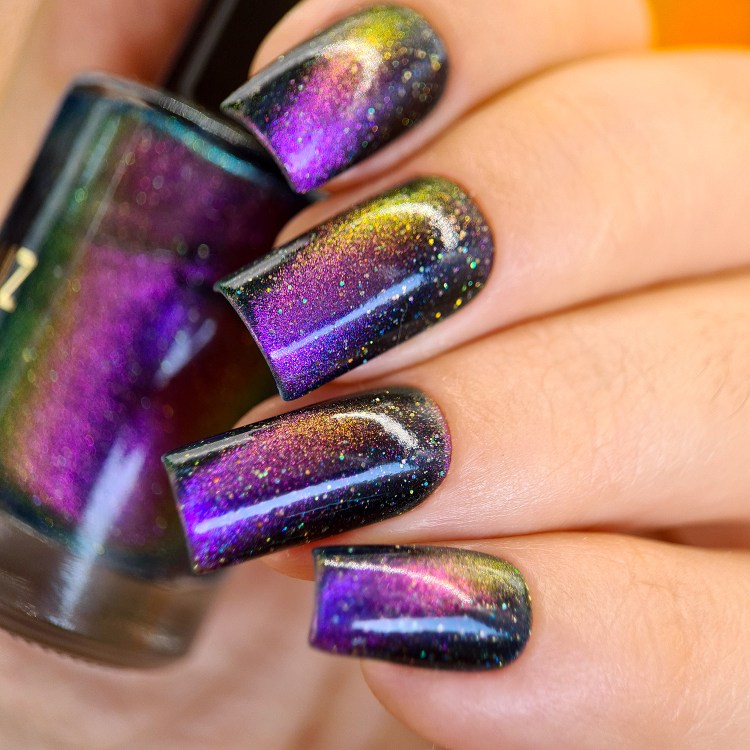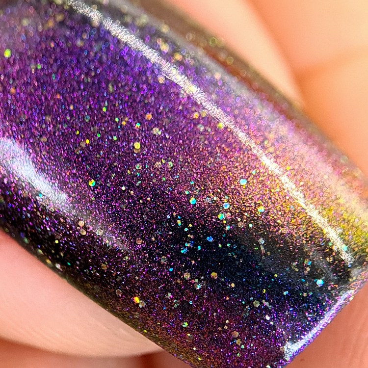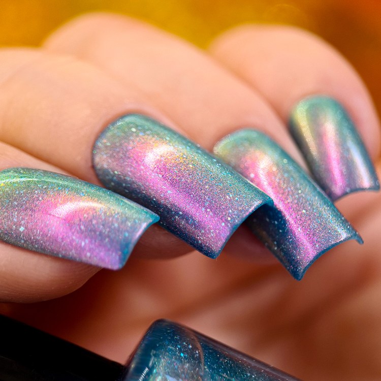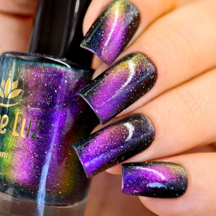 Por fim vamos conhecer o Yoga Sutra, em homenagem magnífica filosofia da Yoga, que tem ajudado milhares de pessoas, há milhares de anos! Ele é tem a base turquesa escura (que não consegui fotografar, ficou preta nas fotos) e pigmento magnético multichrome, que vai do roxo para o dourado e vere. Tem também um pouco de glitter galaxy dourado holo para dar profundidade.