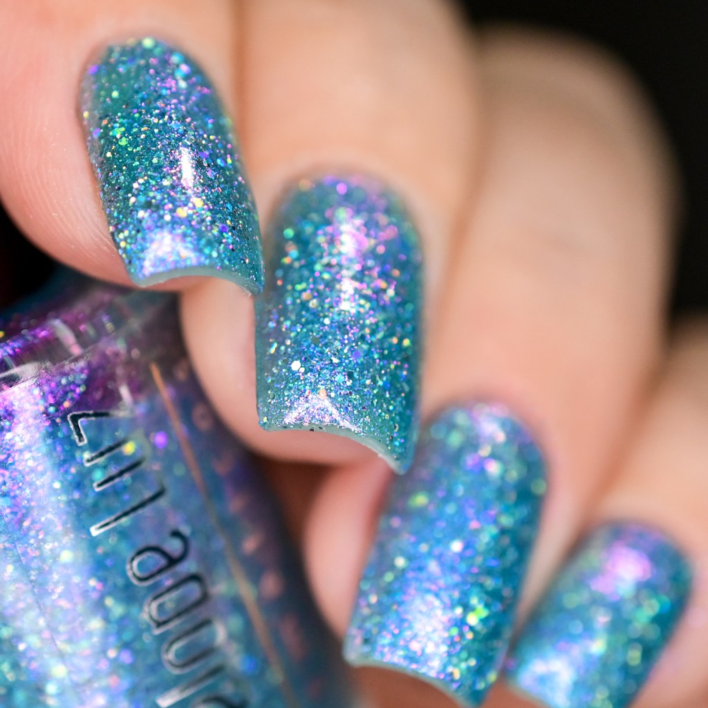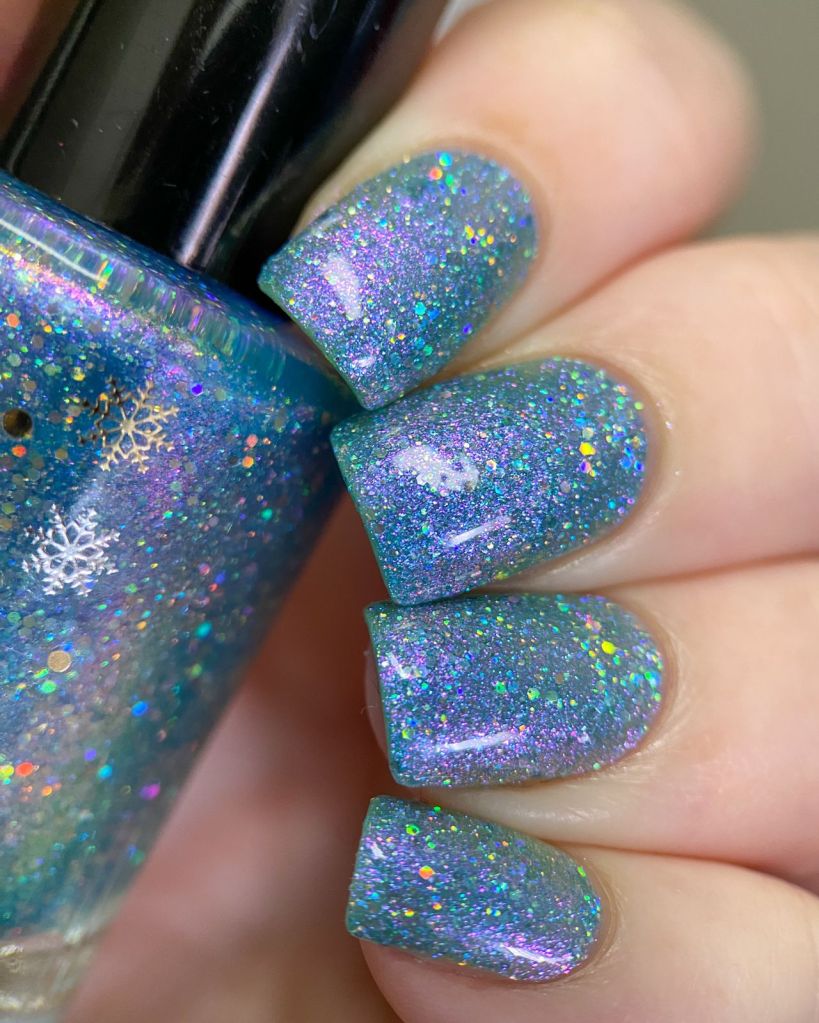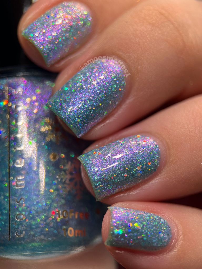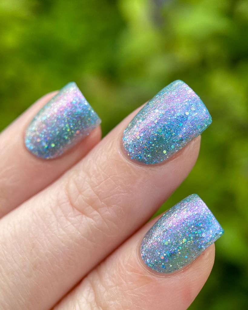 Agora vamos conhecer o Jingle Bell, um turquesa claro e vivo com aurora shimer roxo/dourado e glitter holográficos prata.