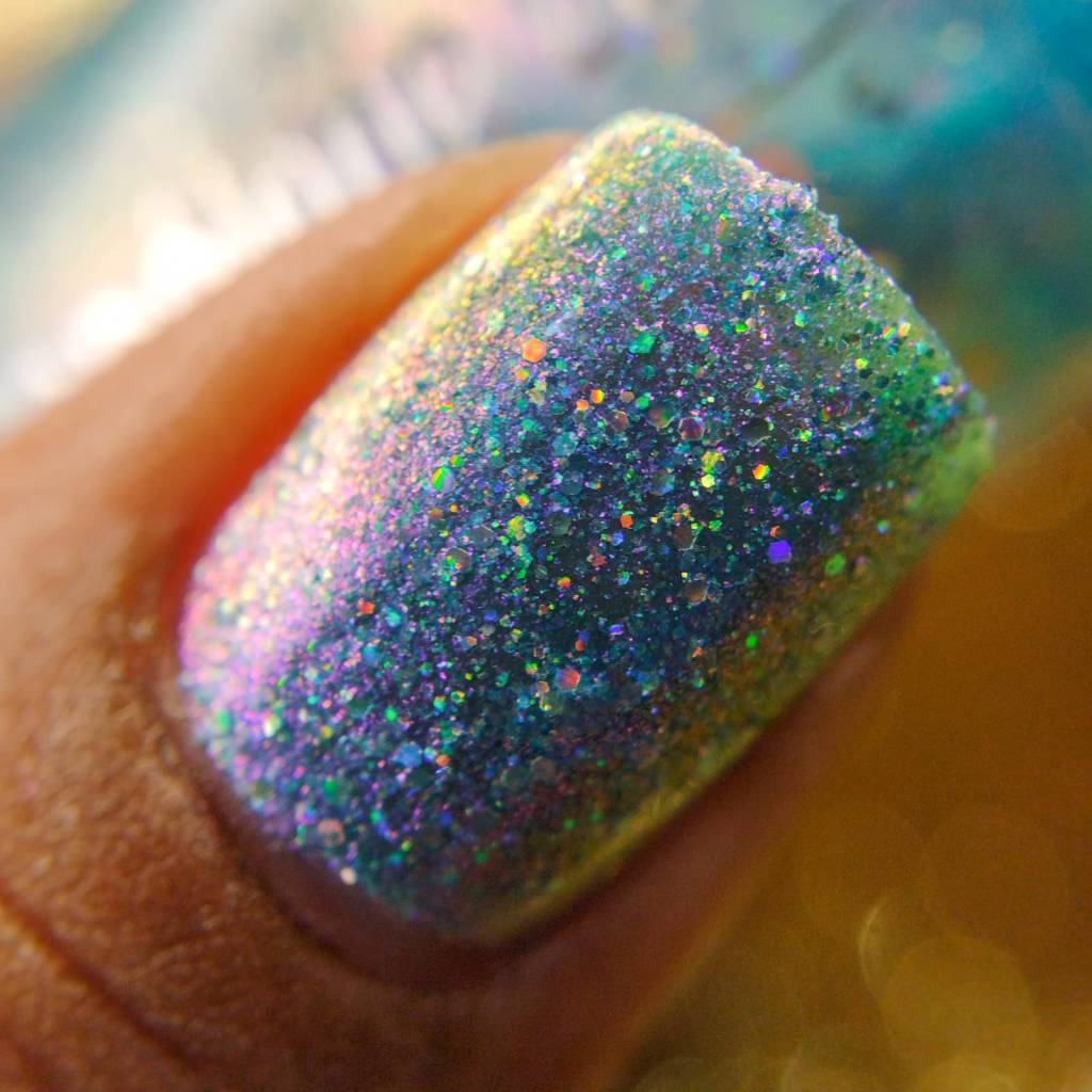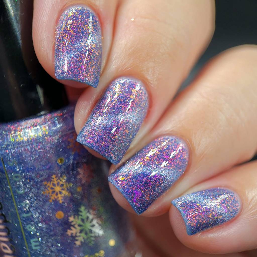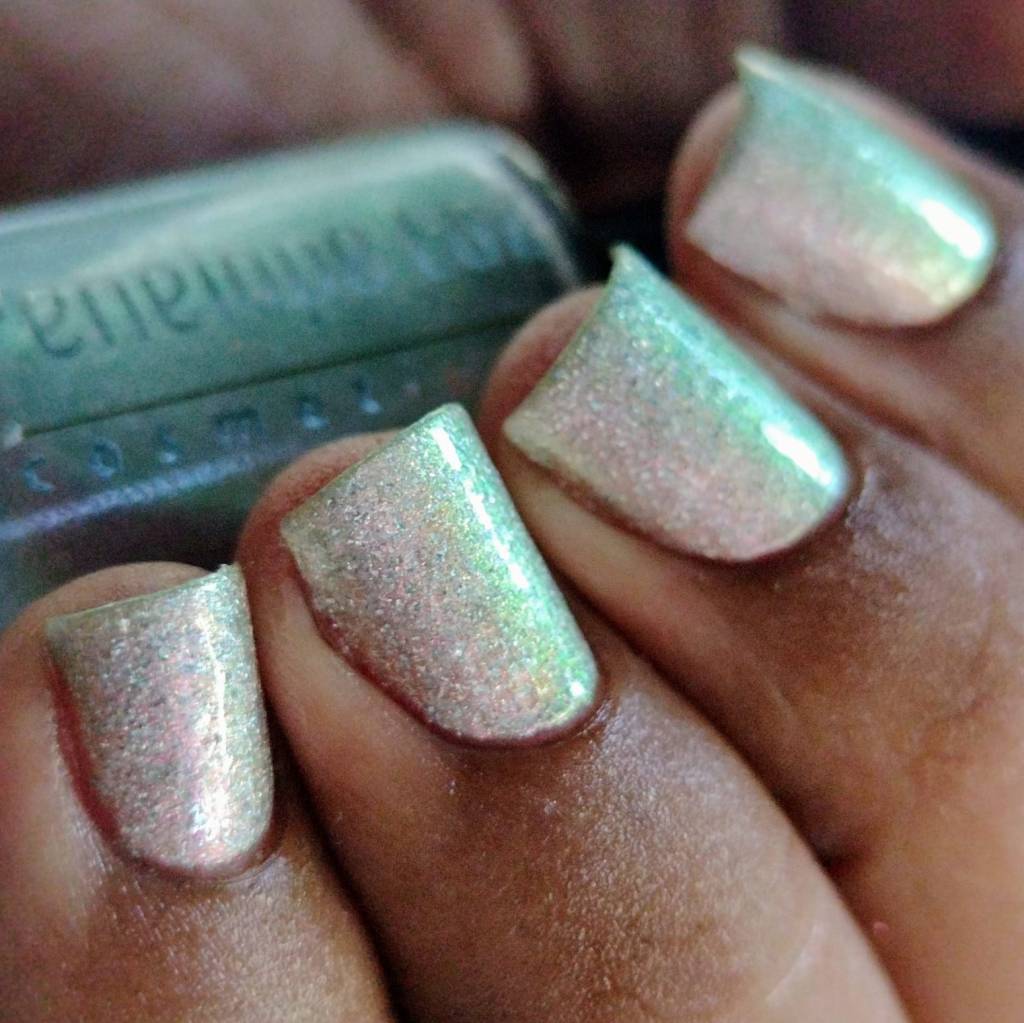 Agora vamos conhecer o Jingle Bell, um turquesa claro e vivo com aurora shimer roxo/dourado e glitter holográficos prata.