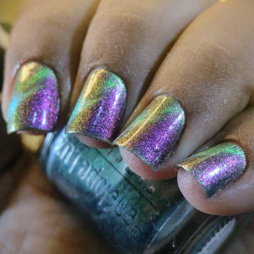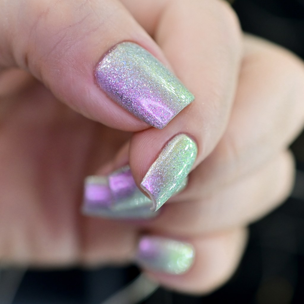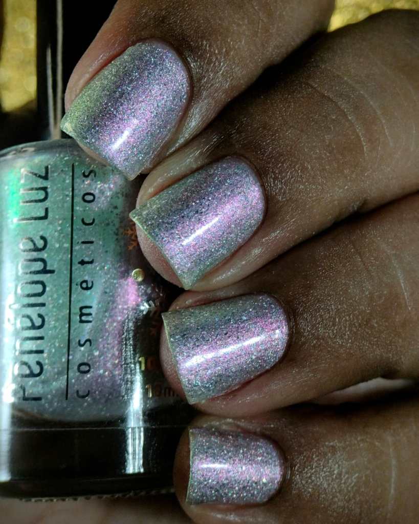 Agora vamos conhecer o Shining Star, um glitter prata holo com aurora sparkle que vai do vermelho/roxo para o verde/dourado.