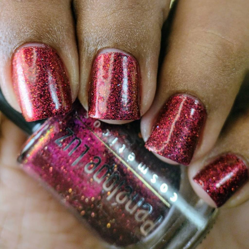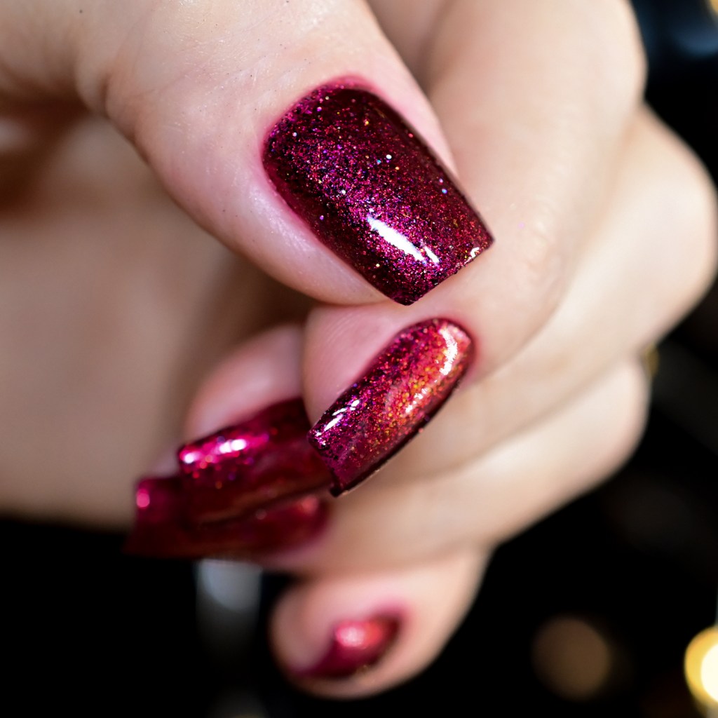 Agora vamos conhecer o Season of Love, que é um vermelho sangue com microflakes (red/black) e glitter holo dourado. Outro vermelho difícil de fotografar a cor, nas minhas fotos e nas da Carol está mais fiel, ele é bem fechado.