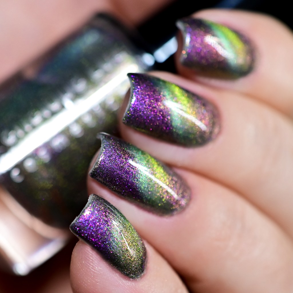 Agora vamos conhecer o Under the Tree, um magnético verde vivo com fundo roxo/rosa/dourado. Esse esmalte está muito lindo e mutante! Uma árvore de Natal cheia de presentes coloridos embaixo! ❤