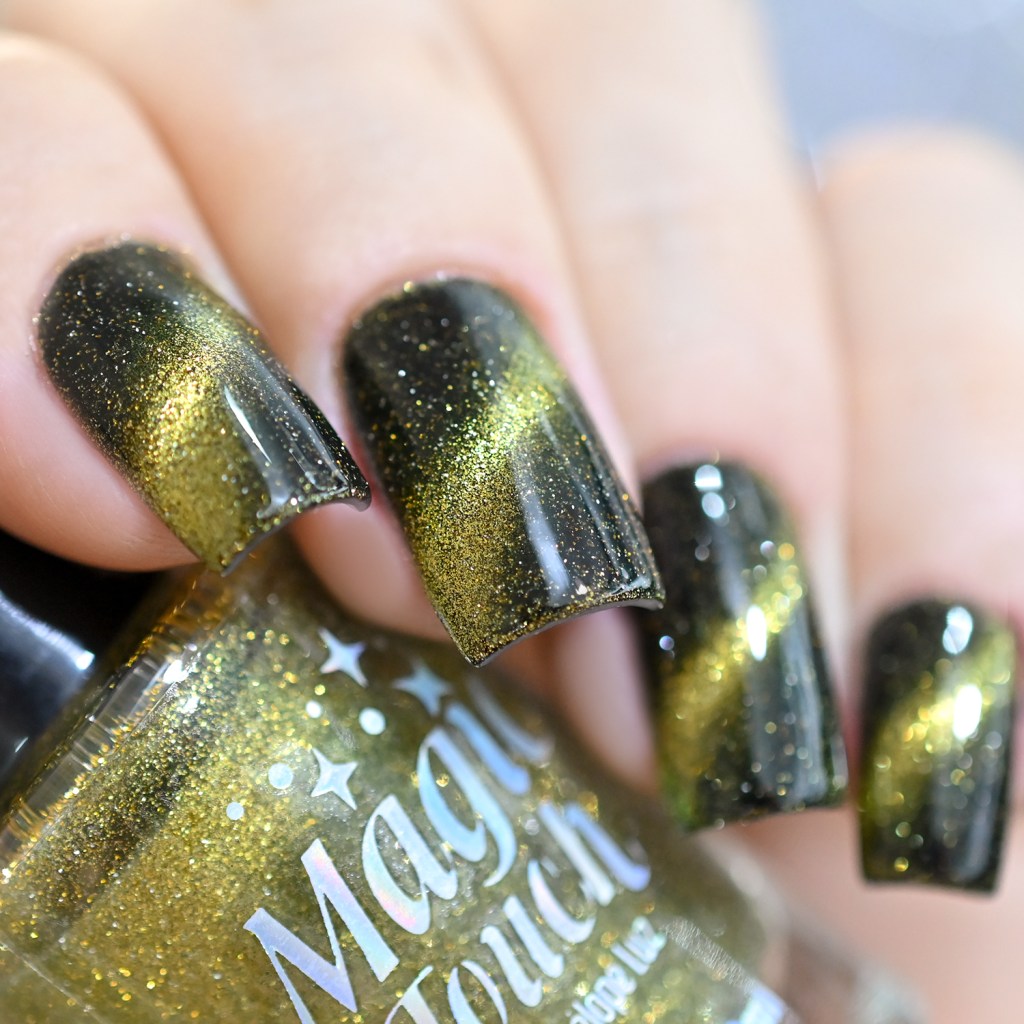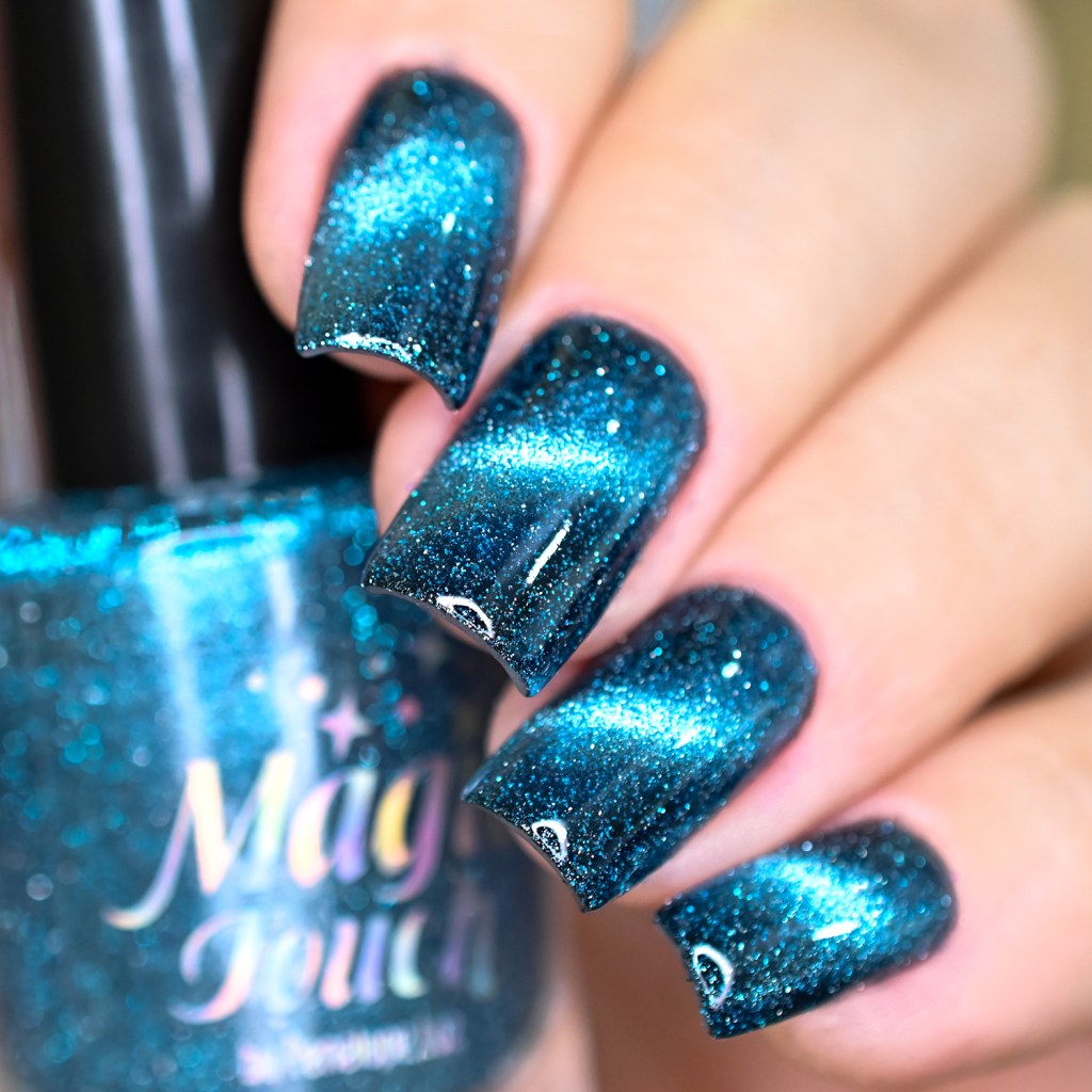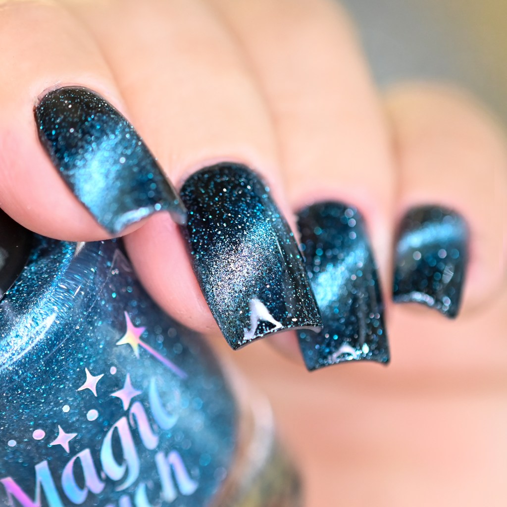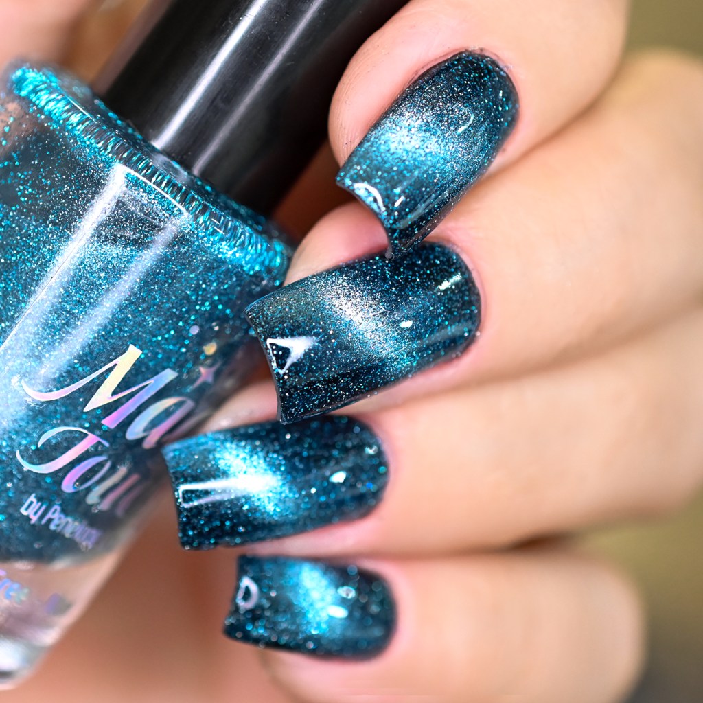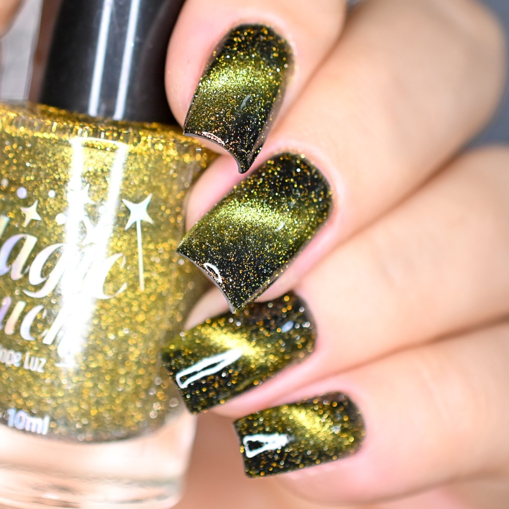 Esse pigmento magnético é 5D, tem o efeito bem forte, realmente lindo! São como aquele prata lindo que uso no Cloudy Day, só que coloridos! Todos estão com uma camada de extra-brilho efeito gel da Risque. Não usei o Over The Glitter porque a quantidade de glitter refletivo é pequena, para que ele não acabasse sendo o protagonista, e de fato tivéssemos os dois acabamentos dividindo harmoniosamente o reinado!