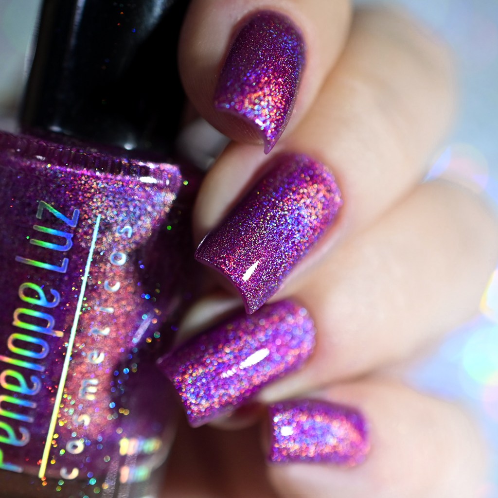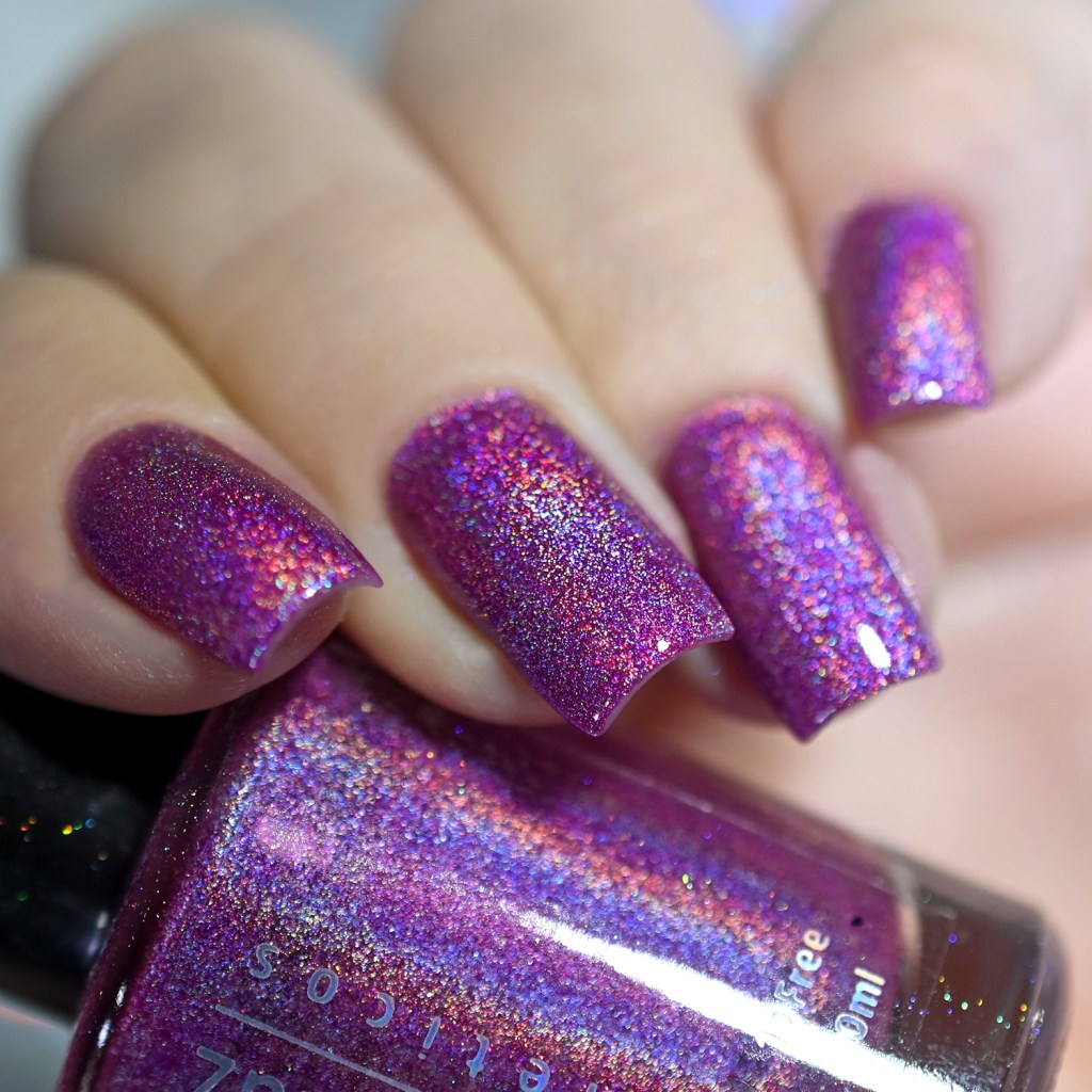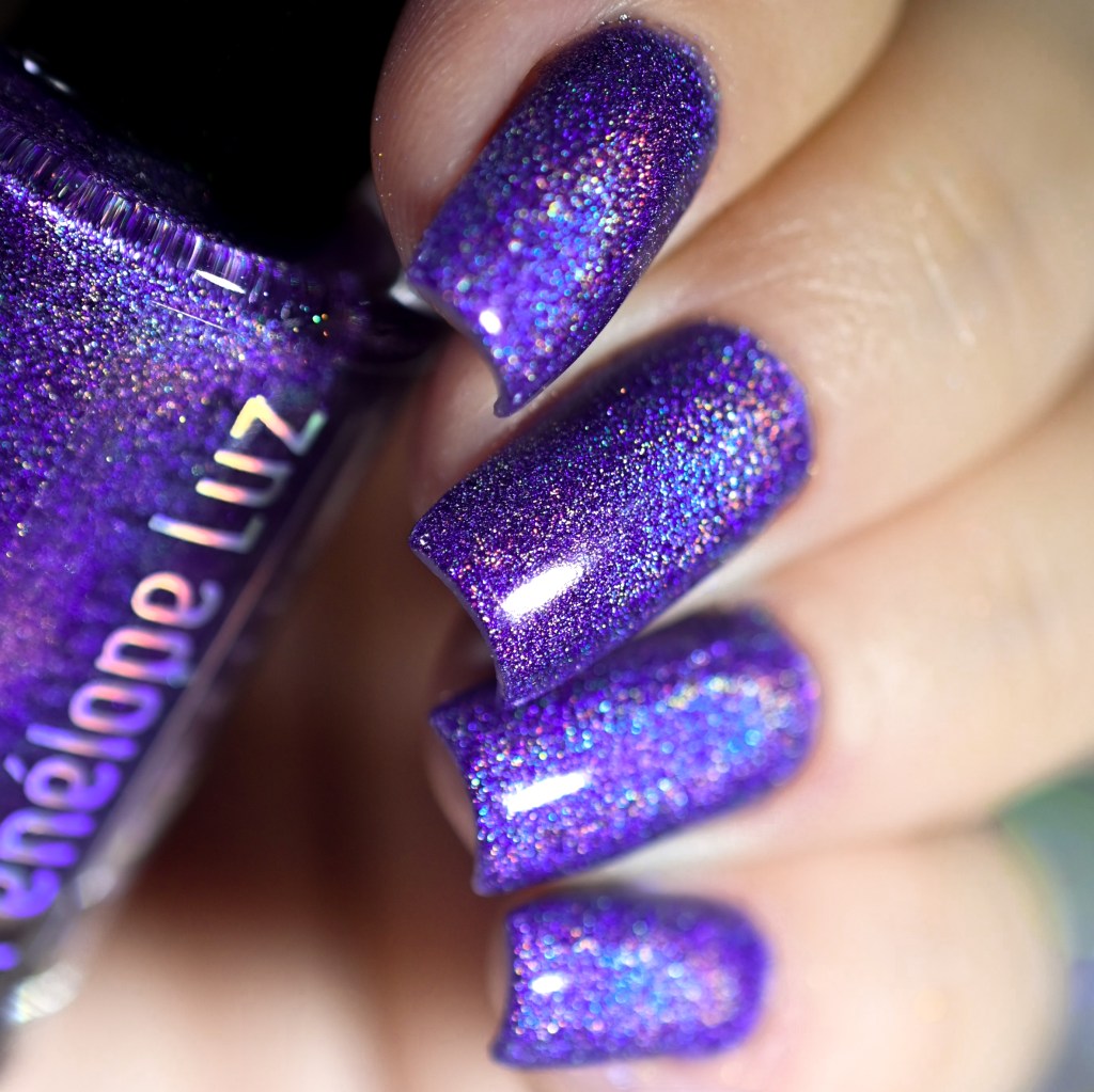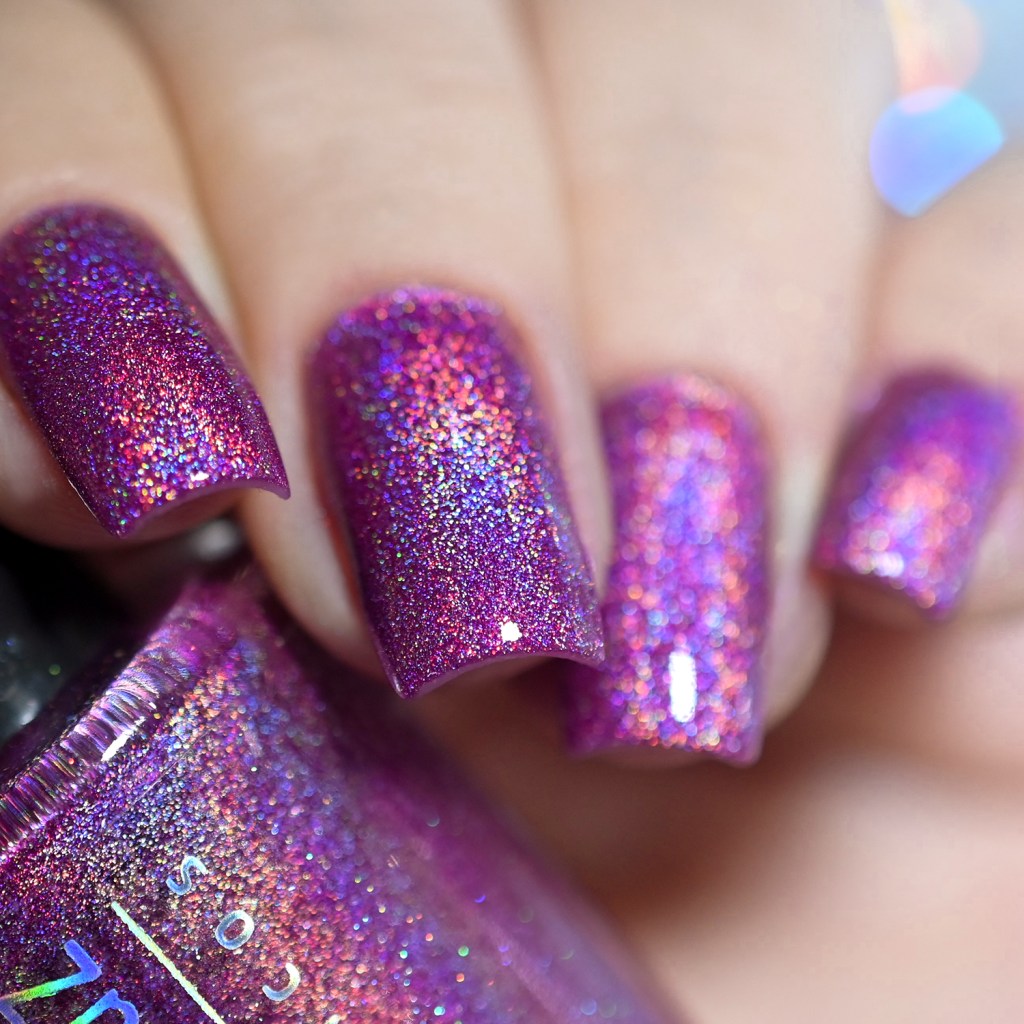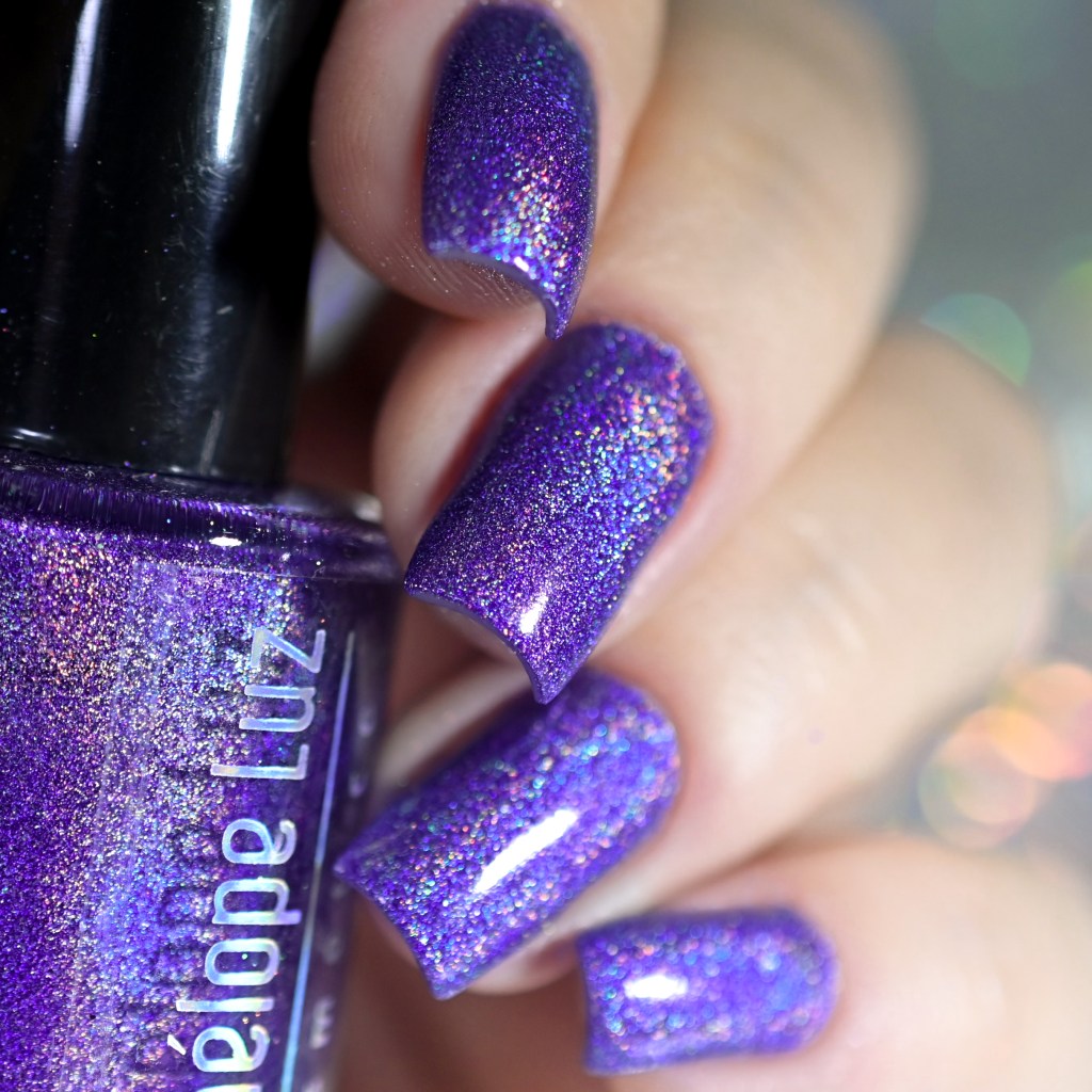 Agora vamos conhecer o Violet, que é um roxinho lindo demais! Quando usarem ele, se quiserem manter o efeito holo bem forte, evitem extra-brilho. Mas se quiserem ele ainda mais vibrante, podem se jogar no extra brilho! Esse é daqueles pigmentos que alteram com extra brilho. O bom é que temos duas versões maravilhosas no mesmo esmaltes ❤