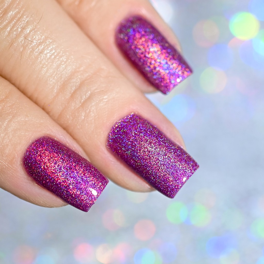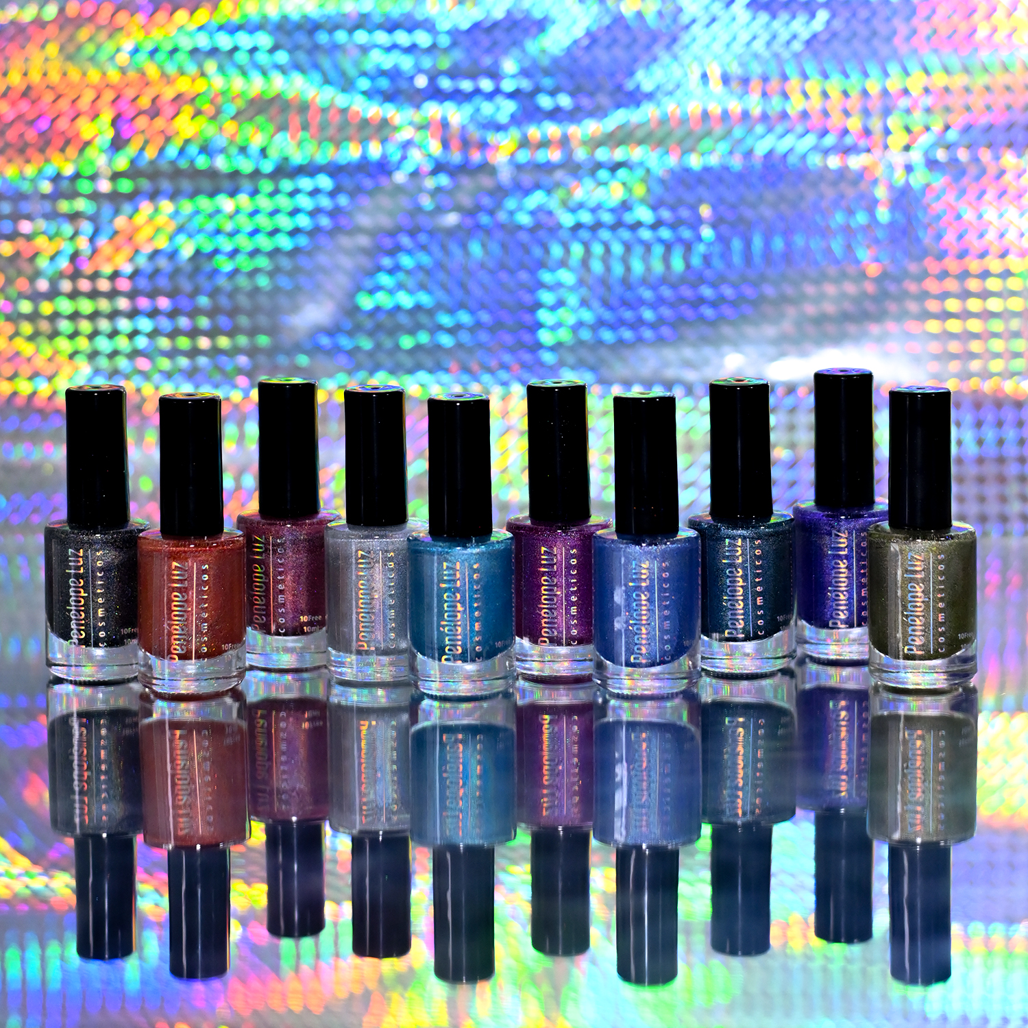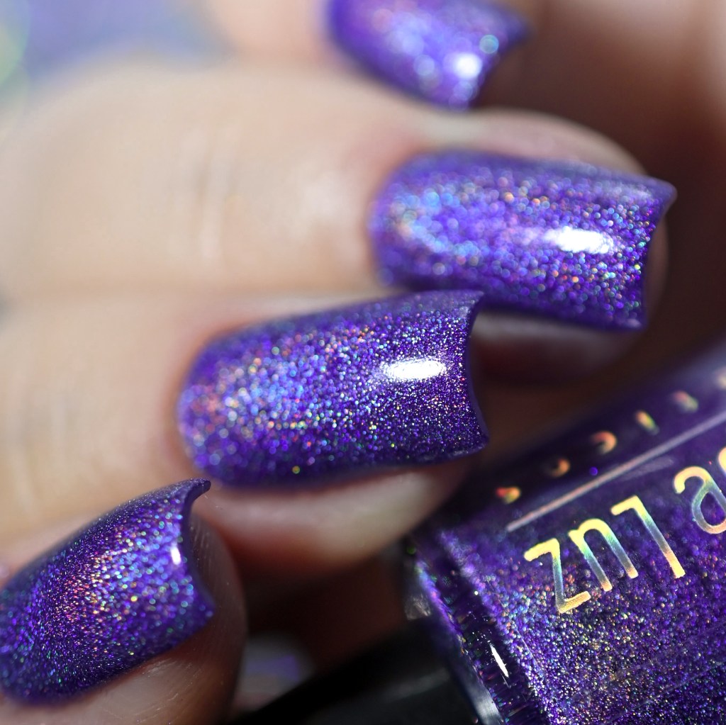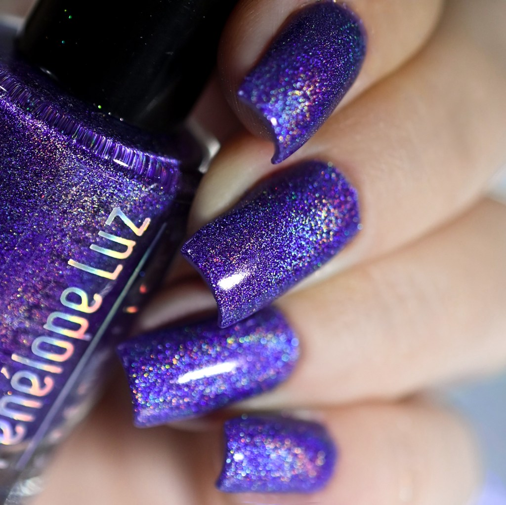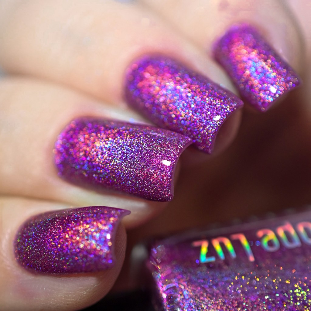 Agora vamos conhecer o Violet, que é um roxinho lindo demais! Quando usarem ele, se quiserem manter o efeito holo bem forte, evitem extra-brilho. Mas se quiserem ele ainda mais vibrante, podem se jogar no extra brilho! Esse é daqueles pigmentos que alteram com extra brilho. O bom é que temos duas versões maravilhosas no mesmo esmaltes ❤