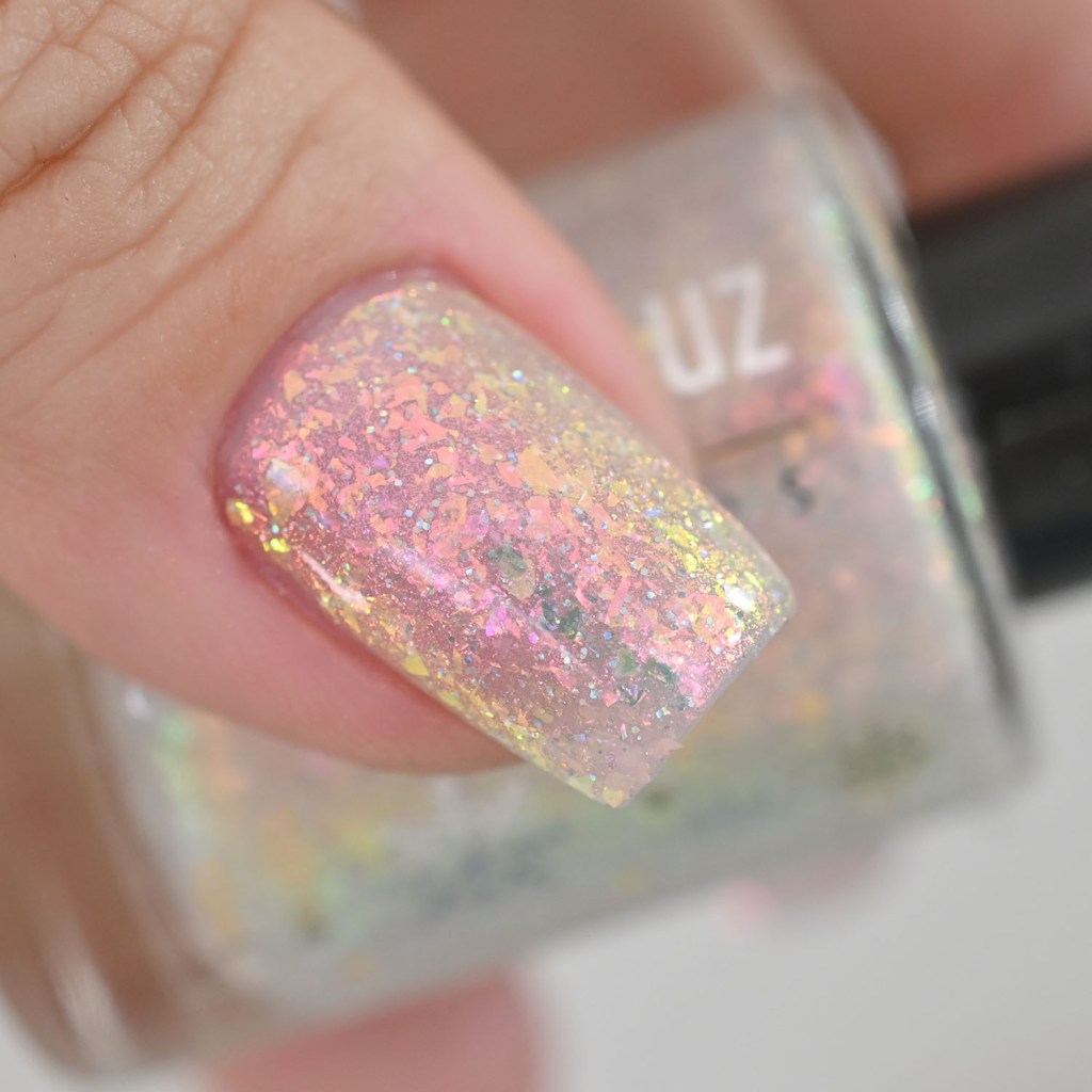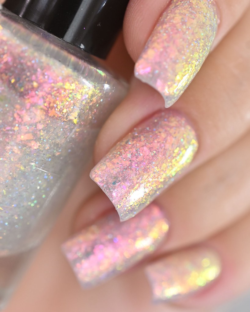 Vamos conhecer as cores! Primeiro vamos ao Be Grateful, que é um flake iridescente com um pouco de aurora e glitter prata holo, lindíssimo!