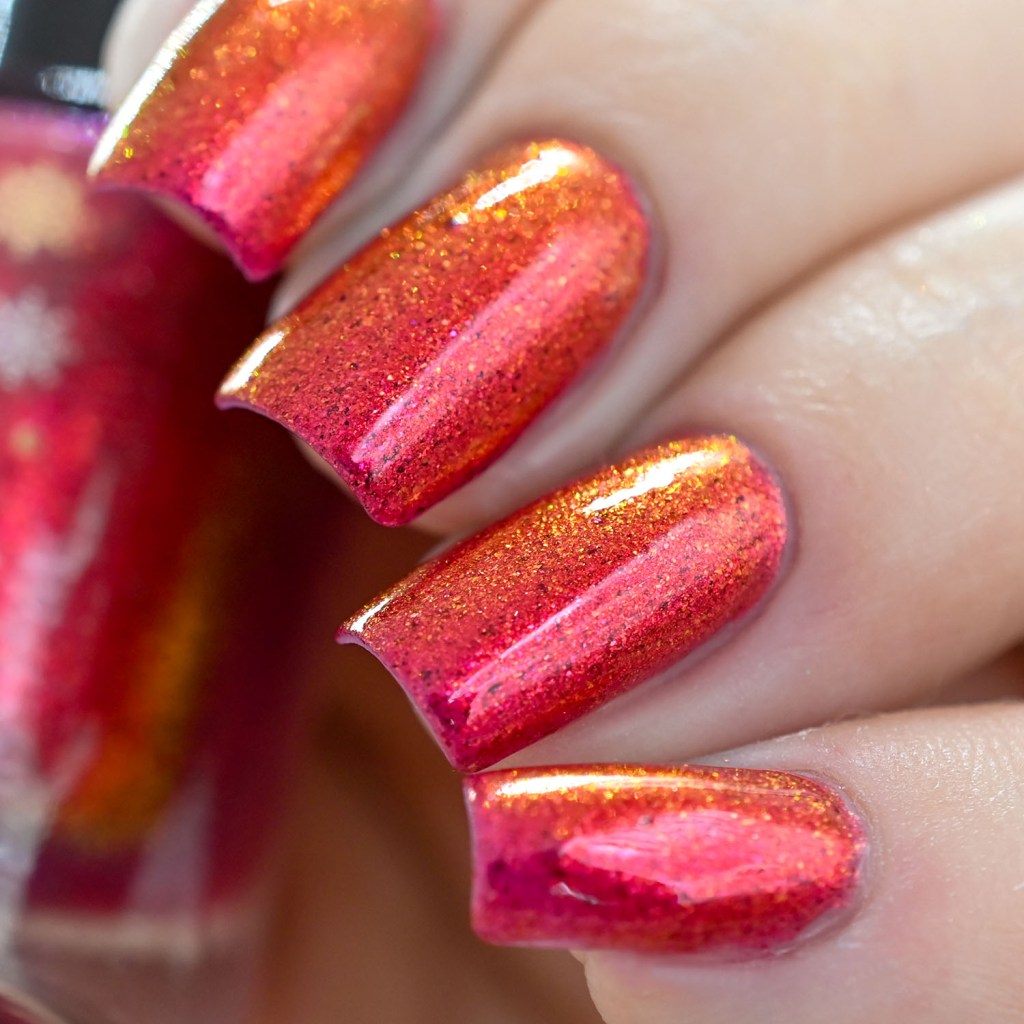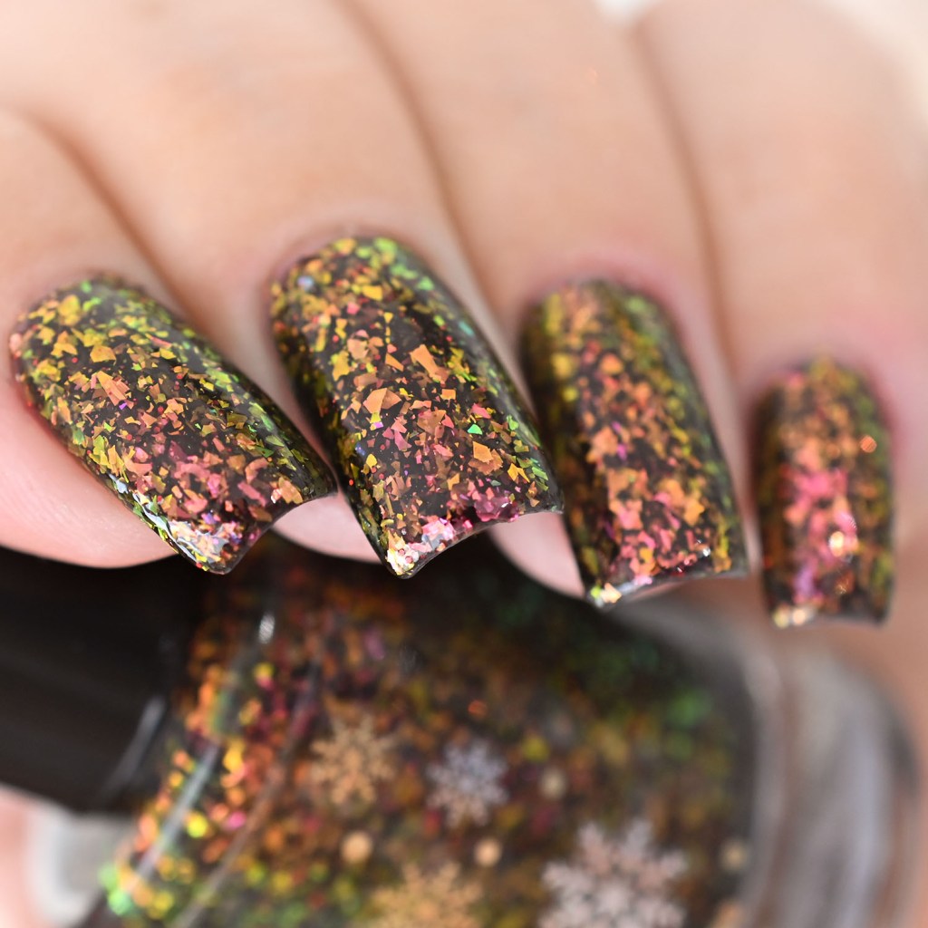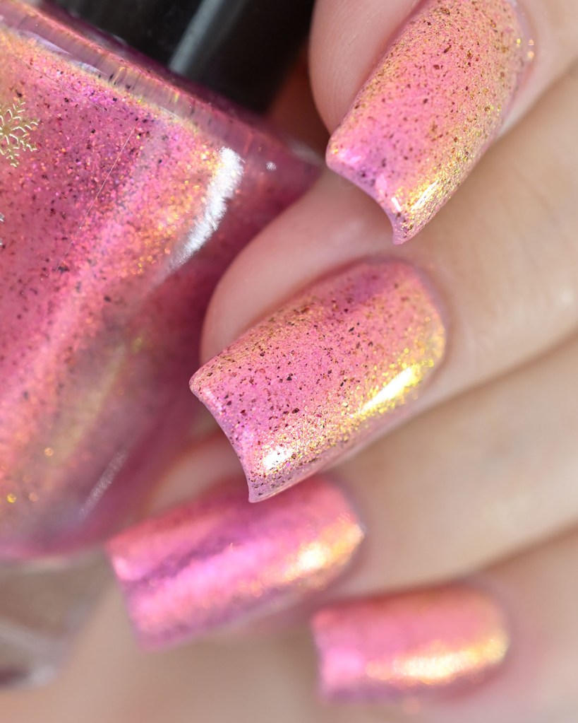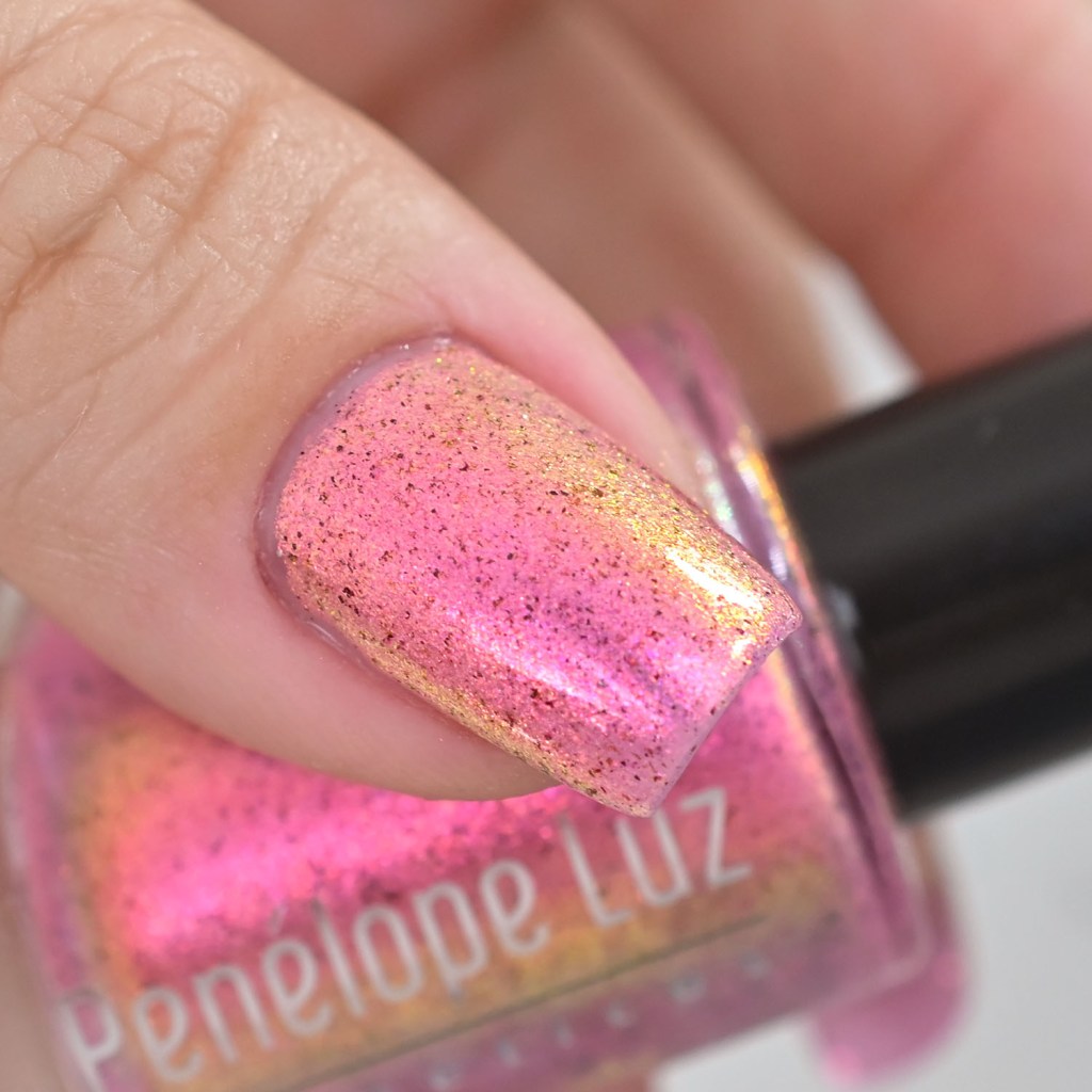 Agora vamos ao Be Kind, que é um aurora salmão/dourado lindo, com micro flakies pretos que dão todo um charme!