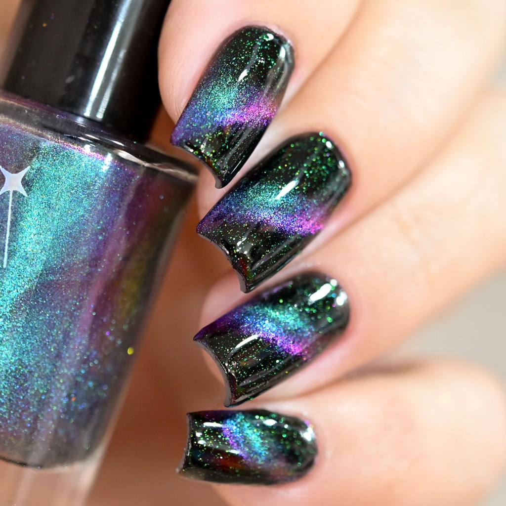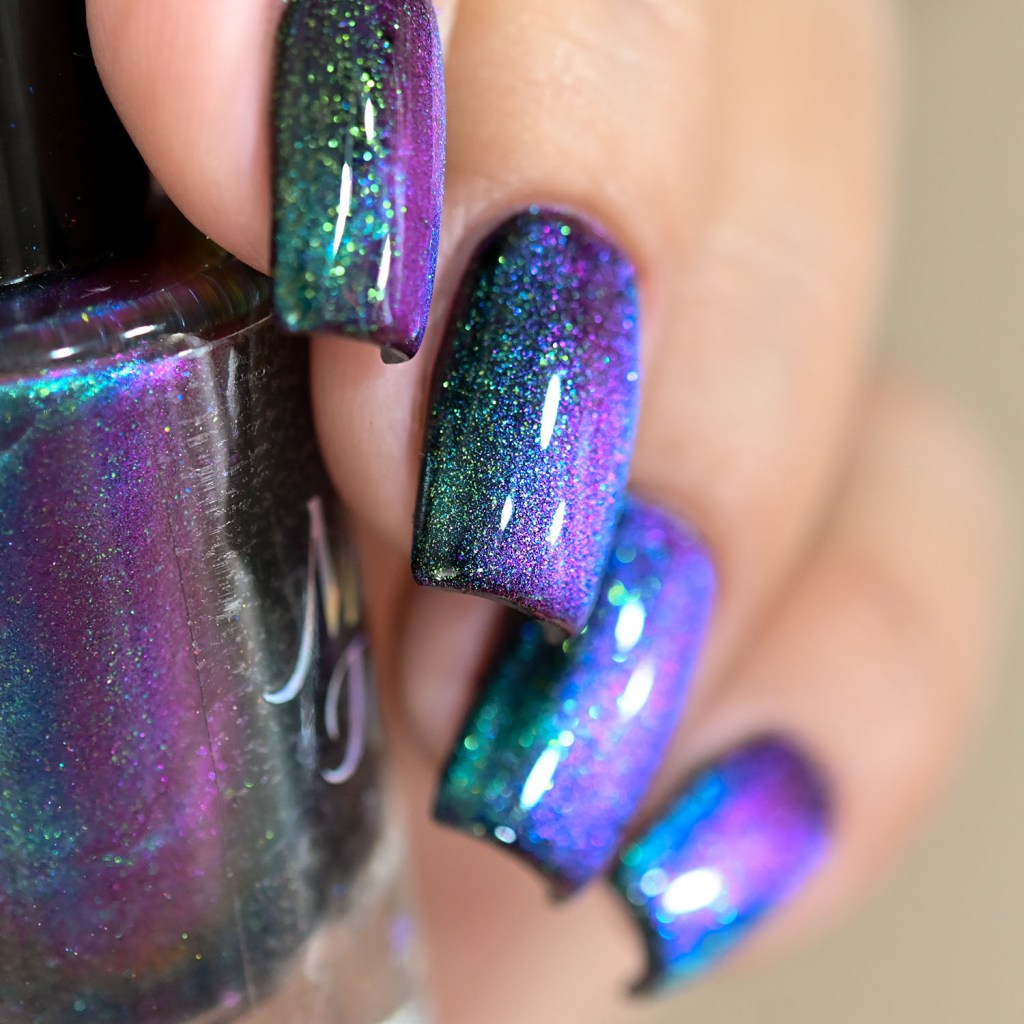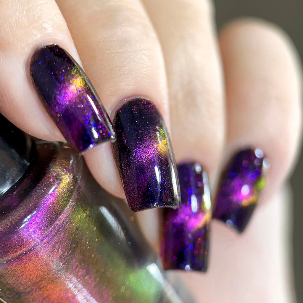 Vamos começar pelo Mystic Topaz, que é uma explosão de cores! O magnético é nos tons de turquesa e roxo, com um pouco de micro flakes verdes.