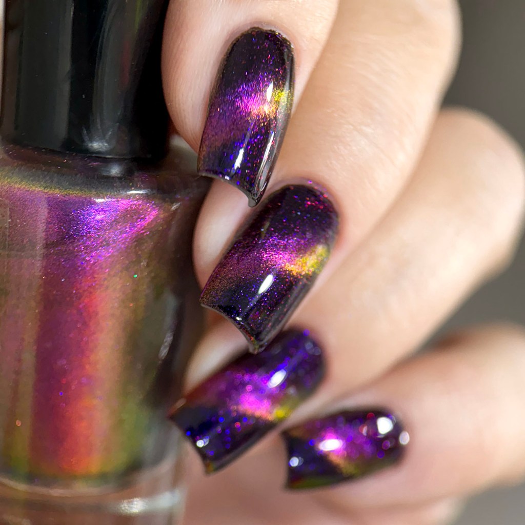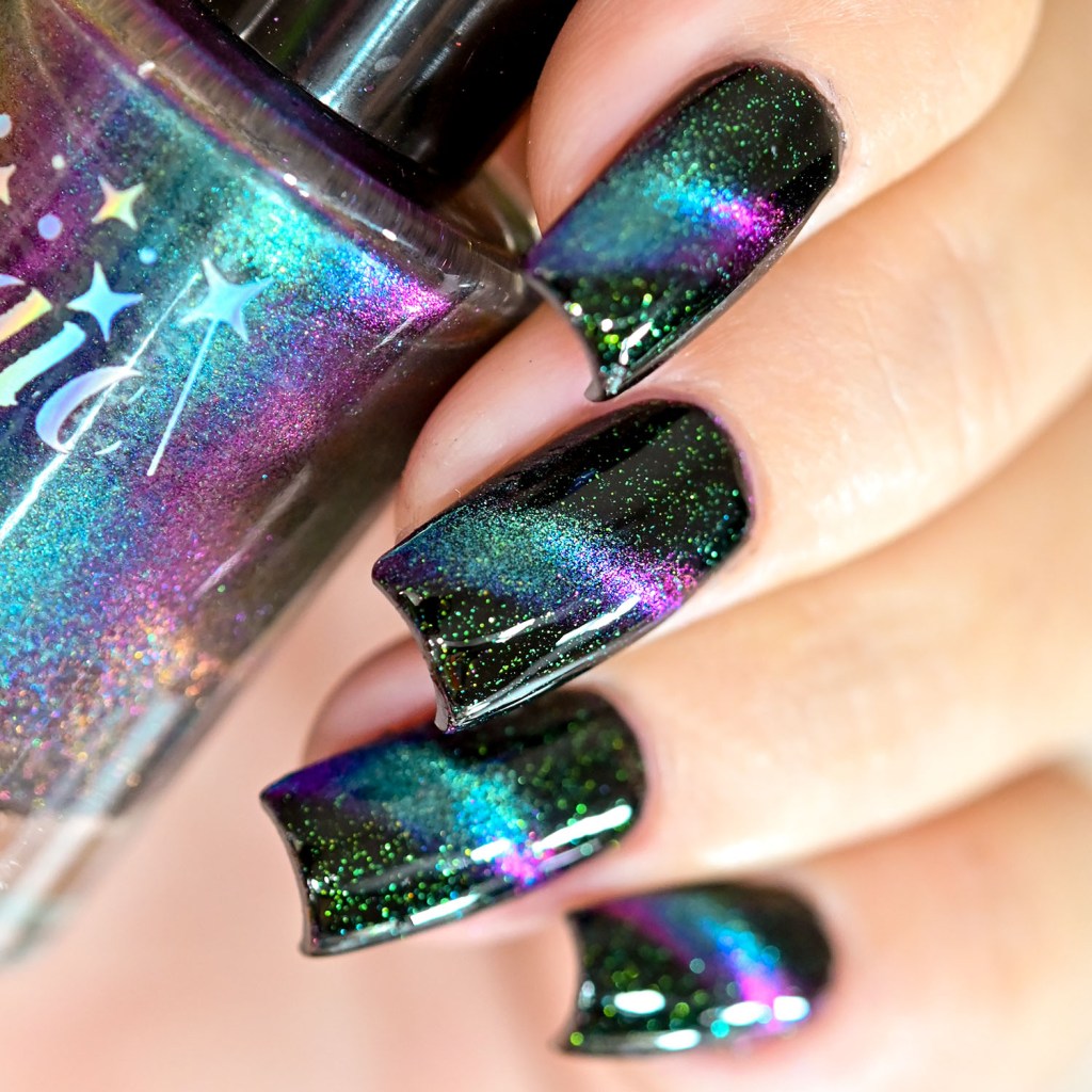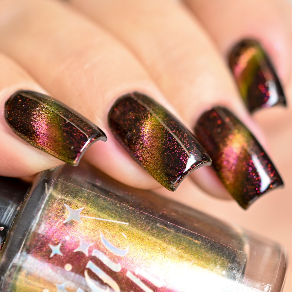 Vamos começar pelo Mystic Topaz, que é uma explosão de cores! O magnético é nos tons de turquesa e roxo, com um pouco de micro flakes verdes.