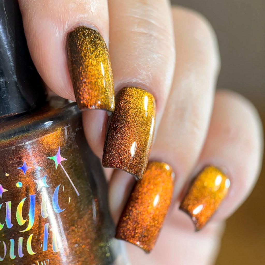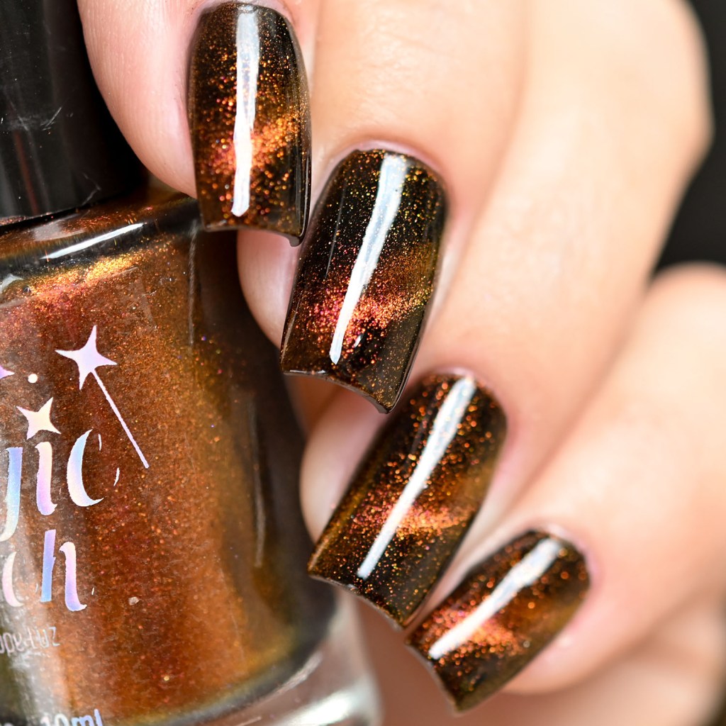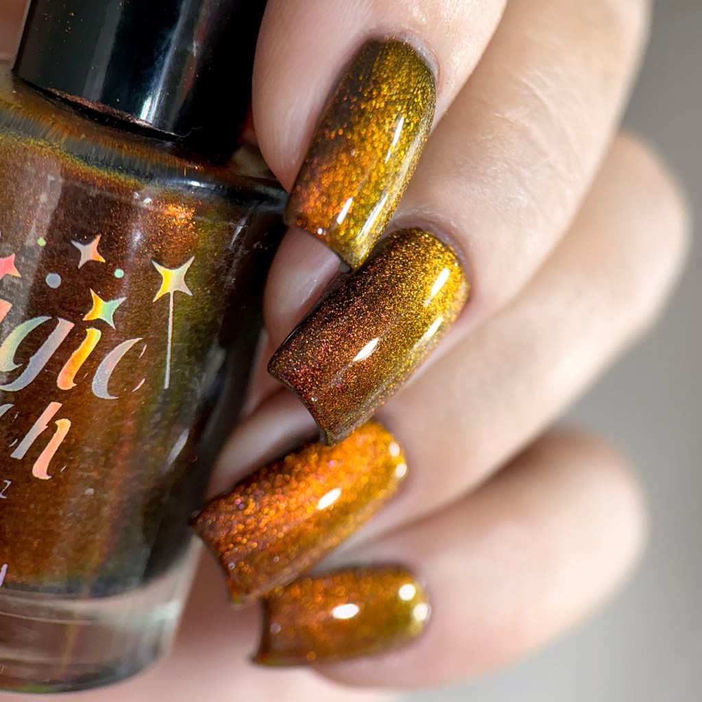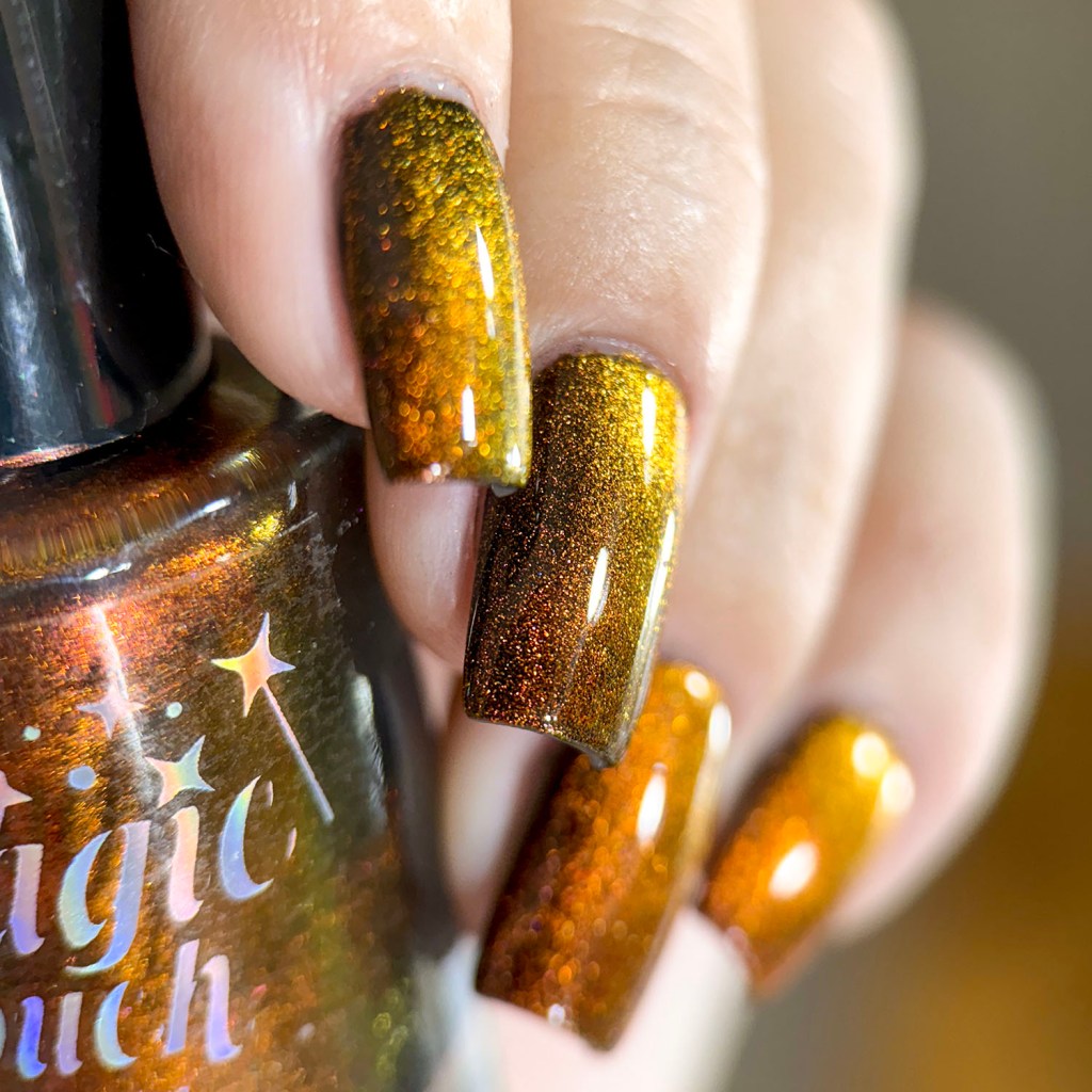 Agora vamos ao Fire Citrine, que é um magnético com tons de laranja e dourado, e um pouco de flakes laranjas.